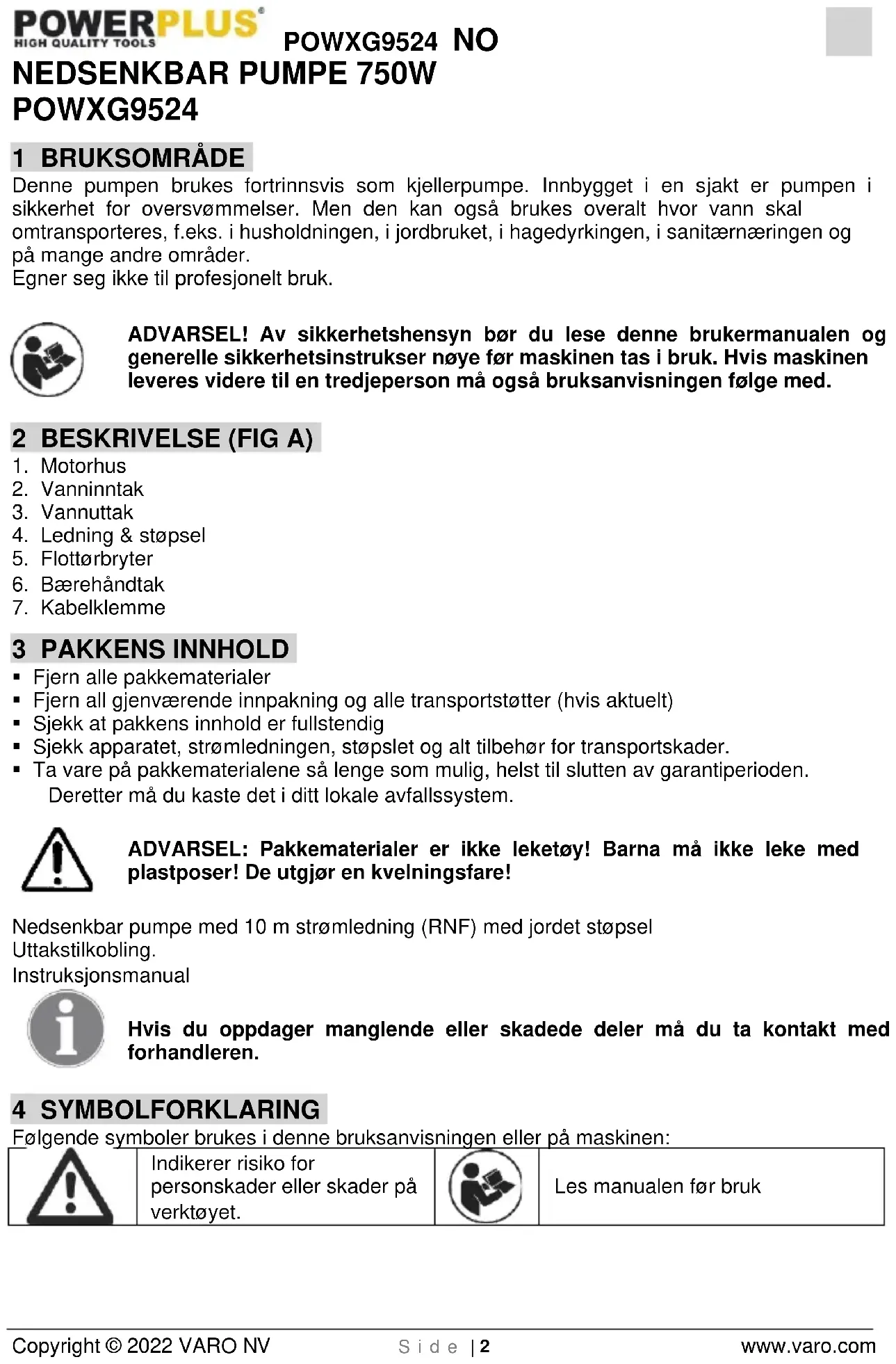 - stasjonært med fleksibel slangeledning Pass på! Under installasjonen må det sørges for at pumpen aldri henger fritt fra trykkledningen eller monteres på strømkabelen. Den nedsenkbare motorpumpen må henges etter bærehåndtaket som følger med, eller legges i bunnen af sjakten. For at pumpen skal sikres en god funksjon må sjaktbunnen holdes fri for slam og andre forurensninger. Ved for lav vannstand kan slammet i sjaktbunnen tørke inn og pumpen må hindres fra å starte. Derfor er det nødvendigt at den nedsenkbare motorpumpene sjekkes regelmessig (foreta startforsøk). Flottørbryteren må stilles inn slik at en igangkjøring til enhver tid er mulig. Råd Pumpesjakten bør minst ha dimensjonen 40 x 40 x 50 cm, slik at flottørbryteren kan bevege seg fritt. Nettilkopling Den nye dykkermotorpumpen har allerede et jordingskontaktstøpsel. Pumpen er bestemt for tilkopling til en jordingsstikkontakt 230 V - 50 Hz. Vær sikker på at stikkontakten er sterk nok (minst 6 A), og i perfekt stand. Før pumpestøpselet i stikkontakten og pumpen er klar til start.POWXG9524 NO Copyright © 2022 VARO NV S i d e | 4 www.varo.com Råd! Dersom nettledningen eller støpselet er kommet til skade pga. ytre påvirkning, kan kabelen ikke repareres! Kabelen må skiftes ut. 8 IGANGKJØRING Etter å ha lest installasjons- og bruksanvisningen nøye, kan pumpen settes i drift under følgende betingelser: