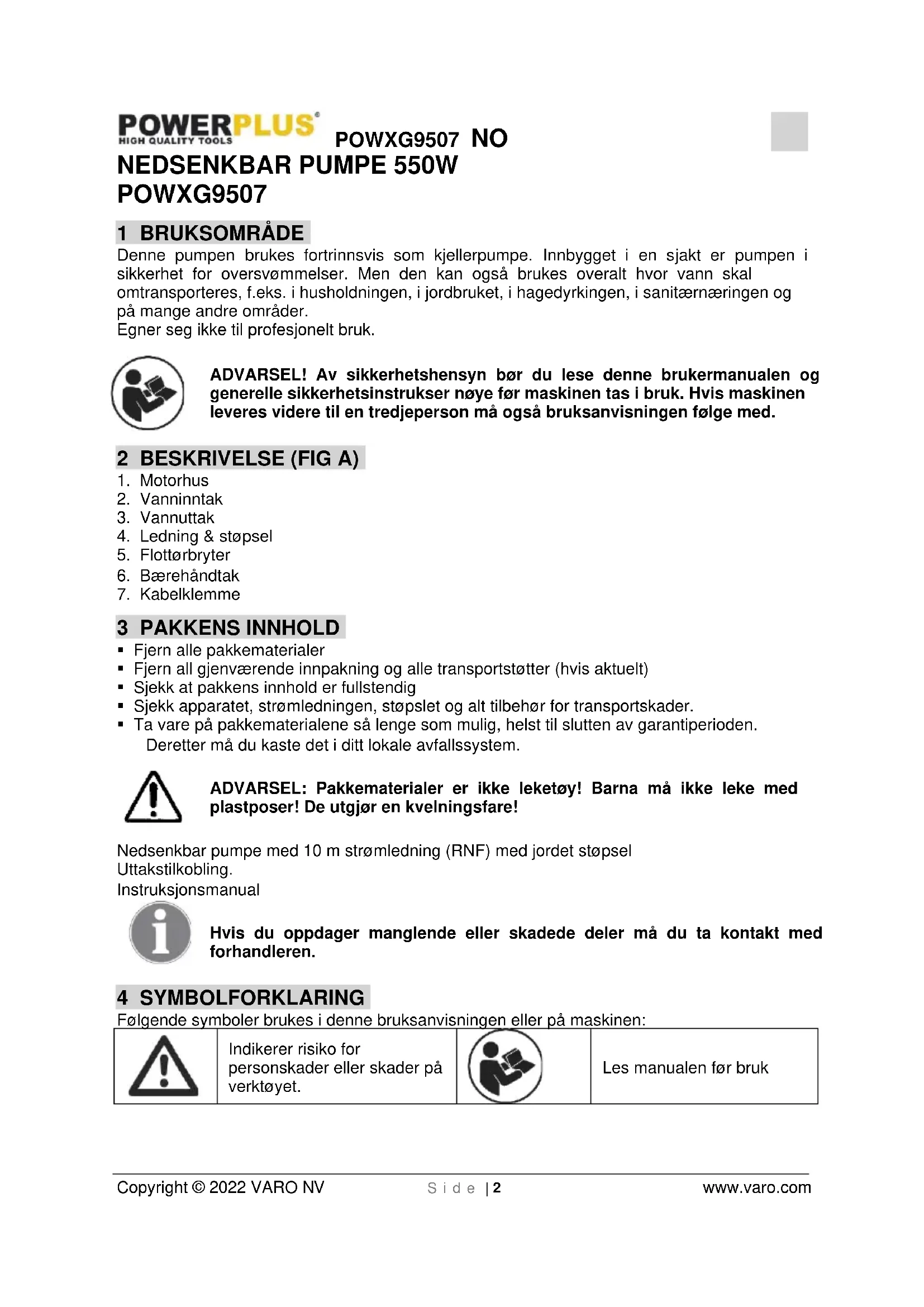 - stasjonært med fleksibel slangeledning Pass på! Under installasjonen må det sørges for at pumpen aldri henger fritt fra trykkledningen eller monteres på strømkabelen. Den nedsenkbare motorpumpen må henges etter bærehåndtaket som følger med, eller legges i bunnen af sjakten. For at pumpen skal sikres en god funksjon må sjaktbunnen holdes fri for slam og andre forurensninger. Ved for lav vannstand kan slammet i sjaktbunnen tørke inn og pumpen må hindres fra å starte. Derfor er det nødvendigt at den nedsenkbare motorpumpene sjekkes regelmessig (foreta startforsøk). Flottørbryteren må stilles inn slik at en igangkjøring til enhver tid er mulig. Råd Pumpesjakten bør minst ha dimensjonen 40 x 40 x 50 cm, slik at flottørbryteren kan bevege seg fritt.POWXG9507 NO Copyright © 2022 VARO NV S i d e | 4 www.varo.com Nettilkopling Den nye dykkermotorpumpen har allerede et jordingskontaktstøpsel. Pumpen er bestemt for tilkopling til en jordingsstikkontakt 230 V - 50 Hz. Vær sikker på at stikkontakten er sterk nok (minst 6 A), og i perfekt stand. Før pumpestøpselet i stikkontakten og pumpen er klar til start. Råd! Dersom nettledningen eller støpselet er kommet til skade pga. ytre påvirkning, kan kabelen ikke repareres! Kabelen må skiftes ut. 8 IGANGKJØRING Etter å ha lest installasjons- og bruksanvisningen nøye, kan pumpen settes i drift under følgende betingelser: