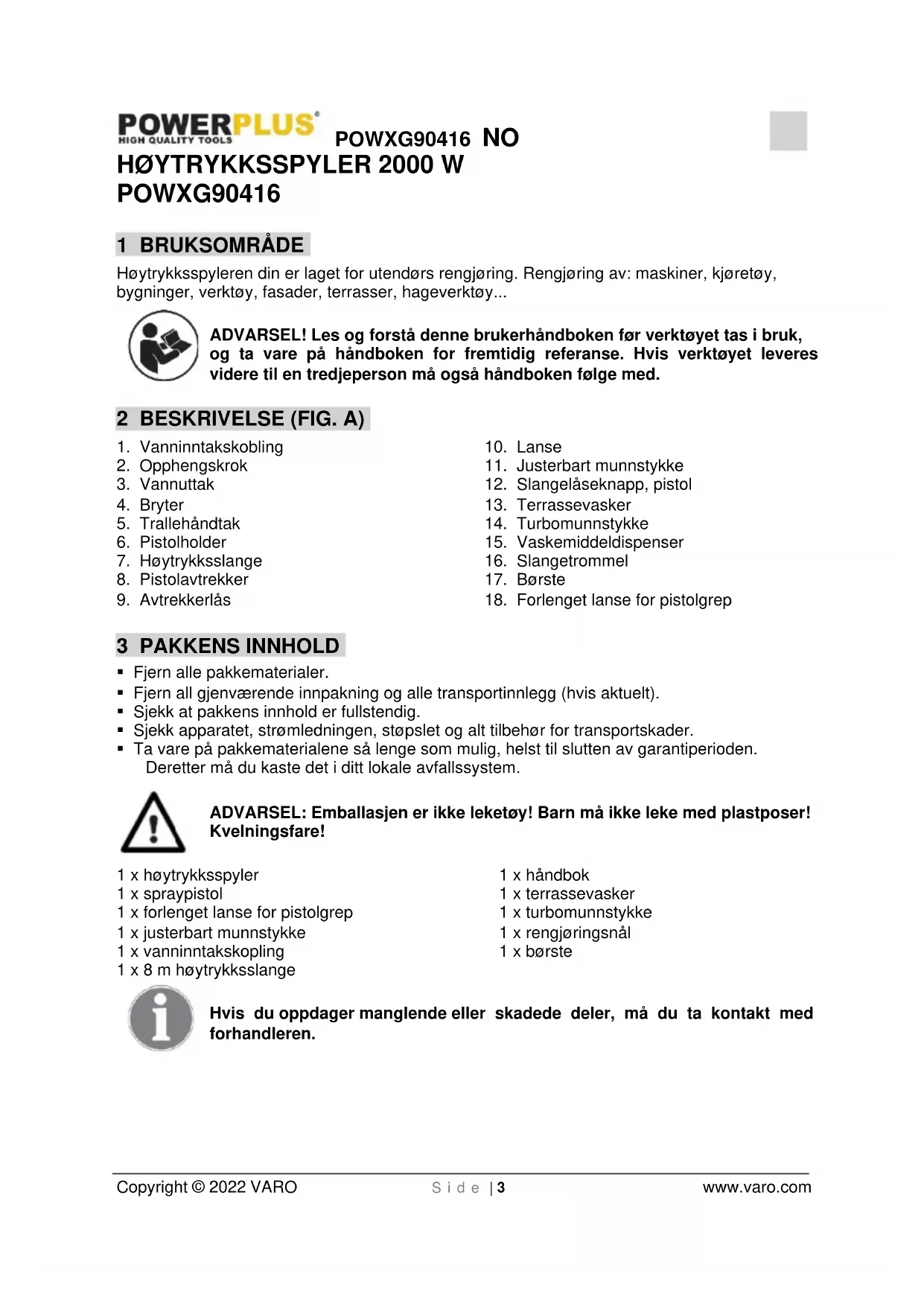 Spenning 220-240 V / 50 Hz Effekt 2000 W Gjennomstrømning 7,5 l/min Vanntemperatur Maks. 50 °C Vekt 9,0 kg 10 STØY Støyemisjonsverdier målt i samsvar med relevant standard. (K=3) Lydtrykknivå LpA 75 dB(A) Lydeffektnivå LwA 89 dB(A) VIKTIG! Bruk hørselsvern når lydtrykket er over 85 dB(A). aw (Vibrasjon) 2,1 m/s² K = 1,5 m/s²POWXG90416 NO Copyright © 2022 VARO S i d e | 10 www.varo.com