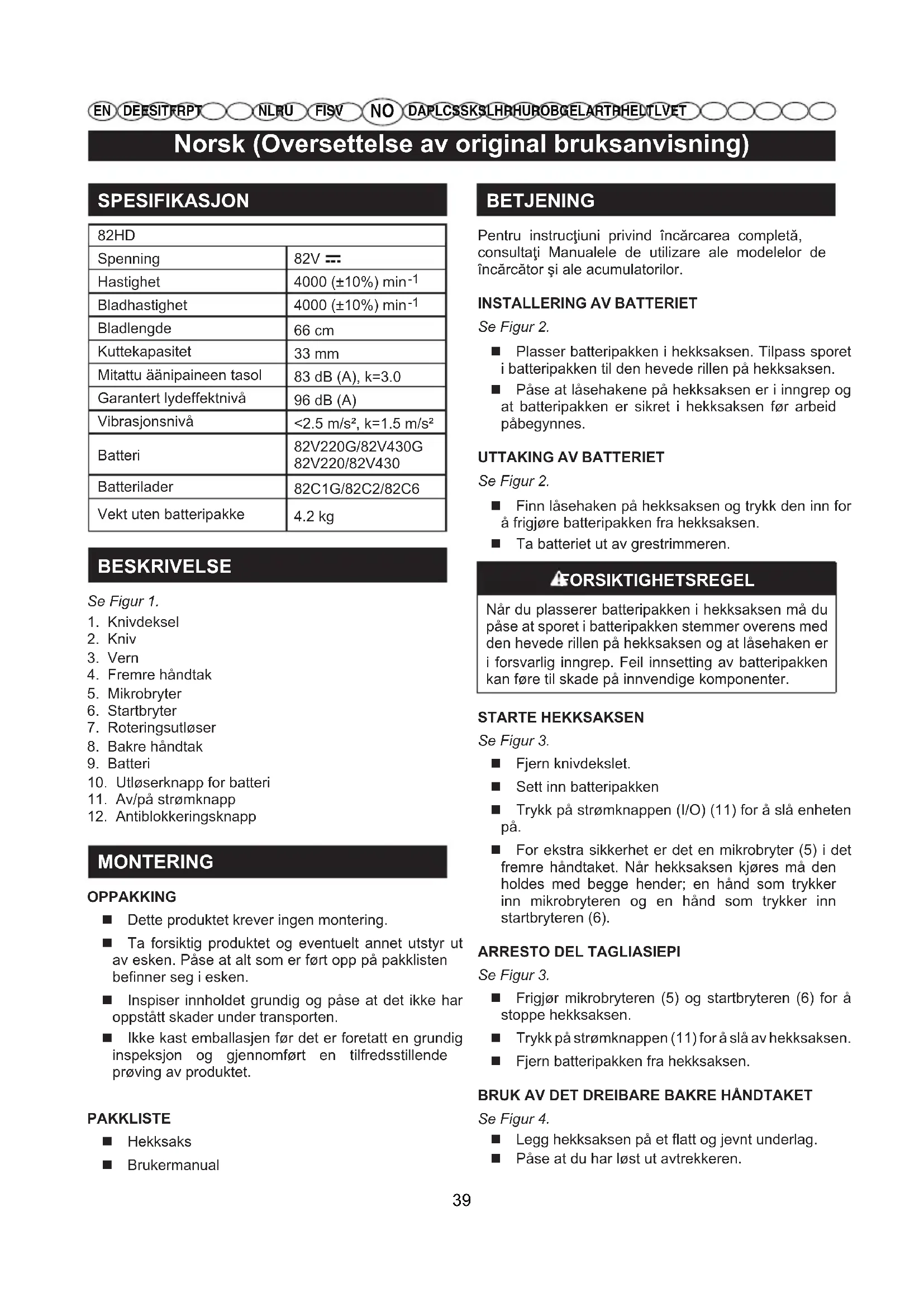 MONTERING OPPAKKING Dette produktet krever ingen montering. Ta forsiktig produktet og eventuelt annet utstyr ut av esken. Påse at alt som er ført opp på pakklisten befinner seg i esken. Inspiser innholdet grundig og påse at det ikke har oppstått skader under transporten. Ikke kast emballasjen før det er foretatt en grundig inspeksjon og gjennomført en tilfredsstillende prøving av produktet. PAKKLISTE Hekksaks Brukermanual BETJENING Pentru instrucţiuni privind încărcarea completă, consultaţi Manualele de utilizare ale modelelor de încărcător şi ale acumulatorilor.