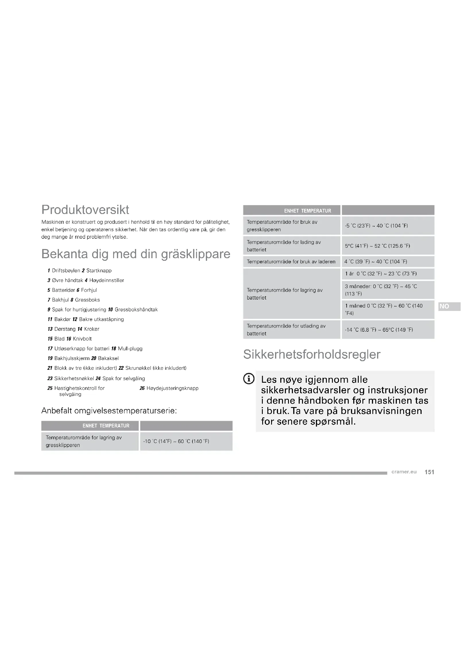 Produktoversikt Maskinen er konstruert og produsert i henhold til en høy standard for pålitelighet, enkel betjening og operatørens sikkerhet. Når den tas ordentlig vare på, gir den deg mange år med problemfri ytelse. Bekanta dig med din gräsklippare 1 Driftsbøylen 2 Startknapp3 Øvre håndtak 4 Høydeinnstiller5 Batteridør 6 Forhjul7 Bakhjul 8 Gressboks9 Spak for hurtigjustering 10 Gressbokshåndtak11 Bakdør 12 Bakre utkaståpning13 Dørstang 14 Kroker15 Blad 16 Knivbolt17 Utløserknapp for batteri 18 Mull-plugg19 Bakhjulsskjerm 20 Bakaksel21 Blokk av tre (ikke inkludert) 22 Skrunøkkel (ikke inkludert)23 Sikkerhetsnøkkel 24 Spak for selvgåing25 Hastighetskontroll for selvgåing26 Høydejusteringsknapp Anbefalt omgivelsestemperaturserie: ENHET TEMPERATUR Temperaturområde for lagring av gressklipperen-10 ˚C (14˚F) ~ 60 ˚C (140 ˚F) ENHET TEMPERATUR Temperaturområde for bruk av gressklipperen-5 ˚C (23˚F) ~ 40 ˚C (104 ˚F) Temperaturområde for lading av batteriet 5°C (41˚F) ~ 52 ˚C (125.6 ˚F) Temperaturområde for bruk av laderen 4 ˚C (39 ˚F) ~ 40 ˚C (104 ˚F) Temperaturområde for lagring av batteriet 1 år 0 ˚C (32 ˚F) ~ 23 ˚C (73 ˚F) 3 måneder: 0 ˚C (32 ˚F) ~ 45 ˚C (113 ˚F) 1 måned 0 ˚C (32 ˚F) ~ 60 ˚C (140 ˚F4) Temperaturområde for utlading av batteriet -14 ˚C (6.8 ˚F) ~ 65°C (149 ˚F) Sikkerhetsforholdsregler Les nøye igjennom alle sikkerhetsadvarsler og instruksjoner i denne håndboken før maskinen tas i bruk. Ta vare på bruksanvisningen for senere spørsmål.152 cramer.eu