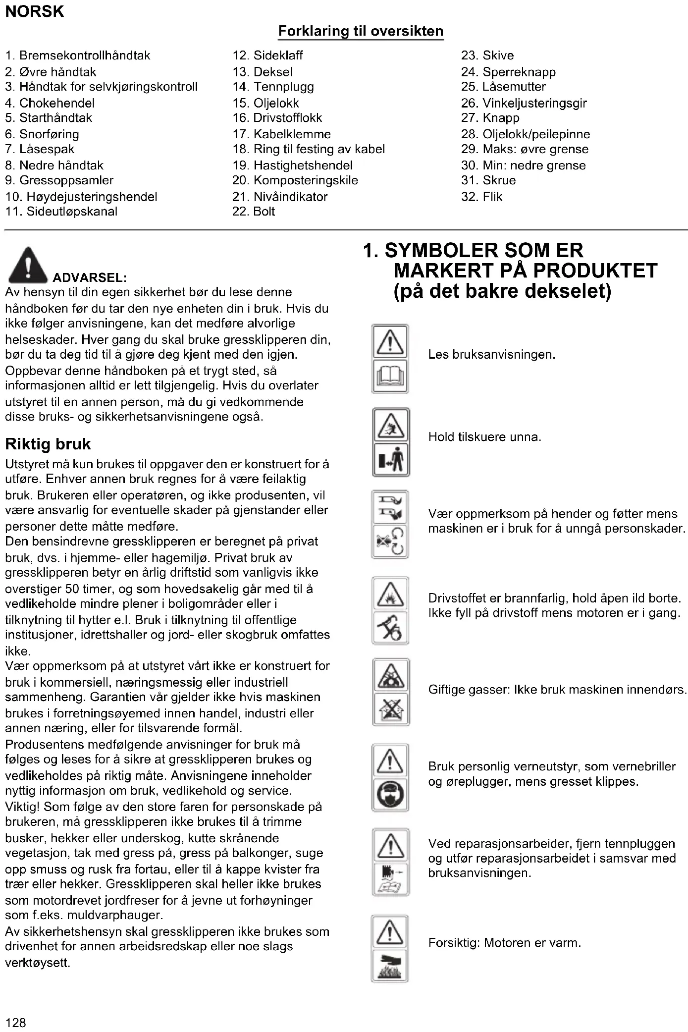 - Forsiktig: Gressklipperen skal ikke brukes uten at hele gressfangeren eller det selvlukkende vernet for utkaståpningen er på plass.130