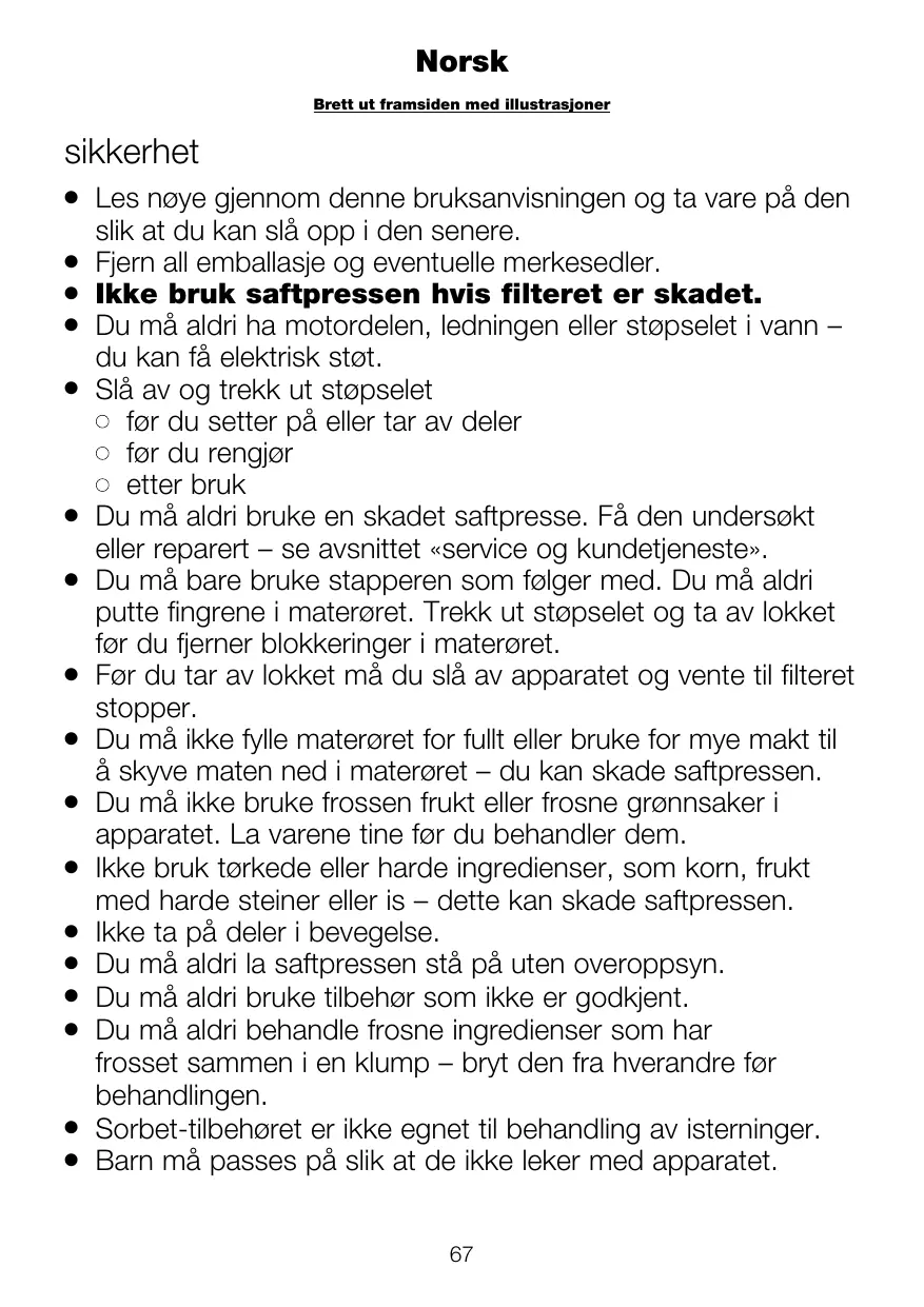 Les nøye gjennom denne bruksanvisningen og ta vare på den slik at du kan slå opp i den senere. Fjern all emballasje og eventuelle merkesedler. Ikke bruk saftpressen hvis filteret er skadet. Du må aldri ha motordelen, ledningen eller støpselet i vann – du kan få elektrisk støt. Slå av og trekk ut støpselet før du setter på eller tar av deler før du rengjør etter bruk Du må aldri bruke en skadet saftpresse. Få den undersøkt eller reparert – se avsnittet «service og kundetjeneste». Du må bare bruke stapperen som følger med. Du må aldri putte fingrene i materøret. Trekk ut støpselet og ta av lokket før du fjerner blokkeringer i materøret. Før du tar av lokket må du slå av apparatet og vente til filteret stopper. Du må ikke fylle materøret for fullt eller bruke for mye makt til å skyve maten ned i materøret – du kan skade saftpressen. Du må ikke bruke frossen frukt eller frosne grønnsaker i apparatet. La varene tine før du behandler dem. Ikke bruk tørkede eller harde ingredienser, som korn, frukt med harde steiner eller is – dette kan skade saftpressen. Ikke ta på deler i bevegelse. Du må aldri la saftpressen stå på uten overoppsyn. Du må aldri bruke tilbehør som ikke er godkjent. Du må aldri behandle frosne ingredienser som har frosset sammen i en klump – bryt den fra hverandre før behandlingen. Sorbet-tilbehøret er ikke egnet til behandling av isterninger. Barn må passes på slik at de ikke leker med apparatet. 67