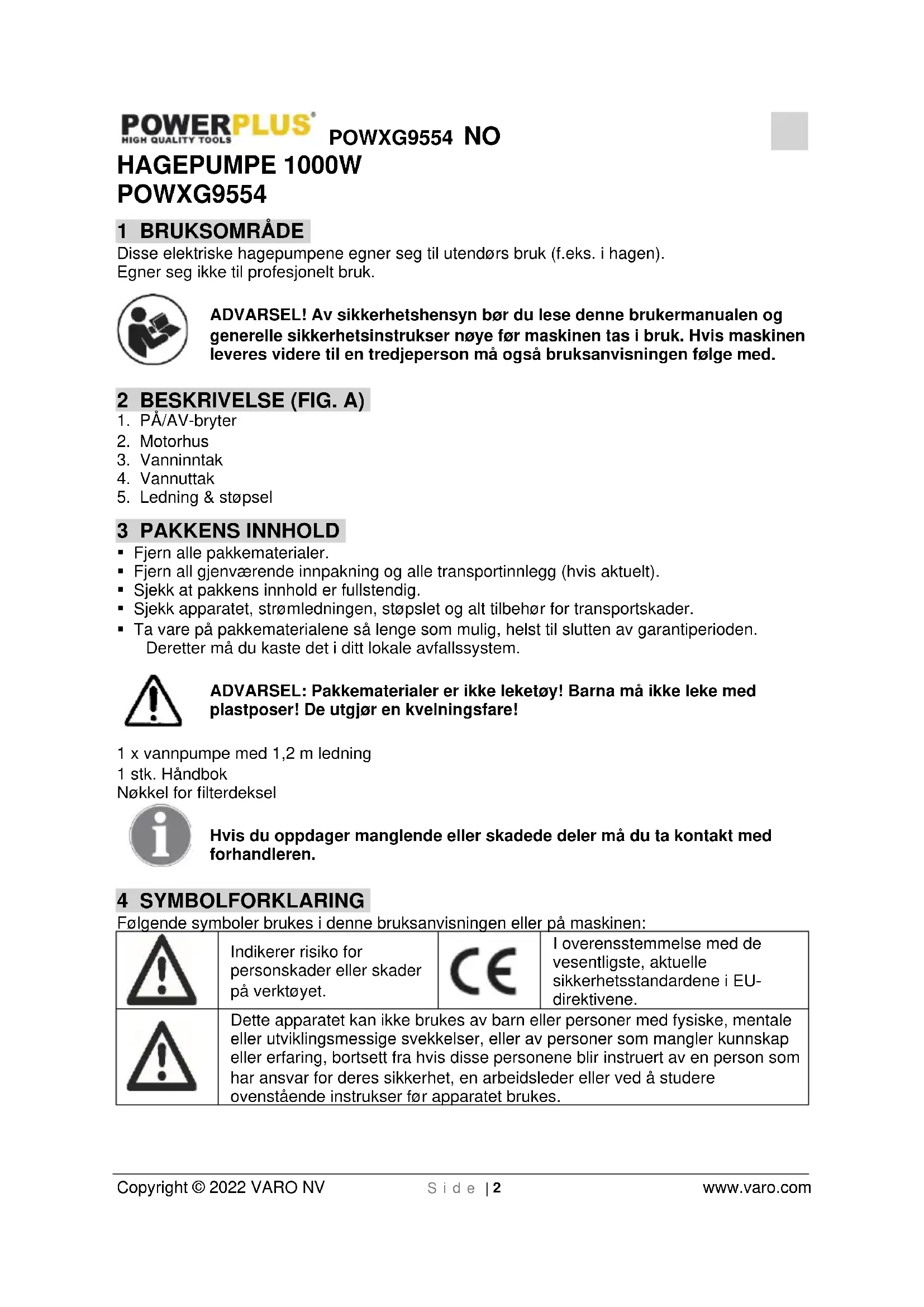 Copyright © 2022 VARO NV S i d e | 2 www.varo.com HAGEPUMPE 1000W POWXG9554 1 BRUKSOMRÅDE Disse elektriske hagepumpene egner seg til utendørs bruk (f.eks. i hagen). Egner seg ikke til profesjonelt bruk. ADVARSEL! Av sikkerhetshensyn bør du lese denne brukermanualen og generelle sikkerhetsinstrukser nøye før maskinen tas i bruk. Hvis maskinen leveres videre til en tredjeperson må også bruksanvisningen følge med. 2 BESKRIVELSE (FIG. A)