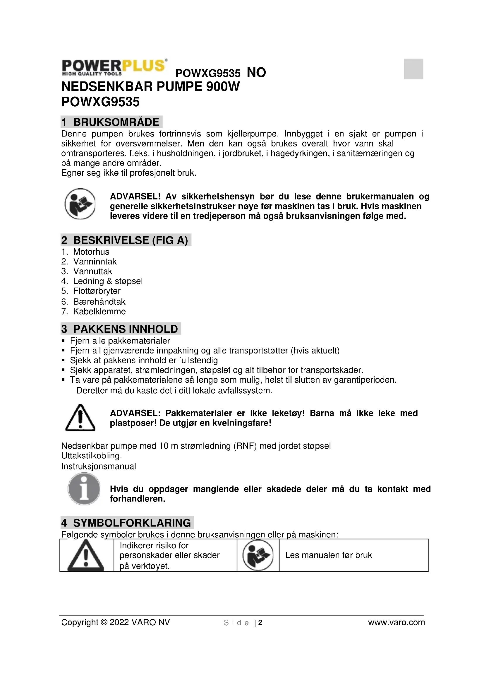 - stasjonært med fleksibel slangeledning Pass på! Under installasjonen må det sørges for at pumpen aldri henger fritt fra trykkledningen eller monteres på strømkabelen. Den nedsenkbare motorpumpen må henges etter bærehåndtaket som følger med, eller legges i bunnen af sjakten. For at pumpen skal sikres en god funksjon må sjaktbunnen holdes fri for slam og andre forurensninger. Ved for lav vannstand kan slammet i sjaktbunnen tørke inn og pumpen må hindres fra å starte. Derfor er det nødvendigt at den nedsenkbare motorpumpene sjekkes regelmessig (foreta startforsøk). Flottørbryteren må stilles inn slik at en igangkjøring til enhver tid er mulig. Råd Pumpesjakten bør minst ha dimensjonen 40 x 40 x 50 cm, slik at flottørbryteren kan bevege seg fritt.POWXG9535 NO Copyright © 2022 VARO NV S i d e | 4 www.varo.com Nettilkopling Den nye dykkermotorpumpen har allerede et jordingskontaktstøpsel. Pumpen er bestemt for tilkopling til en jordingsstikkontakt 230 V - 50 Hz. Vær sikker på at stikkontakten er sterk nok (minst 6 A), og i perfekt stand. Før pumpestøpselet i stikkontakten og pumpen er klar til start. Råd! Dersom nettledningen eller støpselet er kommet til skade pga. ytre påvirkning, kan kabelen ikke repareres! Kabelen må skiftes ut. 8 IGANGKJØRING Etter å ha lest installasjons- og bruksanvisningen nøye, kan pumpen settes i drift under følgende betingelser: