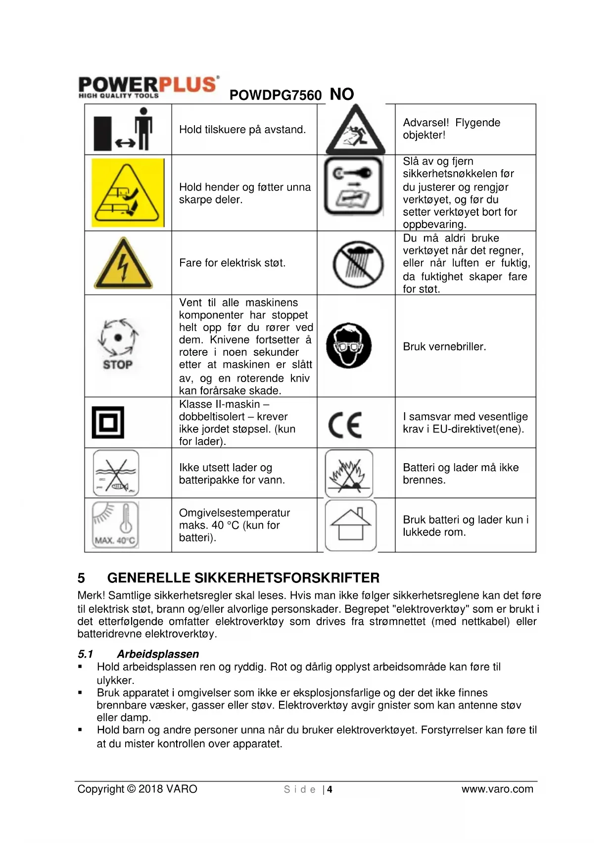 - Hold barn og andre personer unna når du bruker elektroverktøyet. Forstyrrelser kan føre til at du mister kontrollen over apparatet.POWDPG7560 NO Copyright © 2018 VARO S i d e | 5 www.varo.com