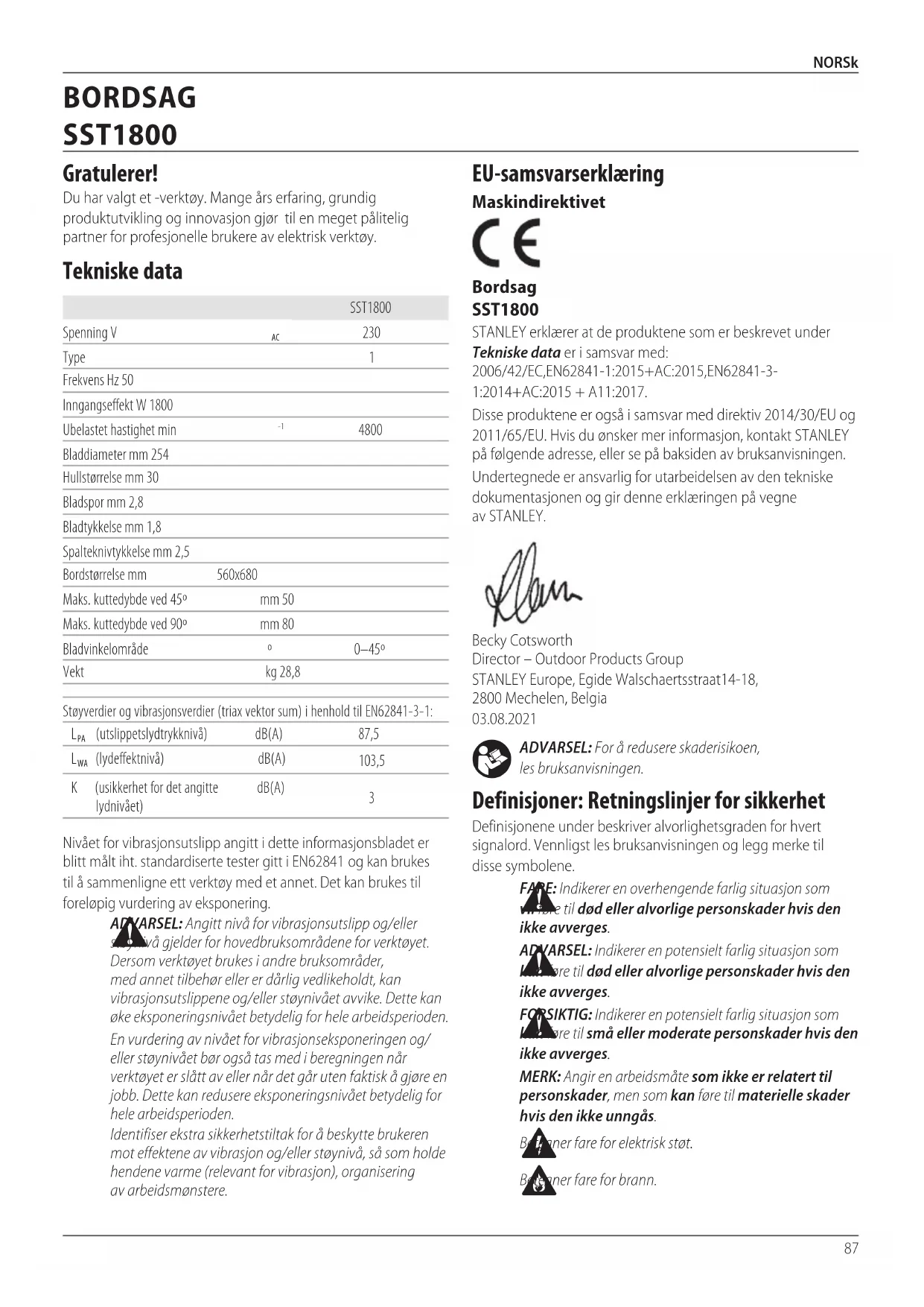 Gratulerer! Du har valgt et ‑verktøy. Mange års erfaring, grundig produktutvikling og innovasjon gjør til en meget pålitelig partner for profesjonelle brukere av elektriskverktøy. Tekniske data Norsk (oversatt fra de originale instruksjonene) BORDSAG SST180088 NORSk Ett øyeblikks uoppmerksomhet under bruk av elektriske verktøy kan føre til alvorligpersonskade. b ) Bruk personlig verneutstyr. Bruk alltid vernebriller. Verneutstyr slik som støvmaske, sklisikre vernesko, hjelm, eller hørselsvern brukt under passende forhold vil reduserepersonskader. c ) Unngå utilsiktet oppstart. Sikre at bryteren er i av‑stillingen før du kobler til strømkilden og/eller batteripakken, plukker opp eller bærer verktøyet. Å bære elektriske verktøy med fingeren på bryteren eller å sette inn støpselet mens elektriske verktøy har bryteren på øker faren forulykker. d ) Fjern eventuelle justeringsnøkler før du slår på det elektriske verktøyet. En nøkkel som er festet til en roterende del av det elektriske verktøyet kan føre tilpersonskade. e ) Ikke strekk deg for langt. Ha godt fotfeste og stå støtt hele tiden. Dette fører til at du har bedre kontroll over det elektriske verktøyet ved uventedesituasjoner. f ) Bruk egnet antrekk. Ikke ha på deg løstsittende klær eller smykker. Hold hår, antrekk og hansker borte fra bevegelige deler. Løstsittende antrekk, smykker eller langt hår kan bli fanget opp av bevegeligedeler. g ) Hvis apparatet er utstyrt for tilkobling av støvutsugings‑ og ‑oppsamlingsinnretning, må du sørge for at disse er koblet til og ordentlig sikret. Bruk av støvoppsamlere kan redusere støvrelatertefarer. h ) Ikke la kunnskap som du har fått fra hyppig bruk av verktøy la deg bli for selvsikker slik at du ignorerer verktøyets sikkerhetsprinsipper. En tankeløs handling kan føre til alvorlig personskade på brøkdelen av etsekund.