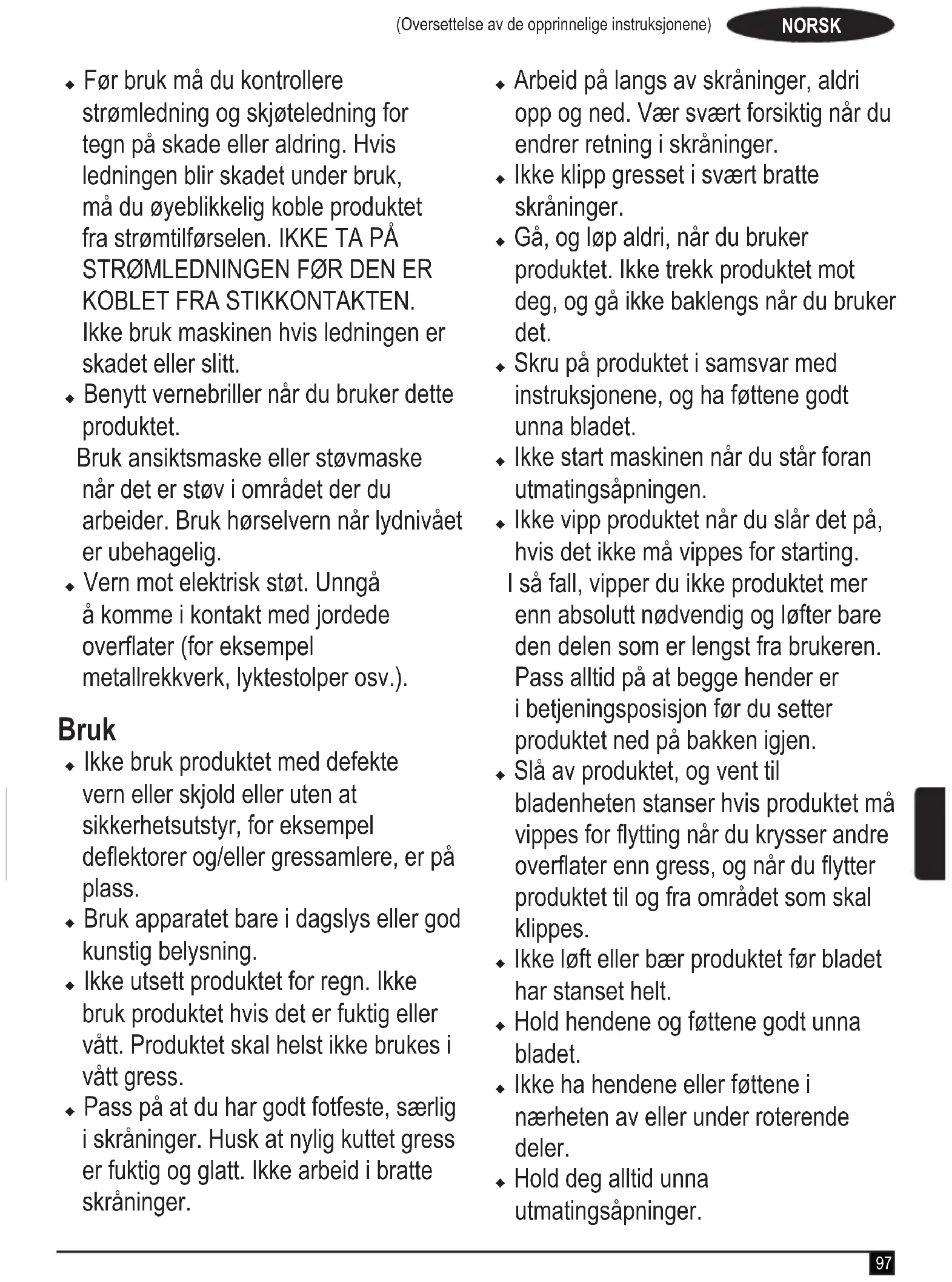 KOBLET FRA STIKKONTAKTEN. Ikke bruk maskinen hvis ledningen er skadet eller slitt. u Benytt vernebriller når du bruker dette produktet. Bruk ansiktsmaske eller støvmaske når det er støv i området der du arbeider. Bruk hørselvern når lydnivået er ubehagelig. u Vern mot elektrisk støt. Unngå å komme i kontakt med jordede overater (for eksempel metallrekkverk, lyktestolper osv.). Bruk u Ikke bruk produktet med defekte vern eller skjold eller uten at sikkerhetsutstyr, for eksempel deektorer og/eller gressamlere, er på plass. u Bruk apparatet bare i dagslys eller god kunstig belysning. u Ikke utsett produktet for regn. Ikke bruk produktet hvis det er fuktig eller vått. Produktet skal helst ikke brukes i vått gress. u Pass på at du har godt fotfeste, særlig i skråninger. Husk at nylig kuttet gress er fuktig og glatt. Ikke arbeid i bratte skråninger. u Arbeid på langs av skråninger, aldri opp og ned. Vær svært forsiktig når du endrer retning i skråninger. u Ikke klipp gresset i svært bratte skråninger. u Gå, og løp aldri, når du bruker produktet. Ikke trekk produktet mot deg, og gå ikke baklengs når du bruker det. u Skru på produktet i samsvar med instruksjonene, og ha føttene godt unna bladet. u Ikke start maskinen når du står foran utmatingsåpningen. u Ikke vipp produktet når du slår det på, hvis det ikke må vippes for starting. I så fall, vipper du ikke produktet mer enn absolutt nødvendig og løfter bare den delen som er lengst fra brukeren. Pass alltid på at begge hender er i betjeningsposisjon før du setter produktet ned på bakken igjen. u Slå av produktet, og vent til bladenheten stanser hvis produktet må vippes for ytting når du krysser andre overater enn gress, og når du ytter produktet til og fra området som skal klippes. u Ikke løft eller bær produktet før bladet har stanset helt. u Hold hendene og føttene godt unna bladet. u Ikke ha hendene eller føttene i nærheten av eller under roterende deler. u Hold deg alltid unna utmatingsåpninger.98 (Oversettelse av de opprinnelige instruksjonene) NORSK u Slå av produktet, trekk støpselet ut av stikkontakten, og forsikre deg om at bevegelige deler har sluttet å rotere før du lar produktet stå uten tilsyn, og før du skifter, rengjør eller kontrollerer noen deler av produktet eller fjerner en blokkering. Etter at du har truffet en fremmed gjenstand. Undersøk om maskinen er skadet, og utfør reparasjoner før du starter og bruker maskinen på nytt; u Hvis produktet begynner å vibrere unormalt, eller hvis du treffer en fremmed gjenstand, slår du av produktet og trekker støpselet ut av stikkontakten. Undersøk om maskinen er skadet, bytt eller reparer skadete deler, undersøk om deler er løse, og stram om nødvendig. u Pass på å holde strømledningen unna bladet. Vær alltid oppmerksom på hvor ledningen er. u Motoren fortsetter å gå noen sekunder etter at du har slått av produktet. Prøv aldri å stanse bladet med makt. Vedlikehold og oppbevaring u Kontroller at apparatet ikke er skadet eller har defekte deler før du bruker det. Kontroller at bevegelige deler ikke er ute av posisjon og ikke klemmes fast, at deler, inkludert vern eller brytere, ikke er skadet, og at det ikke er andre forhold som kan virke inn på funksjonen. Forsikre deg om at produktet fungerer riktig og utfører funksjonen det er beregnet for. Bruk aldri produktet hvis vern eller deksler er skadet eller ute av posisjon. Ikke bruk apparatet hvis en del er skadet eller defekt. Ikke bruk apparatet hvis det ikke kan slås på og av med bryteren. Overlat reparasjon eller utskifting av skadde eller defekte deler til et autorisert serviceverksted. u Kontroller ofte at kabelen ikke er skadet. Hvis kabelen er skadet, må den skiftes hos et autorisert serviceverksted så man unngår fare. Undersøk skjøteledninger regelmessig. Skift ut skjøteledningen straks hvis den er skadet. u Pass på at alle muttere og skruer på produktet er godt tilskrudd, så du sikrer trygge arbeidsforhold. u Kontroller om gressoppsamleren er slitt eller skadet, og bytt den hvis det trengs. Bruk aldri produktet uten gressoppsamleren. u Vær forsiktig når du justerer maskinen så du unngår å klemme ngrene mellom bevegelige og faste deler på maskinen. u Når du vedlikeholder bladene, må du være klar over at selv om strømmen er av, kan bladene fremdeles bevege seg. u Når det ikke er i bruk, skal apparatet oppbevares på et tørt sted. Barn skal ikke ha tilgang til apparater som oppbevares. u La alltid maskinen bli avkjølt før den oppbevares.99 (Oversettelse av de opprinnelige instruksjonene) NORSK u Pass på at det bare brukes reserveskjæreredskaper av riktig type. u Bruk bare reservedeler og tilbehør som anbefales av BLACK+DECKER. Ytterligere sikkerhetsinstruksjoner for gressklippere u Bruk alltid en godkjent skjøteledning som passer til inngangseffekten for dette verktøyet (se tekniske data). Skjøteledningen må passe for utendørs bruk og skal være merket i samsvar med dette. Opptil 30 m 1.5 mm² HO5VV V-F-skjøteledning kan brukes uten tap av ytelse for produktet. Før bruk må du undersøke skjøteledningen for tegn på skade, slitasje og aldring. Bytt skjøteledningen hvis den er skadet eller defekt. Vikle alltid ut kabelen fullstendig når du bruker en kabeltrommel. u Ikke transporter maskinen mens strømkilden er aktiv u Hold godt fast i håndtaket med begge hender når du bruker gressklipperen. u Hvis det på noe tidspunkt er nødvendig å vippe gressklipperen til én side, sørg for at begge hender forblir i denne betjeningsposisjonen mens gressklipperen vippes. Hold begge hender i betjeningsposisjonen helt til gressklipperen er satt riktig tilbake på bakken igjen. u Du må aldri bruke hodetelefoner for radio eller musikk når du bruker gressklipperen. u Forsøk aldri å justere høyden på hjulene mens motoren går, eller mens sikkerhetsnøkkelen er i bryterhuset. u Hvis gressklipperen kjører seg fast, slipper d