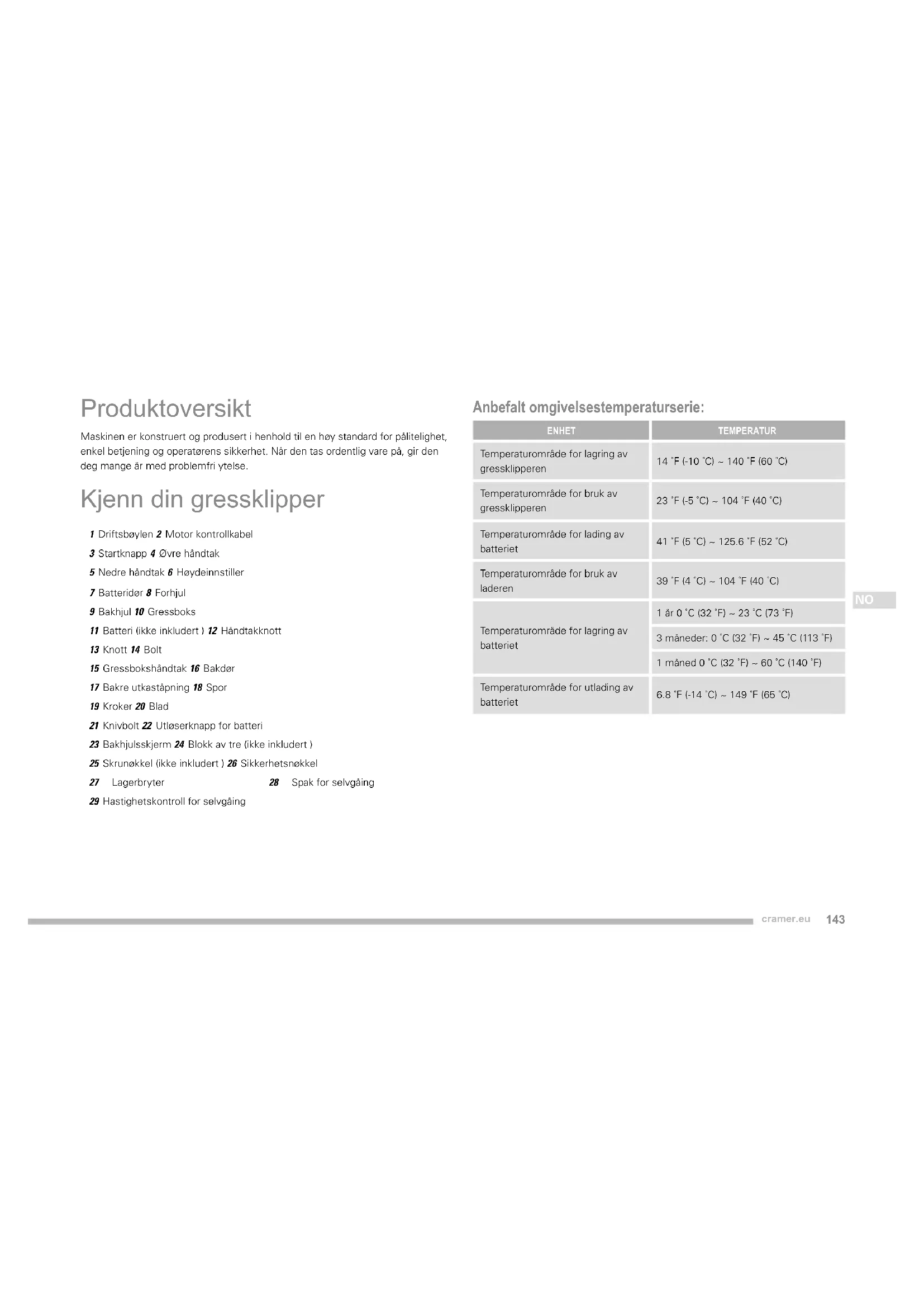 Produktoversikt Maskinen er konstruert og produsert i henhold til en høy standard for pålitelighet, enkel betjening og operatørens sikkerhet. Når den tas ordentlig vare på, gir den deg mange år med problemfri ytelse. Kjenn din gressklipper 1 Driftsbøylen 2 Motor kontrollkabel 3 Startknapp 4 Øvre håndtak 5 Nedre håndtak 6 Høydeinnstiller 7 Batteridør 8 Forhjul 9 Bakhjul 10 Gressboks 11 Batteri (ikke inkludert ) 12 Håndtakknott 13 Knott 14 Bolt 15 Gressbokshåndtak 16 Bakdør 17 Bakre utkaståpning 18 Spor 19 Kroker 20 Blad 21 Knivbolt 22 Utløserknapp for batteri 23 Bakhjulsskjerm 24 Blokk av tre (ikke inkludert ) 25 Skrunøkkel (ikke inkludert ) 26 Sikkerhetsnøkkel 27 Lagerbryter 28 Spak for selvgåing 29 Hastighetskontroll for selvgåing Anbefalt omgivelsestemperaturserie: ENHET TEMPERATUR Temperaturområde for lagring av gressklipperen 14 ˚F (-10 ˚C) ~ 140 ˚F (60 ˚C) Temperaturområde for bruk av gressklipperen 23 ˚F (-5 ˚C) ~ 104 ˚F (40 ˚C) Temperaturområde for lading av batteriet 41 ˚F (5 ˚C) ~ 125.6 ˚F (52 ˚C) Temperaturområde for bruk av laderen 39 ˚F (4 ˚C) ~ 104 ˚F (40 ˚C) Temperaturområde for lagring av batteriet 1 år 0 ˚C (32 ˚F) ~ 23 ˚C (73 ˚F) 3 måneder: 0 ˚C (32 ˚F) ~ 45 ˚C (113 ˚F) 1 måned 0 ˚C (32 ˚F) ~ 60 ˚C (140 ˚F) Temperaturområde for utlading av batteriet