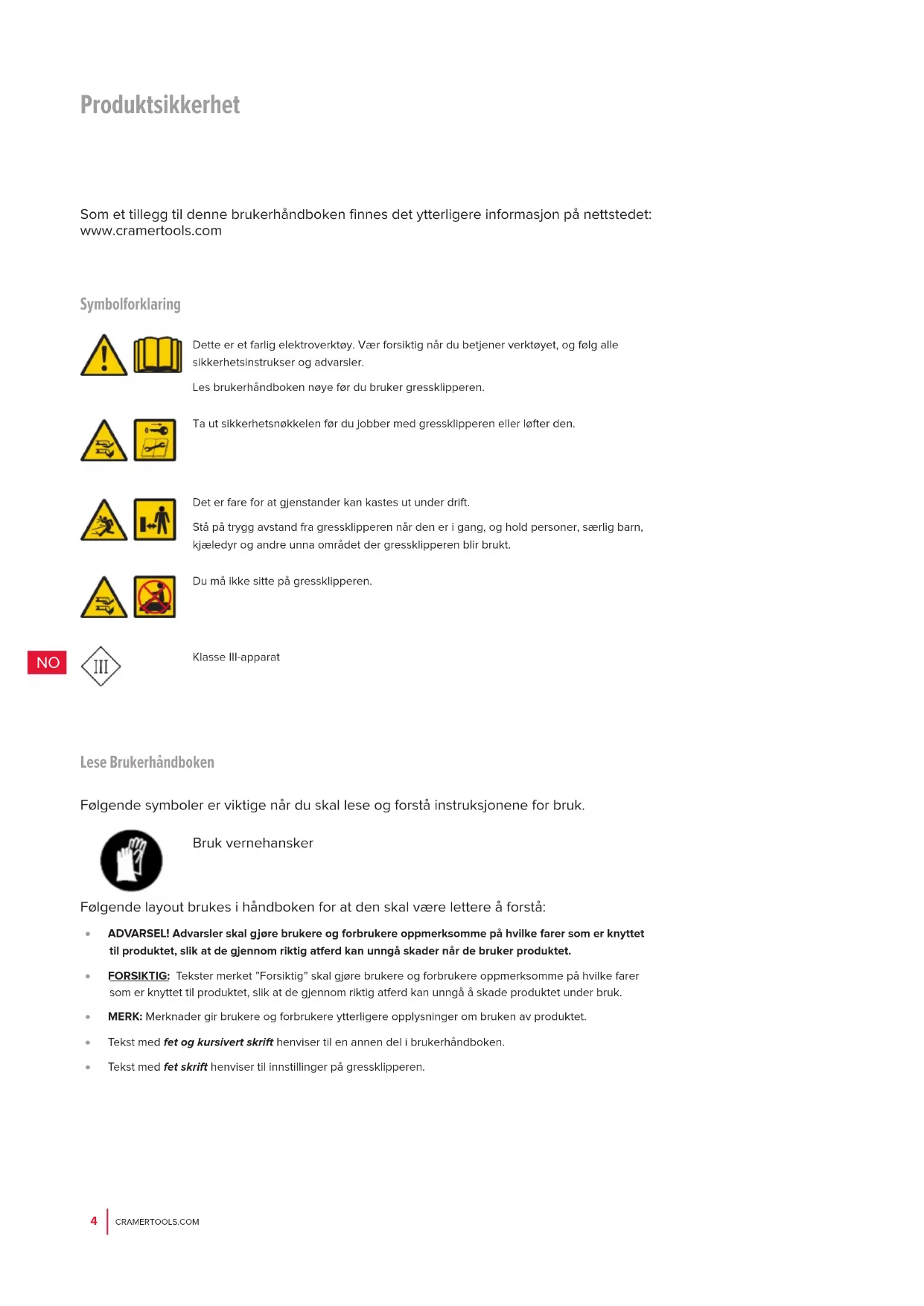 Symbolforklaring Dette er et farlig elektroverktøy. Vær forsiktig når du betjener verktøyet, og følg alle sikkerhetsinstrukser og advarsler. Les brukerhåndboken nøye før du bruker gressklipperen. Ta ut sikkerhetsnøkkelen før du jobber med gressklipperen eller løfter den. Det er fare for at gjenstander kan kastes ut under drift. Stå på trygg avstand fra gressklipperen når den er i gang, og hold personer, særlig barn, kjæledyr og andre unna området der gressklipperen blir brukt. Du må ikke sitte på gressklipperen. Klasse III-apparat Som et tillegg til denne brukerhåndboken finnes det ytterligere informasjon på nettstedet: www.cramertools.com Lese Brukerhåndboken Følgende symboler er viktige når du skal lese og forstå instruksjonene for bruk. Bruk vernehansker Følgende layout brukes i håndboken for at den skal være lettere å forstå: