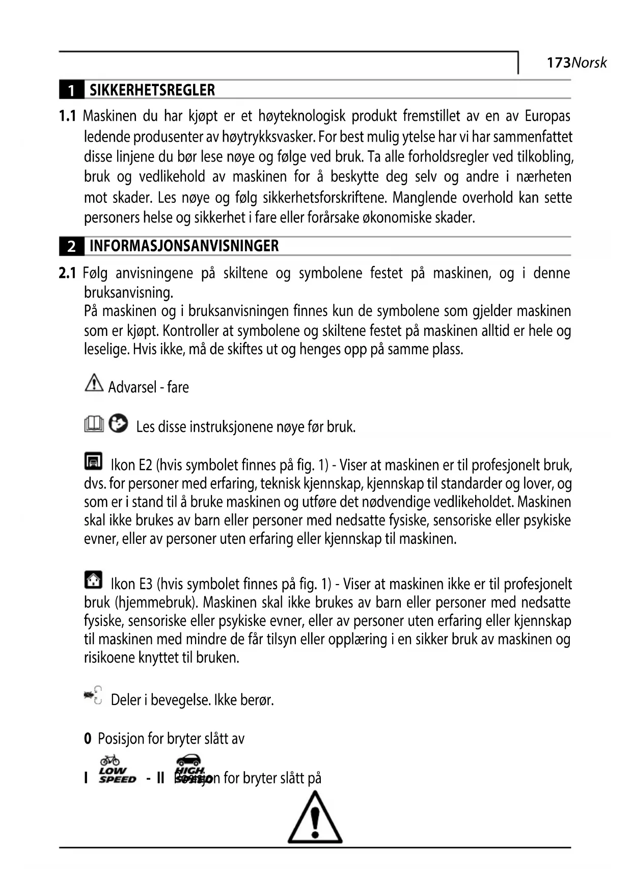 bruksanvisning. På maskinen og i bruksanvisningen finnes kun de symbolene som gjelder maskinen som er kjøpt. Kontroller at symbolene og skiltene festet på maskinen alltid er hele og leselige. Hvis ikke, må de skiftes ut og henges opp på samme plass. Advarsel - fare Les disse instruksjonene nøye før bruk. Ikon E2 (hvis symbolet finnes på fig. 1) - Viser at maskinen er til profesjonelt bruk, dvs. for personer med erfaring, teknisk kjennskap, kjennskap til standarder og lover, og som er i stand til å bruke maskinen og utføre det nødvendige vedlikeholdet. Maskinen skal ikke brukes av barn eller personer med nedsatte fysiske, sensoriske eller psykiske evner, eller av personer uten erfaring eller kjennskap til maskinen. Ikon E3 (hvis symbolet finnes på fig. 1) - Viser at maskinen ikke er til profesjonelt bruk (hjemmebruk). Maskinen skal ikke brukes av barn eller personer med nedsatte fysiske, sensoriske eller psykiske evner, eller av personer uten erfaring eller kjennskap til maskinen med mindre de får tilsyn eller opplæring i en sikker bruk av maskinen og risikoene knyttet til bruken. Deler i bevegelse. Ikke berør. 0 Posisjon for bryter slått av
