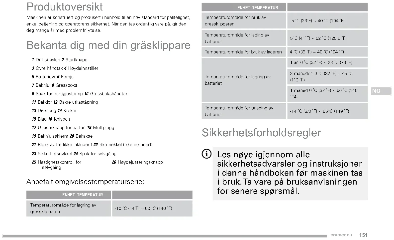Produktoversikt Maskinen er konstruert og produsert i henhold til en høy standard for pålitelighet, enkel betjening og operatørens sikkerhet. Når den tas ordentlig vare på, gir den deg mange år med problemfri ytelse. Bekanta dig med din gräsklippare 1 Driftsbøylen 2 Startknapp3 Øvre håndtak 4 Høydeinnstiller5 Batteridør 6 Forhjul7 Bakhjul 8 Gressboks9 Spak for hurtigjustering 10 Gressbokshåndtak11 Bakdør 12 Bakre utkaståpning13 Dørstang 14 Kroker15 Blad 16 Knivbolt17 Utløserknapp for batteri 18 Mull-plugg19 Bakhjulsskjerm 20 Bakaksel21 Blokk av tre (ikke inkludert) 22 Skrunøkkel (ikke inkludert)23 Sikkerhetsnøkkel 24 Spak for selvgåing25 Hastighetskontroll for selvgåing26 Høydejusteringsknapp Anbefalt omgivelsestemperaturserie: ENHET TEMPERATUR Temperaturområde for lagring av gressklipperen-10 ˚C (14˚F) ~ 60 ˚C (140 ˚F) ENHET TEMPERATUR Temperaturområde for bruk av gressklipperen-5 ˚C (23˚F) ~ 40 ˚C (104 ˚F) Temperaturområde for lading av batteriet 5°C (41˚F) ~ 52 ˚C (125.6 ˚F) Temperaturområde for bruk av laderen 4 ˚C (39 ˚F) ~ 40 ˚C (104 ˚F) Temperaturområde for lagring av batteriet 1 år 0 ˚C (32 ˚F) ~ 23 ˚C (73 ˚F) 3 måneder: 0 ˚C (32 ˚F) ~ 45 ˚C (113 ˚F) 1 måned 0 ˚C (32 ˚F) ~ 60 ˚C (140 ˚F4) Temperaturområde for utlading av batteriet -14 ˚C (6.8 ˚F) ~ 65°C (149 ˚F) Sikkerhetsforholdsregler Les nøye igjennom alle sikkerhetsadvarsler og instruksjoner i denne håndboken før maskinen tas i bruk. Ta vare på bruksanvisningen for senere spørsmål.152 cramer.eu