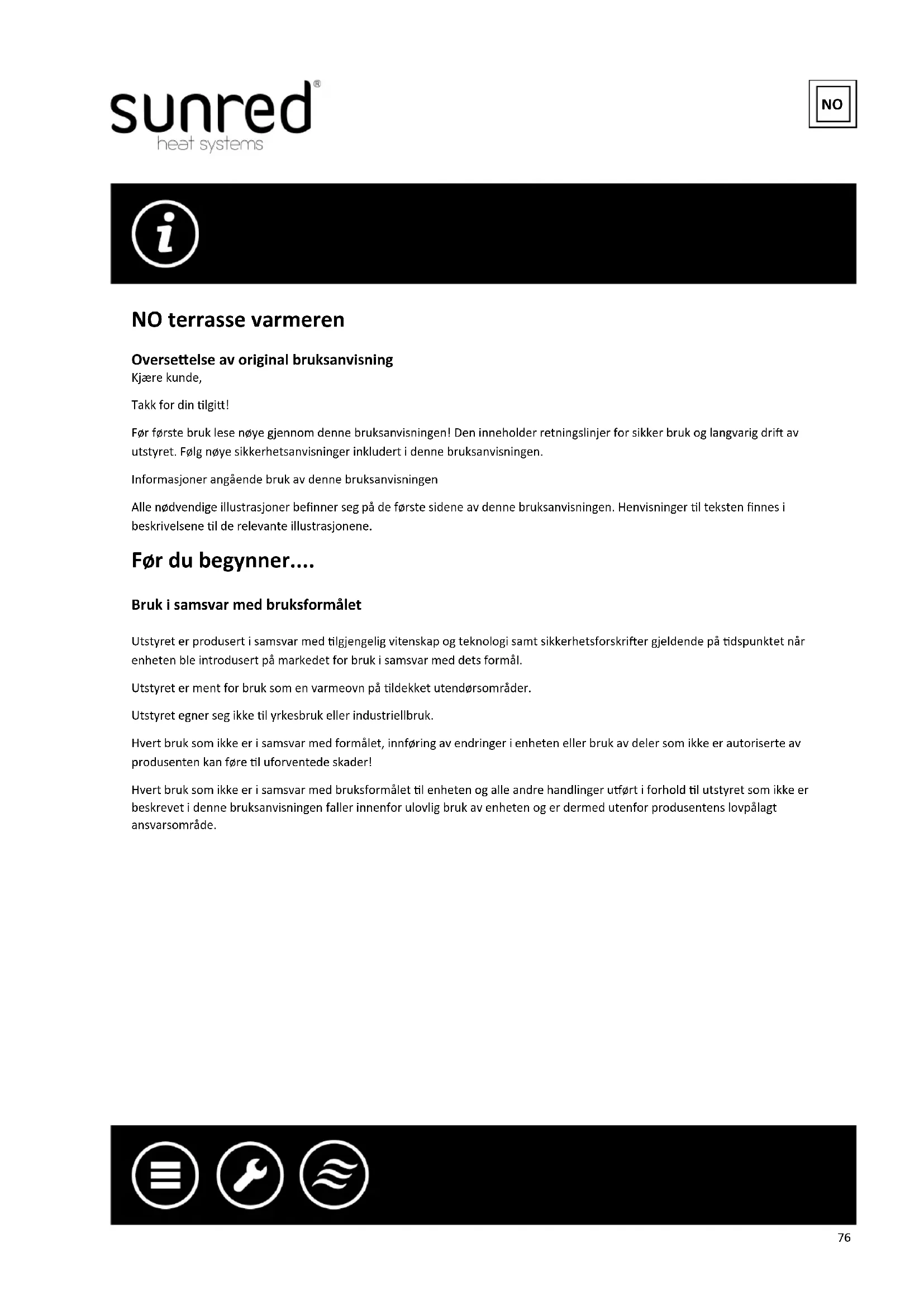 OutTrade B.V. De Gri 1 7711 EP Nieuwleusen The Netherlands Tel: +31-529—48 28 08 Fax: +31-529—48 49 10 info@ourade.eu www.ourade.eu GARANTIKORT Beskriv venligst fejlen: Bliver problemet ikke beskrevet i detaljer, kan dee vanskeliggøre påbegyndelse af reparaonen og forlænge reparaonsden. Bliver fejlene ikke nærmere speciceret, kan det være svært for os at idencere problemet. Det kan også nogle gange vise sig nødvendigt at foretage en gentagen reparaon.76 NO terrasse varmeren Overseelse av original bruksanvisning Kjære kunde, Takk for din lgi! Før første bruk lese nøye gjennom denne bruksanvisningen! Den inneholder retningslinjer for sikker bruk og langvarig dri av utstyret. Følg nøye sikkerhetsanvisninger inkludert i denne bruksanvisningen. Informasjoner angående bruk av denne bruksanvisningen Alle nødvendige illustrasjoner benner seg på de første sidene av denne bruksanvisningen. Henvisninger l teksten nnes i beskrivelsene l de relevante illustrasjonene. Før du begynner.... Bruk i samsvar med bruksformålet Utstyret er produsert i samsvar med lgjengelig vitenskap og teknologi samt sikkerhetsforskrier gjeldende på dspunktet når enheten ble introdusert på markedet for bruk i samsvar med dets formål. Utstyret er ment for bruk som en varmeovn på ldekket utendørsområder. Utstyret egner seg ikke l yrkesbruk eller industriellbruk. Hvert bruk som ikke er i samsvar med formålet, innføring av endringer i enheten eller bruk av deler som ikke er autoriserte av produsenten kan føre l uforventede skader! Hvert bruk som ikke er i samsvar med bruksformålet l enheten og alle andre handlinger uørt i forhold l utstyret som ikke er beskrevet i denne bruksanvisningen faller innenfor ulovlig bruk av enheten og er dermed utenfor produsentens lovpålagt ansvarsområde. NO77 For din sikkerhet Generelle sikkerhetsforskrier