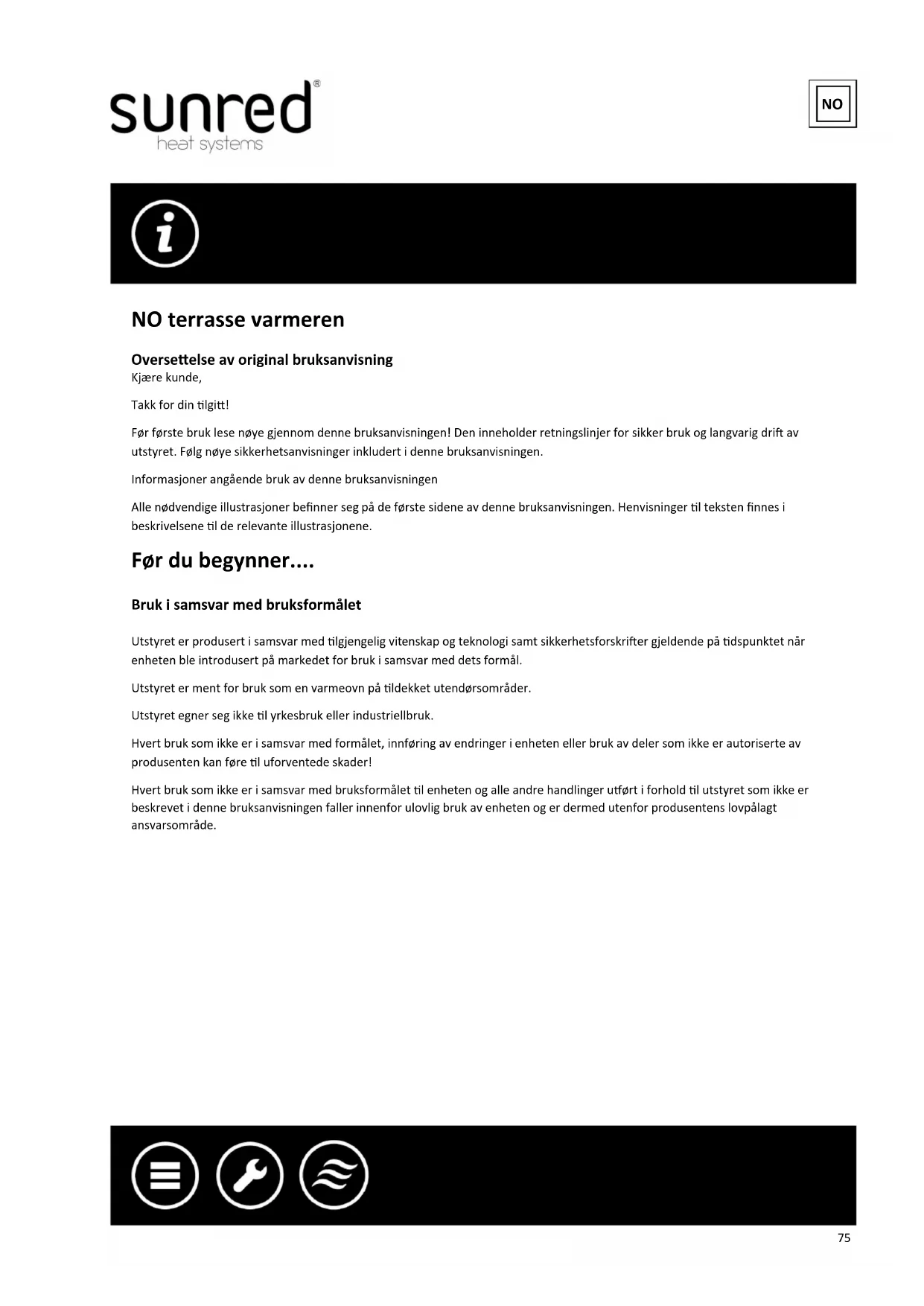 OutTrade B.V. De Gri 1 7711 EP Nieuwleusen The Netherlands Tel: +31-529—48 28 08 Fax: +31-529—48 49 10 info@ourade.eu www.ourade.eu GARANTIKORT Beskriv venligst fejlen: Bliver problemet ikke beskrevet i detaljer, kan dee vanskeliggøre påbegyndelse af reparaonen og forlænge reparaonsden. Bliver fejlene ikke nærmere speciceret, kan det være svært for os at idencere problemet. Det kan også nogle gange vise sig nødvendigt at foretage en gentagen reparaon.75 NO terrasse varmeren Overseelse av original bruksanvisning Kjære kunde, Takk for din lgi! Før første bruk lese nøye gjennom denne bruksanvisningen! Den inneholder retningslinjer for sikker bruk og langvarig dri av utstyret. Følg nøye sikkerhetsanvisninger inkludert i denne bruksanvisningen. Informasjoner angående bruk av denne bruksanvisningen Alle nødvendige illustrasjoner benner seg på de første sidene av denne bruksanvisningen. Henvisninger l teksten nnes i beskrivelsene l de relevante illustrasjonene. Før du begynner.... Bruk i samsvar med bruksformålet Utstyret er produsert i samsvar med lgjengelig vitenskap og teknologi samt sikkerhetsforskrier gjeldende på dspunktet når enheten ble introdusert på markedet for bruk i samsvar med dets formål. Utstyret er ment for bruk som en varmeovn på ldekket utendørsområder. Utstyret egner seg ikke l yrkesbruk eller industriellbruk. Hvert bruk som ikke er i samsvar med formålet, innføring av endringer i enheten eller bruk av deler som ikke er autoriserte av produsenten kan føre l uforventede skader! Hvert bruk som ikke er i samsvar med bruksformålet l enheten og alle andre handlinger uørt i forhold l utstyret som ikke er beskrevet i denne bruksanvisningen faller innenfor ulovlig bruk av enheten og er dermed utenfor produsentens lovpålagt ansvarsområde. NO76 For din sikkerhet Generelle sikkerhetsforskrier