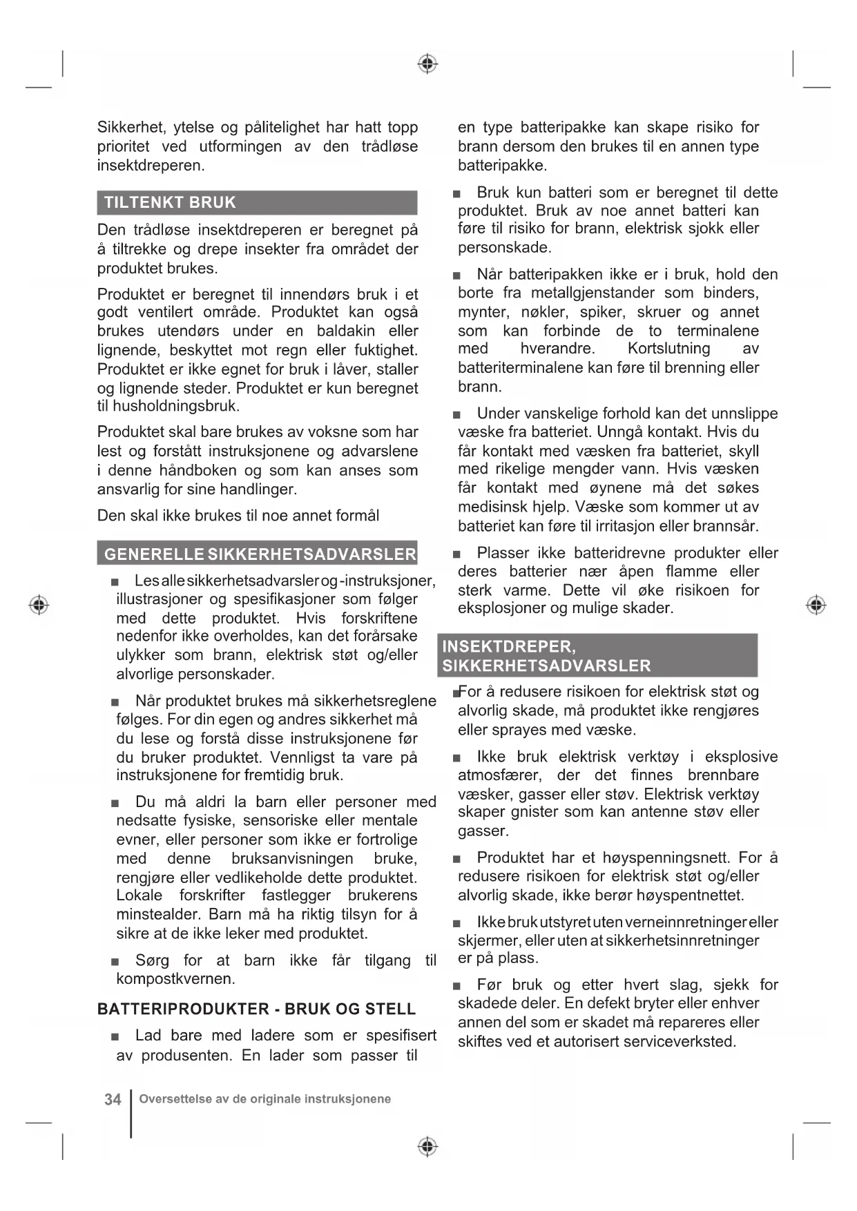 Huom Varoitus Osat ja lisävarusteet on hankittava erikseen34 Oversettelse av de originale instruksjonene Sikkerhet, ytelse og pålitelighet har hatt topp prioritet ved utformingen av den trådløse insektdreperen. TILTENKT BRUK Den trådløse insektdreperen er beregnet på å tiltrekke og drepe insekter fra området der produktet brukes. Produktet er beregnet til innendørs bruk i et godt ventilert område. Produktet kan også brukes utendørs under en baldakin eller lignende, beskyttet mot regn eller fuktighet. Produktet er ikke egnet for bruk i låver, staller og lignende steder. Produktet er kun beregnet til husholdningsbruk. Produktet skal bare brukes av voksne som har lest og forstått instruksjonene og advarslene i denne håndboken og som kan anses som ansvarlig for sine handlinger. Den skal ikke brukes til noe annet formål GENERELLE SIKKERHETSADVARSLER ■ Les alle sikkerhetsadvarsler og -instruksjoner, illustrasjoner og spesifikasjoner som følger med dette produktet. Hvis forskriftene nedenfor ikke overholdes, kan det forårsake ulykker som brann, elektrisk støt og/eller alvorlige personskader. ■ Når produktet brukes må sikkerhetsreglene følges. For din egen og andres sikkerhet må du lese og forstå disse instruksjonene før du bruker produktet. Vennligst ta vare på instruksjonene for fremtidig bruk. ■ Du må aldri la barn eller personer med nedsatte fysiske, sensoriske eller mentale evner, eller personer som ikke er fortrolige med denne bruksanvisningen bruke, rengjøre eller vedlikeholde dette produktet. Lokale forskrifter fastlegger brukerens minstealder. Barn må ha riktig tilsyn for å sikre at de ikke leker med produktet. ■ Sørg for at barn ikke får tilgang til kompostkvernen.