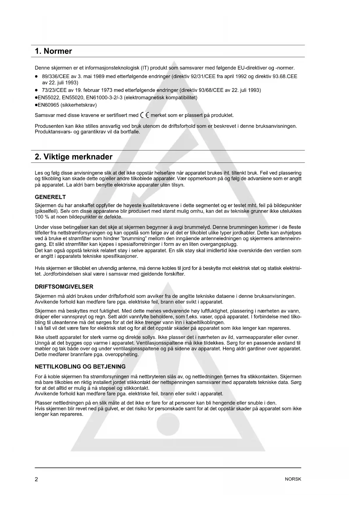 Les og følg disse anvisningene slik at det ikke oppstår helsefare når apparatet brukes iht. tiltenkt bruk. Feil ved plassering og tilkobling kan skade dette og/eller andre tilkoblede apparater. Vær oppmerksom på og følg de advarslene som er angitt på apparatet. La aldri barn benytte elektriske apparater uten tilsyn. GENERELT Skjermen du har anskaffet oppfyller de høyeste kvalitetskravene i dette segmentet og er testet mht. feil på bildepunkter (pikselfeil). Selv om disse apparatene blir produsert med størst mulig omhu, kan det av tekniske grunner ikke utelukkes 100 % at noen bildepunkter er defekte. Under visse betingelser kan det skje at skjermen begynner å avgi brummelyd. Denne brummingen kommer i de fleste tilfeller fra nettstrømforsyningen og kan oppstå som følge av at det er tilkoblet ulike typer jordkabler. Dette kan avhjelpes ved å bruke et strømfilter som hindrer "brumming" mellom den inngående antenneledningen og skjermens antenneinnĆ gang. Et slikt strømfilter kan kjøpes i spesialforretninger i form av en liten overgangsplugg. Det kan også oppstå teknisk relatert støy i selve apparatet. En slik støy skal imidlertid ikke overskride den verdien som er angitt i apparatets tekniske spesifikasjoner. Hvis skjermen er tilkoblet en utvendig antenne, må denne kobles til jord for å beskytte mot elektrisk støt og statisk elektrisiĆ tet. Jordforbindelsen skal være i samsvar med gjeldende forskifter. DRIFTSOMGIVELSER Skjermen må aldri brukes under driftsforhold som avviker fra de angitte tekniske dataene i denne bruksanvisningen. Avvikende forhold kan medføre fare pga. elektriske feil, brann eller svikt i apparatet. Skjermen må beskyttes mot fuktighet. Med dette menes vedvarende høy luftfuktighet, plassering i nærheten av vann, dråper eller vannsprøyt og regn. Sett aldri vannfylte beholdere, som f.eks. vaser, oppå apparatet. I forbindelse med tilkoĆ bling til uteantenne må det sørges for at det ikke trenger vann inn i kabeltilkoblingen. I så fall vil det være fare for elektrisk støt og for at det oppstår skader på apparatet som ikke lenger kan repareres. Ikke utsett apparatet for sterk varme og direkte sollys. Ikke plasser det i nærheten av ild, varmeapparater eller ovner. Unngå at det bygges opp varme i apparatet. Ventilasjonsspaltene må ikke tildekkes. Sørg for en passende avstand til møbler og tak både over og under ventilasjonsspaltene og på sidene av apparatet. Heng aldri gardiner over apparatet. Dette medfører brannfare pga. overoppheting.
