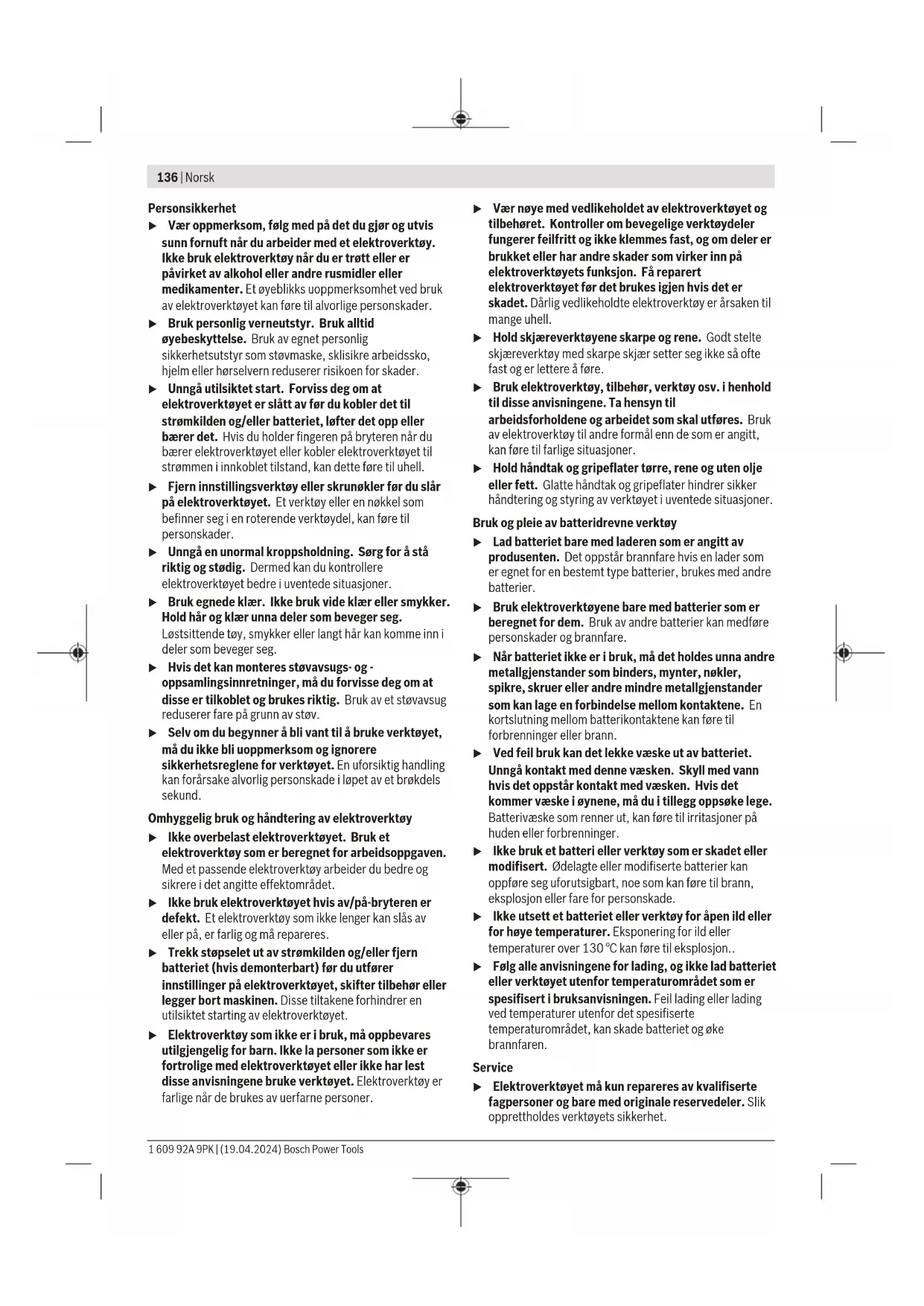 Målt ved20−25°Cmed batteriProCORE18V 8.0Ah. B) Avhengig av batteriet C) Begrenset ytelse ved temperatur under 0°C Tillatte emnemål (maksimums-/minimumsmål): (se „Godkjente arbeidsstykkemål“, Side145) Verdiene kan variere avhengig av produktet, bruksområdet og miljøforholdene. Du finner mer informasjon på www.bosch-professional.com/wac. Informasjon om støy Støyemisjon målt i henhold tilENIEC62841-3-9. Vanlig A-støynivå for elektroverktøyet: lydtrykknivå93dB(A); lydeffektnivå107dB(A). Usikkerhet K=3dB. Bruk hørselvern! Støyutslippsverdien som er angitt i disse anvisningene er målt iht. en standardisert målemetode og kan brukes til sammenligning av elektroverktøy med hverandre. Den egner seg også til en foreløpig estimering av støyutslippet. Den angitte støyutslippsverdien representerer de hovedsakelige bruksområdene til elektroverktøyet. Men hvis elektroverktøyet brukes til andre formål, med andre innsatsverktøy eller utilstrekkelig vedlikehold, kan støyutslippet avvike fra det som er angitt. Dette kan føre til en betydelig økning av støyutslippet for hele arbeidstidsrommet. For en nøyaktig vurdering av støyutslippet skal det også tas hensyn til de tidene maskinen er slått av, eller går, men ikke faktisk er i bruk. Dette kan redusere støyutslippet for hele arbeidstidsrommet betraktelig. Batteri Bosch selger også batteridrevne elektroverktøy uten batteri. Det er angitt på emballasjen om et batteri følger med ditt elektroverktøy. Lade batteriet u Bruk bare laderne som er oppført i de tekniske spesifikasjonene. Kun disse laderne er tilpasset til Li- ion-batteriet som er brukt i elektroverktøyet. Merknad: I samsvar med internasjonale transportforskrifter blir litium-ion-batterier levert delvis ladet. For å sikre full effekt fra batteriet må du lade det helt opp før første gangs bruk. Sette inn batteriet Skyv det oppladede batteriet inn i batteriholderen til det låses ordentlig. Ta ut batteriet For å ta ut batteriet trykker du på utløserknappen og trekker batteriet ut. Ikke bruk makt. Batteriethar tolåsetrinn som skal hindre at batteriet faller ut hvis batteriutløserknappentrykkes inn utilsiktet. Så lenge 1 609 92A 9PK | (19.04.2024) Bosch Power ToolsNorsk | 141 batteriet er satt inn i elektroverktøyet, holdes det i posisjon av en fjær. Indikator for batteriladenivå Merknad: Ikke alle batterityper er utstyrt med ladenivåindikator. De grønne lysdiodene i batteriets ladenivåindikator viser batteriets ladenivå. Av sikkerhetsgrunner er det bare mulig å få vist ladenivået når elektroverktøyet er stoppet. Trykk på knappen for indikatoren for batteriets ladenivå eller for å se ladenivået. Dette er mulig også når batteriet er tatt ut. Hvis ingen lysdiode lyser etter at knappen for indikatoren for batteriets ladenivå er trykt inn, er batteriet defekt og må skiftes ut. Batteritype GBA 18V... Lysdiode Kapasitet Lyser kontinuerlig 3 × grønt 60–100% Lyser kontinuerlig 2 × grønt 30–60% Lyser kontinuerlig 1 × grønt 5–30% Blinker 1 × grønt 0–5% Batteritype ProCORE18V... Lysdiode Kapasitet Lyser kontinuerlig 5 × grønt 80–100% Lyser kontinuerlig 4 × grønt 60–80% Lyser kontinuerlig 3 × grønt 40–60% Lyser kontinuerlig 2 × grønt 20–40% Lyser kontinuerlig 1 × grønt 5–20% Blinker 1 × grønt 0–5% Regler for optimal bruk av oppladbare batterier Beskytt batteriet mot fuktighet og vann. Batteriet må oppbevares ved temperatur fra −20°C til 50°C. Du må for eksempel ikke la det ligge i bilen om sommeren. Rengjør ventilasjonsslissene på batteriet regelmessig med en myk, ren og tørr pensel. En vesentlig kortere driftstid etter oppladingen er et tegn på at batteriet er oppbrukt og må skiftes ut. Følg anvisningene om kassering. Montering u Ta alltid batteriet ut av elektroverktøyet før arbeid på elektroverktøyet (foreksempel vedlikehold, bytte av verktøy, osv.). Det er fare for personskader hvis du trykker på av/på-bryteren ved en feiltagelse. Leveranseomfang Se illustrasjonen av leveransen i begynnelsen av bruksanvisningen. Kontroller før første gangs bruk av elektroverktøyet om alle delene som er oppført nedenfor fulgte med: – Kapp- og gjærsag med montert sagblad – Klemhjul (45) – Justerbar anleggsskinne (26) – Skrutvinge (41) – Unbrakonøkkel/sporskrutrekker (43) – Støvpose (37) – Emneunderlag (24) (2stk.) Merknad: Undersøk om elektroverktøyet er skadet. Før videre bruk av elektroverktøyet må beskyttelsesinnretninger eller lett skadede deler kontrolleres nøye med hensyn til feilfri og forskriftsmessig funksjon. Kontroller om de bevegelige delene fungerer feilfritt og ikke blokkeres, og at ingen deler er skadet. Samtlige deler må være riktig montert og oppfylle alle betingelser for å sikre en feilfri drift. Skadede beskyttelsesinnretninger og deler må repareres eller skiftes ut på en sakkyndig måte av et godkjent fagverksted. Montering av enkeltdeler – Ta alle medleverte deler forsiktig ut av emballasjen. – Fjern all emballasjen til elektroverktøyet og tilbehøret som ble levert sammen med verktøyet. – For å gjøre det lettere å montere delene som følger med må du kontrollere at elektroverktøyet er i transportstilling. Montere emneunderlag (se bildeA1) Emneunderlagene (24) kan plasseres til venstre, høyre eller foran på elektroverktøyet. Det fleksible festesystemet gir mulighet til mange forskjellige forlengelses- eller utvidelsesvarianter (se bildeG). – Alt etter behov setter du emneunderlaget (24) i festene (47) på elektroverktøyet eller i festene (48) til det andre emneunderlaget. u Bær aldri elektroverktøyet ved å holde i emneunderlagene. Transporter elektroverktøyet bare ved bruk av transportinnretningene. Montere klemhjulet (se bildeA2) Klemhjulet (45) låser den innstilte vertikale gjæringsvinkelen og er nødvendig for sikker drift. – Skru av sekskantmutteren på gjengebolten (49). – Skru klemhjulet (45) med urviseren 