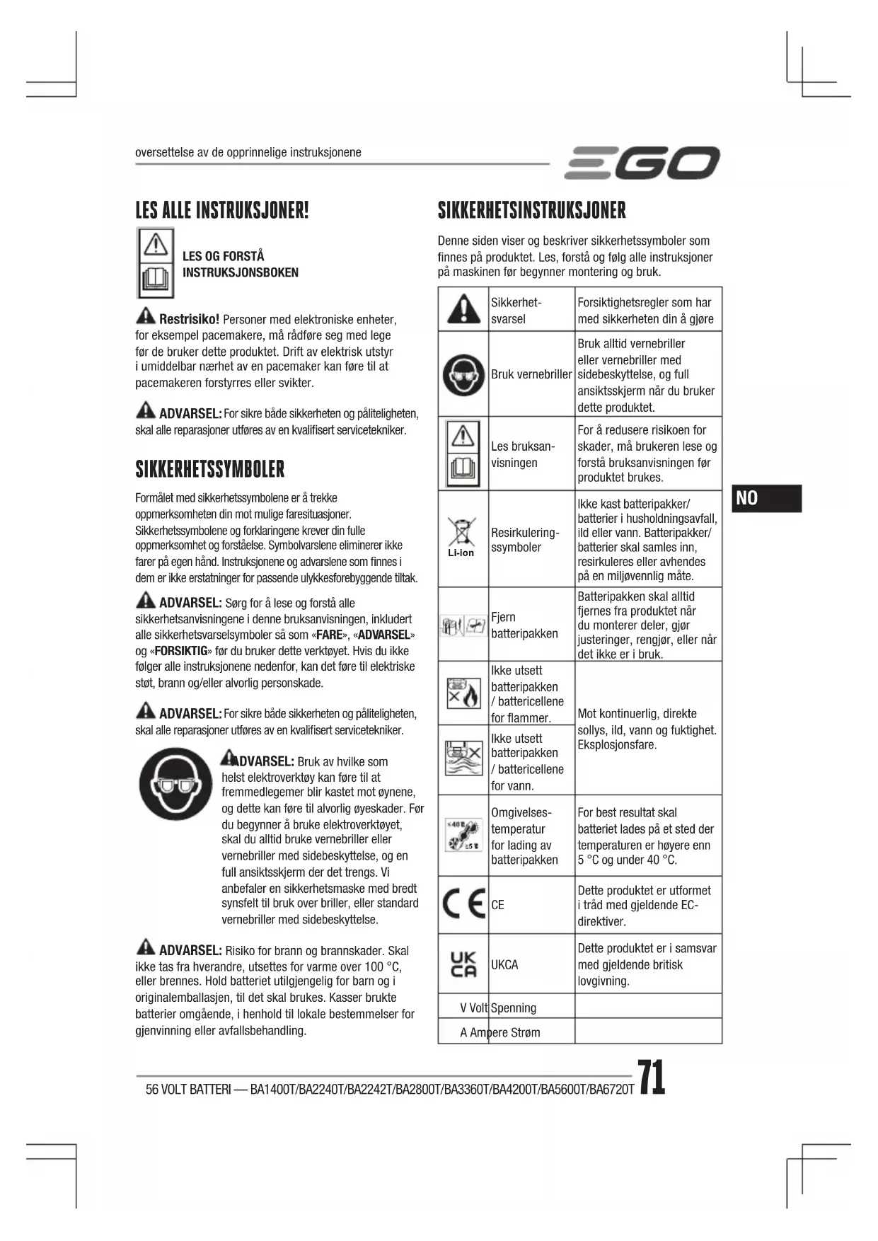 Følg instruksjonene i bruksanvisningen for det enkelte EGO-produktet. VEDLIKEHOLD ADVARSEL: For å unngå alvorlige personskader, skal batteripakken alltid tas ut fra verktøyet når du bytter tilbehør, rengjør eller utfører vedlikehold. ADVARSEL: Ved service, må du bare bruke identiske reservedeler fra EGO. Bruk av andre deler kan forårsake farer eller skader på produktet. ADVARSEL: Det anbefales ikke å bruke komprimert tørr luft som rengjøringsmetode for batteripakken. Hvis rengjøring med trykkluft er den eneste metoden man kan bruke, skal det alltid brukes vernebriller eller vernebriller med sidebeskyttelse. Hvis arbeidet er støvete, må det brukes støvmaske også. GENERELT VEDLIKEHOLD Unngå å bruke løsemidler når plastdeler skal rengjøres. De fleste plasttyper er utsatt for skader fra ulike typer kommersielle løsemidler, og kan ta skade av bruk av slike. Bruk rene kluter for å fjerne skitt, støv, olje, fett, osv. ADVARSEL: Ikke på noe tidspunkt skal bremsevæske, bensin, petroleum-baserte produkter, penetrerende oljer, osv. komme i kontakt med plastdeler. Kjemikalier kan skade, svekke eller ødelegge plastmaterialer, noe som kan føre til alvorlig personskade. ADVARSEL: FOR Å REDUSERE RISIKOEN FOR BRANN, PERSONLIG SKADE OG PRODUKTSKADE SOM FØLGE AV KORTSLUTNING SKAL DU ALDRI SENKE VERKTØYET DITT, BATTERIPAKKE ELLER LADER I VÆSKE ELLER FÅ VÆSKE I DEM. ETSENDE ELLER LEDENDE VÆSKER, SLIK SOM SJØVANN, ENKELTE INDUSTRIELLE KJEMIKALIER, BLEKEMIDLER ELLER MIDLER INNEHOLDENDE BLEKEMIDLER ETC. KAN FORÅRSAKE KORTSLUTNING. BATTERIER Batteripakken er utstyrt med lithium-ion oppladbare batterier. Brukstiden fra hver ladning vil avhenge av typen arbeid som utføres.Batteriene i dette verktøyet er designet for å gi maksimal, problemfri levetid. Akkurat som alle batterier, vil de slites ut etter hvert.Ikke demonter batteripakken eller forsøke å bytte ut batteriene. Håndtering av batteriene, spesielt når man bruker ringer og smykker kan resultere i alvorlig brannskade.For å få lengst mulig batterilevetid, skal man lese og forstå bruksanvisningen. č Det er god praksis å koble fra laderen og fjerne lithium-ion batteripakken når den ikke er i bruk. For lagring av lithium-ion batterier lenger enn 30 dager: Oppbevar lithium-ion batteripakken tørt og i temperaturer under 26 °C. č Lagre lithium-ion batterier med 30 % – 50 % ladekapasitet. č Hver sjette måned med lagring, skal lithium-ion batteripakken lades helst opp. č Eksteriøret kan rengjøres med en klut eller en myk, ikke-metallisk børste.56 VOLT BATTERI — BA1400T/BA2240T/BA2242T/BA2800T/BA3360T/BA4200T/BA5600T/BA6720T76