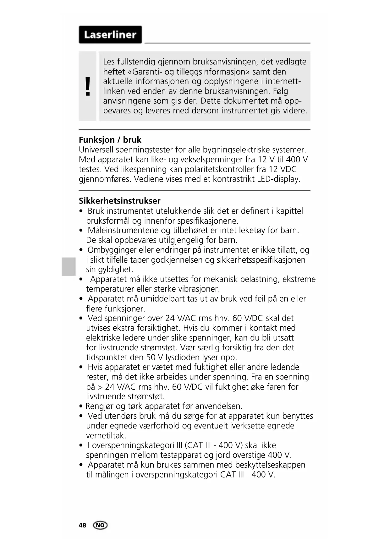 Funksjon / bruk Universell spenningstester for alle bygningselektriske systemer. Med apparatet kan like- og vekselspenninger fra 12 V til 400 V testes. Ved likespenning kan polaritetskontroller fra 12 VDC gjennomføres. Vediene vises med et kontrastrikt LED-display. Sikkerhetsinstrukser