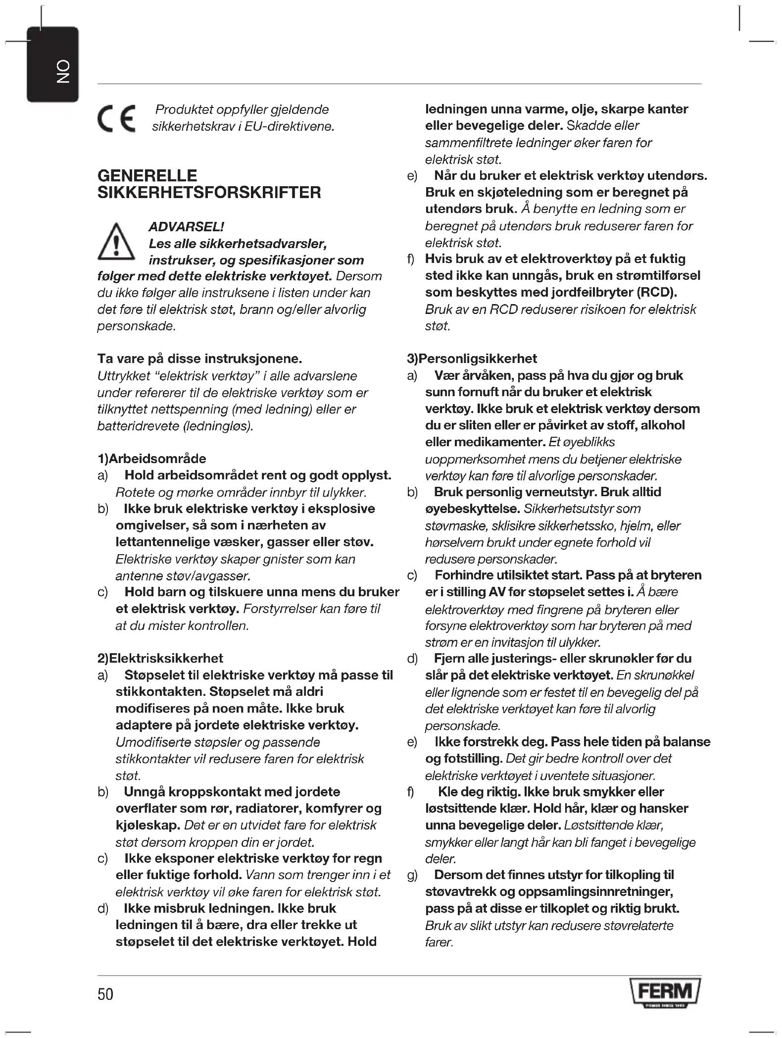 Produktet oppfyller gjeldende sikkerhetskrav i EU-direktivene. GENERELLE SIKKERHETSFORSKRIFTER ADVARSEL! Les alle sikkerhetsadvarsler, instrukser, og spesifikasjoner som følger med dette elektriske verktøyet. Dersom du ikke følger alle instruksene i listen under kan det føre til elektrisk støt, brann og/eller alvorlig personskade. Ta vare på disse instruksjonene. Uttrykket “elektrisk verktøy” i alle advarslene under refererer til de elektriske verktøy som er tilknyttet nettspenning (med ledning) eller er batteridrevete (ledningløs).