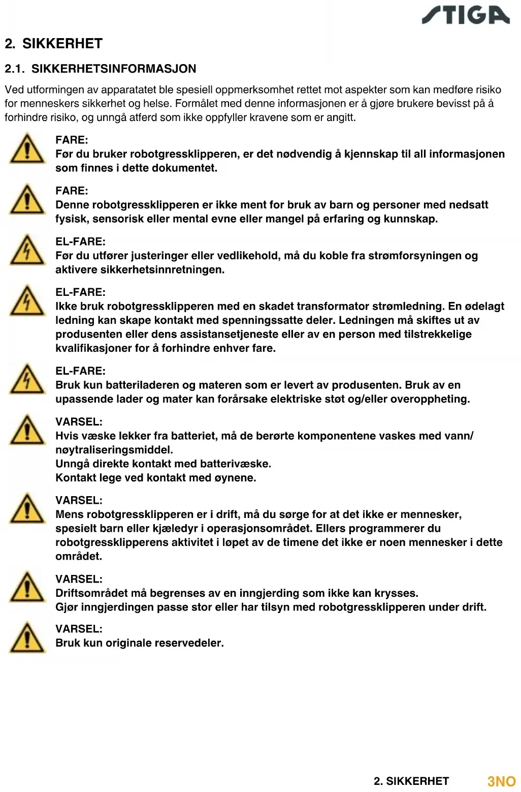 2.1. SIKKERHETSINFORMASJON Ved utformingen av apparatatet ble spesiell oppmerksomhet rettet mot aspekter som kan medføre risiko for menneskers sikkerhet og helse. Formålet med denne informasjonen er å gjøre brukere bevisst på å forhindre risiko, og unngå atferd som ikke oppfyller kravene som er angitt. FARE: Før du bruker robotgressklipperen, er det nødvendig å kjennskap til all informasjonen somnnesidettedokumentet. FARE: Denne robotgressklipperen er ikke ment for bruk av barn og personer med nedsatt fysisk, sensorisk eller mental evne eller mangel på erfaring og kunnskap. EL-FARE: Før du utfører justeringer eller vedlikehold, må du koble fra strømforsyningen og aktivere sikkerhetsinnretningen. EL-FARE: Ikke bruk robotgressklipperen med en skadet transformator strømledning. En ødelagt ledning kan skape kontakt med spenningssatte deler. Ledningen må skiftes ut av produsenten eller dens assistansetjeneste eller av en person med tilstrekkelige kvalikasjonerforåforhindreenhverfare. EL-FARE: Bruk kun batteriladeren og materen som er levert av produsenten. Bruk av en upassendeladerogmaterkanforårsakeelektriskestøtog/elleroveroppheting. VARSEL: Hvisvæskelekkerfrabatteriet,mådeberørtekomponentenevaskesmedvann/ nøytraliseringsmiddel. Unngå direkte kontakt med batterivæske. Kontakt lege ved kontakt med øynene. VARSEL: Mens robotgressklipperen er i drift, må du sørge for at det ikke er mennesker, spesielt barn eller kjæledyr i operasjonsområdet. Ellers programmerer du robotgressklipperens aktivitet i løpet av de timene det ikke er noen mennesker i dette området. VARSEL: Driftsområdet må begrenses av en inngjerding som ikke kan krysses. Gjør inngjerdingen passe stor eller har tilsyn med robotgressklipperen under drift. VARSEL: Bruk kun originale reservedeler.4 NO
