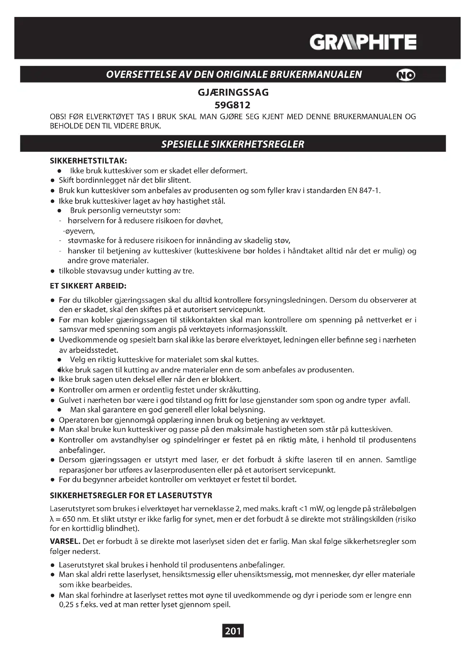 Laserutstyret som brukes i elverktøyet har verneklasse 2, med maks. kraft <1 mW, og lengde på strålebølgen λ = 650 nm. Et slikt utstyr er ikke farlig for synet, men er det forbudt å se direkte mot strålingskilden (risiko for en korttidlig blindhet). VARSEL. Det er forbudt å se direkte mot laserlyset siden det er farlig. Man skal følge sikkerhetsregler som følger nederst. Ɣ Laserutstyret skal brukes i henhold til produsentens anbefalinger. Ɣ Man skal aldri rette laserlyset, hensiktsmessig eller uhensiktsmessig, mot mennesker, dyr eller materiale som ikke bearbeides. Ɣ Man skal forhindre at laserlyset rettes mot øyne til uvedkommende og dyr i periode som er lengre enn 0,25 s f.eks. ved at man retter lyset gjennom speil. NO202 Ɣ Man skal alltid forsikre seg om laserlyset er rettet mot materialet som ikke har avspeilende overater. Et glisende stålblikk (eller andre materialer med avspeilende overater) gjør det umulig å bruke laserlyset, for da ville operatøren, andre mennesker og dyr være utsatt for en farlig lysavspeiling. Ɣ Lasersystemet skal ikke skiftes til et annet utstyr. Samtlige reparasjoner skal gjennomføres av produsenten eller en autorisert person.