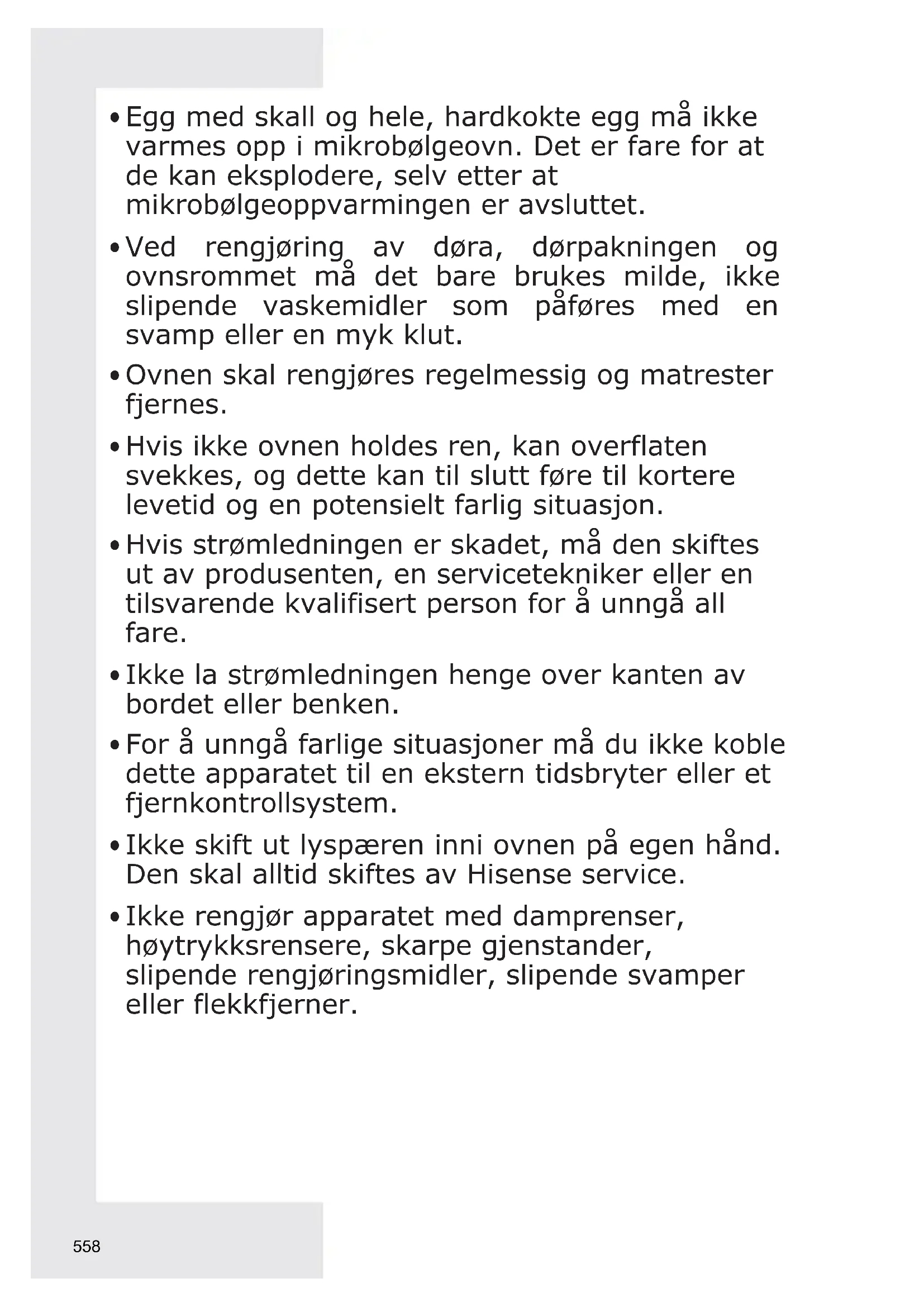 Ikke rengjør apparatet med damprenser, høytrykksrensere, skarpe gjenstander, slipende rengjøringsmidler, slipende svamper eller flekkfjerner. 558Som med alle tekniske hjelpemiddel er det en del regler som må følges for at denne ovnen skal gi deg toppytelse. Under finner du en liste over de viktigste: