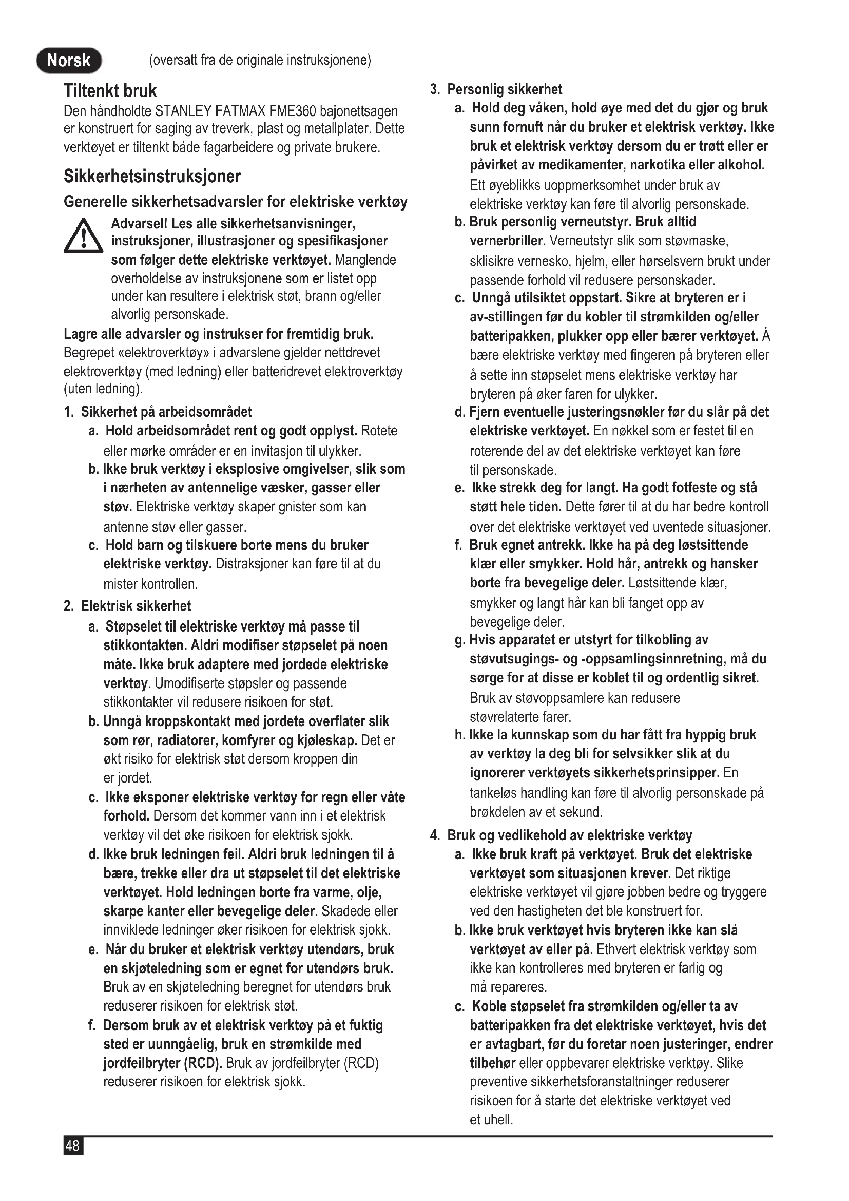 (oversatt fra de originale instruksjonene) Norsk (oversatt fra de originale instruksjonene) Tiltenkt bruk Den håndholdte STANLEY FATMAX FME360 bajonettsagen er konstruert for saging av treverk, plast og metallplater. Dette verktøyet er tiltenkt både fagarbeidere og private brukere. Sikkerhetsinstruksjoner Generelle sikkerhetsadvarsler for elektriske verktøy