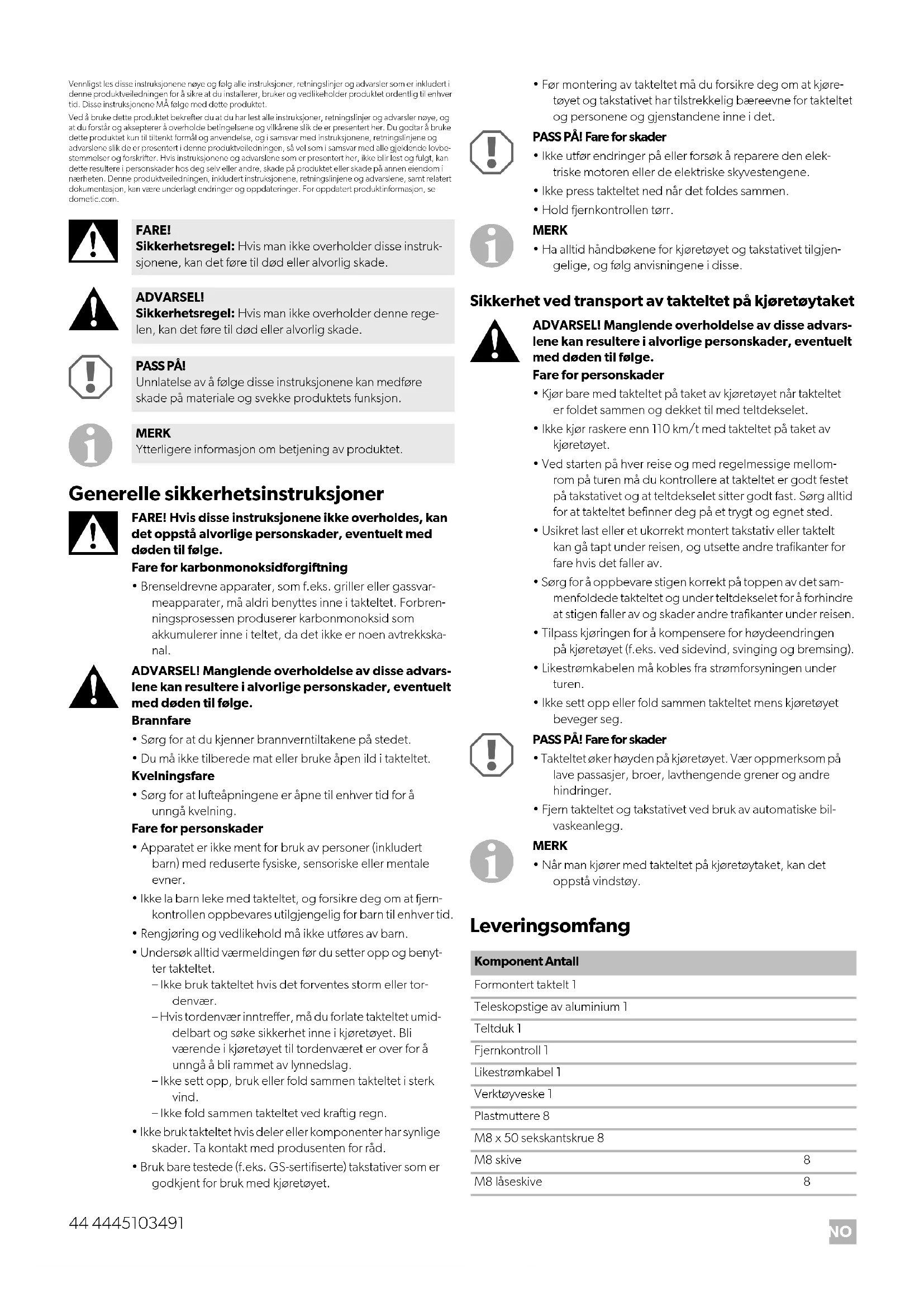 Når du tar produktet ut av drift for siste gang, må du sørge for å få informasjon om deponeringsforskrifter hos nærmeste resirkuleringsstasjon eller hos din faghandler. Garanti Lovmessig garantitid gjelder. Hvis produktet er defekt: Ta kontakt med din forhandler eller produsentens filial i ditt land (se dometic.com/dealer). ADVARSEL! Fare for personskader Forsikre deg om at ingen personer eller gjenstander befinner seg i takteltet før du folder det sammen. PASS PÅ! Materielle skader