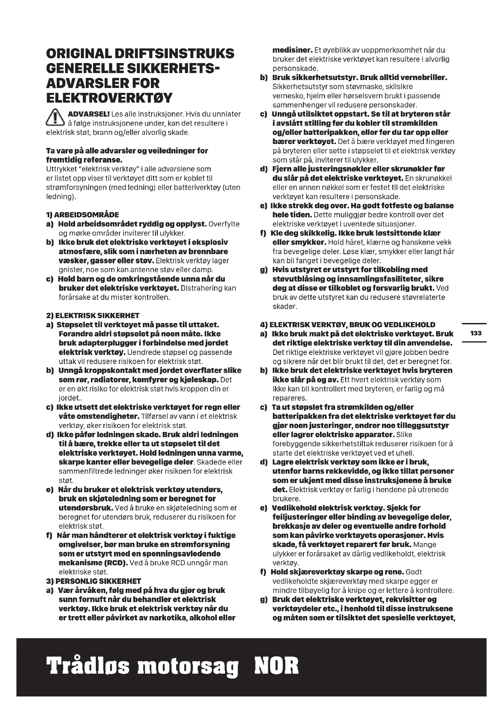 a) Ikke bruk makt på det elektriske verktøyet. Bruk det riktige elektriske verktøy til din anvendelse. Det riktige elektriske verktøyet vil gjøre jobben bedre og sikrere når det blir brukt til det, det er beregnet for. b) Ikke bruk det elektriske verktøyet hvis bryteren ikke slår på og av. Ett hvert elektrisk verktøy som ikke kan bli kontrollert med bryteren, er farlig og må repareres. c) Ta ut støpslet fra strømkilden og/eller batteripakken fra det elektriske verktøyet før du gjør noen justeringer, endrer noe tilleggsutstyr eller lagrer elektriske apparater. Slike forebyggende sikkerhetstiltak reduserer risikoen for å starte det elektriske verktøyet ved et uhell. d) Lagre elektrisk verktøy som ikke er i bruk, utenfor barns rekkevidde, og ikke tillat personer som er ukjent med disse instruksjonene å bruke det. Elektrisk verktøy er farlig i hendene på utrenede brukere. e) Vedlikehold elektrisk verktøy. Sjekk for feiljusteringer eller binding av bevegelige deler, brekkasje av deler og eventuelle andre forhold som kan påvirke verktøyets operasjoner. Hvis skade, få verktøyet reparert før bruk. Mange ulykker er forårsaket av dårlig vedlikeholdt, elektrisk verktøy. f) Hold skjæreverktøy skarpe og rene. Godt vedlikeholdte skjæreverktøy med skarpe egger er mindre tilbøyelig for å knipe og er lettere å kontrollere. g) Bruk det elektriske verktøyet, rekvisitter og verktøydeler etc., i henhold til disse instruksene og måten som er tilsiktet det spesielle verktøyet,134 Trådløs motorsag NOR i henhold til arbeidsforholdene og arbeidet som skal utføres. Bruk av det elektriske verktøyet til operasjoner det ikke er beregnet for, kan resultere i farlige situasjoner.