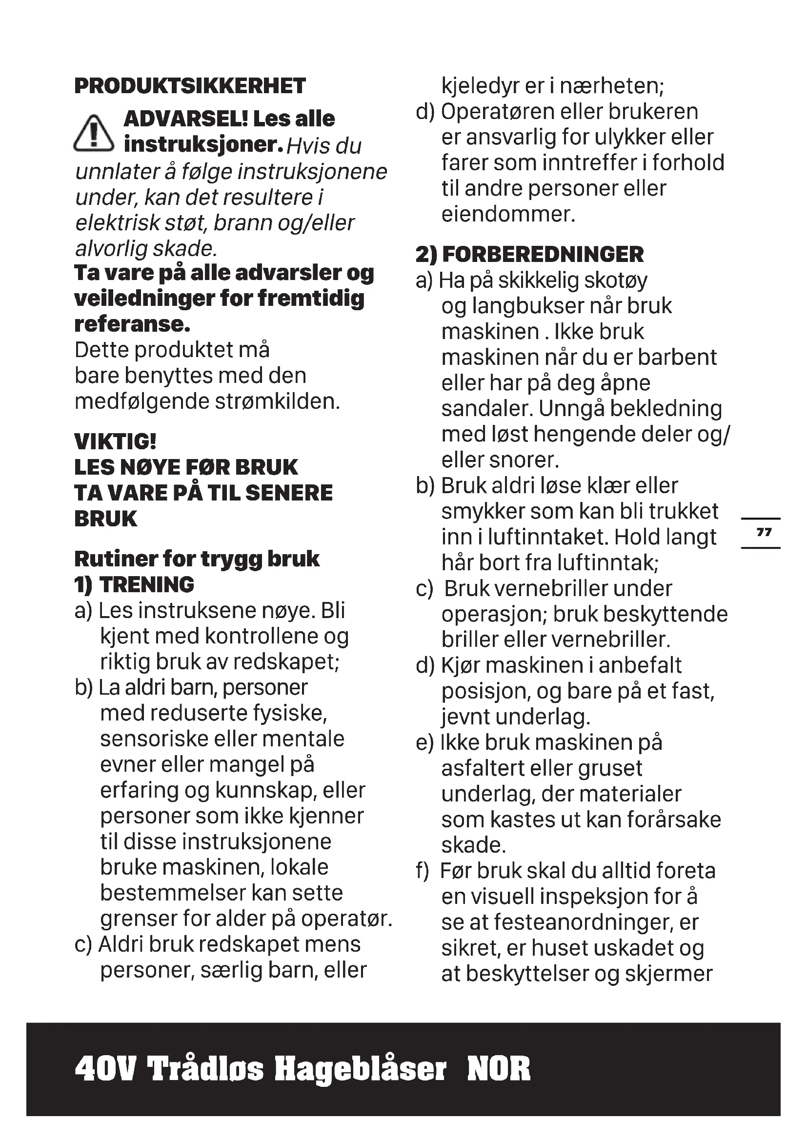 a) Ha på skikkelig skotøy og langbukser når bruk maskinen . Ikke bruk maskinen når du er barbent eller har på deg åpne sandaler. Unngå bekledning med løst hengende deler og/ eller snorer. b) Bruk aldri løse klær eller smykker som kan bli trukket inn i luftinntaket. Hold langt hår bort fra luftinntak; c) Bruk vernebriller under operasjon; bruk beskyttende briller eller vernebriller. d) Kjør maskinen i anbefalt posisjon, og bare på et fast, jevnt underlag. e) Ikke bruk maskinen på asfaltert eller gruset underlag, der materialer som kastes ut kan forårsake skade. f) Før bruk skal du alltid foreta en visuell inspeksjon for å se at festeanordninger, er sikret, er huset uskadet og at beskyttelser og skjermer40V Trådløs Hageblåser NOR