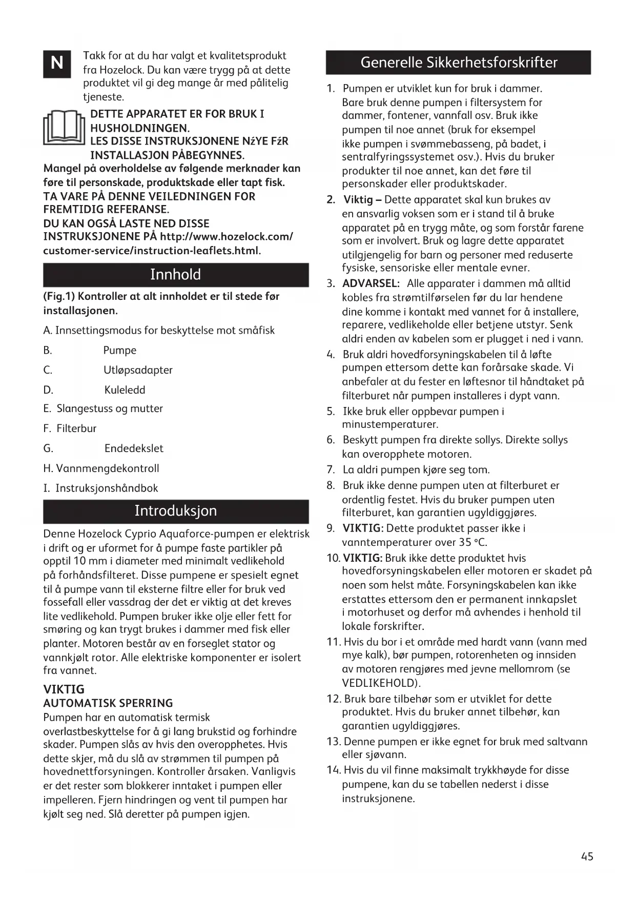 Introduksjon Denne Hozelock Cyprio Aquaforce-pumpen er elektrisk i drift og er uformet for å pumpe faste partikler på opptil 10 mm i diameter med minimalt vedlikehold på forhåndsfilteret. Disse pumpene er spesielt egnet til å pumpe vann til eksterne filtre eller for bruk ved fossefall eller vassdrag der det er viktig at det kreves lite vedlikehold. Pumpen bruker ikke olje eller fett for smøring og kan trygt brukes i dammer med fisk eller planter. Motoren består av en forseglet stator og vannkjølt rotor. Alle elektriske komponenter er isolert fra vannet. VIKTIG AUTOMATISK SPERRING Pumpen har en automatisk termisk overlastbeskyttelse for å gi lang brukstid og forhindre skader. Pumpen slås av hvis den overopphetes. Hvis dette skjer, må du slå av strømmen til pumpen på hovednettforsyningen. Kontroller årsaken. Vanligvis er det rester som blokkerer inntaket i pumpen eller impelleren. Fjern hindringen og vent til pumpen har kjølt seg ned. Slå deretter på pumpen igjen. Generelle Sikkerhetsforskrifter