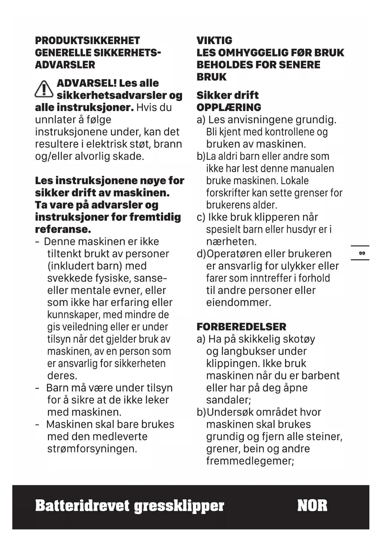 )La aldri barn eller andre som ikke har lest denne manualen bruke maskinen. Lokale forskrifter kan sette grenser for brukerens alder. c) Ikke bruk klipperen når spesielt barn eller husdyr er i nærheten. d)Operatøren eller brukeren er ansvarlig for ulykker eller farer som inntreffer i forhold til andre personer eller eiendommer. FORBEREDELSER a) Ha på skikkelig skotøy og langbukser under klippingen. Ikke bruk maskinen når du er barbent eller har på deg åpne sandaler; b)Undersøk området hvor maskinen skal brukes grundig og fjern alle steiner, grener, bein og andre fremmedlegemer;100 Batteridrevet gressklipper NOR c) Før bruk må du alltid undersøke maskinen for å se om skjærekniven, knivboltene og skjæremonteringen ikke er slitt eller skadet. Bytt slitte eller skadede kniver og bolter i par for å beholde balansen; Bytt ut ødelagte og uleselige etiketter. DRIFT a) Klipp kun i dagslys eller ved god kunstig belysning. b)Unngå om mulig å bruke maskinen i våt gress. c) Pass alltid på at du står støtt i skråninger. d)Gå, løp aldri. e) For roteringshjul maskiner, klipp på tvers av skråningen, aldri opp eller ned; f) Vær ekstra forsiktig når du endrer retning i skråninger. g)Ikke bruk klipperen i meget bratte skråninger. h)Vær ekstra forsiktig når du kjører i revers, eller når du trekker maskinen mot deg.