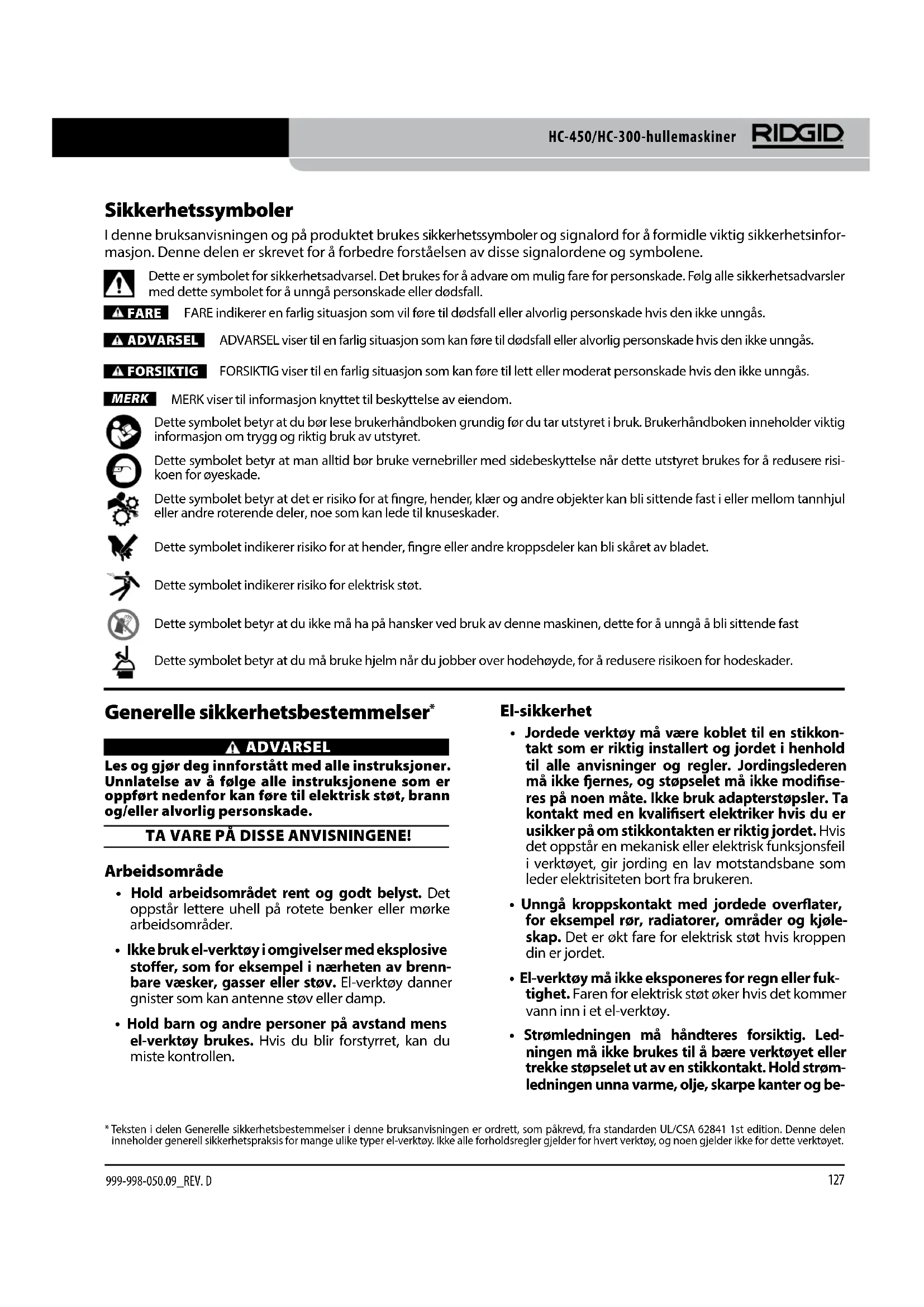 - Teksten i delen Generelle sikkerhetsbestemmelser i denne bruksanvisningen er ordrett, som påkrevd, fra standarden UL/CSA 62841 1st edition. Denne delen inneholder generell sikkerhetspraksis for mange ulike typer el-verktøy. Ikke alle forholdsregler gjelder for hvert verktøy, og noen gjelder ikke for dette verktøyet.128 HC-450/HC-300-hullemaskiner 999-998-050.09_REV. Dvegelige deler. Bytt umiddelbart ut skadede led- ninger. Skadede ledninger øker faren for elektrisk støt.