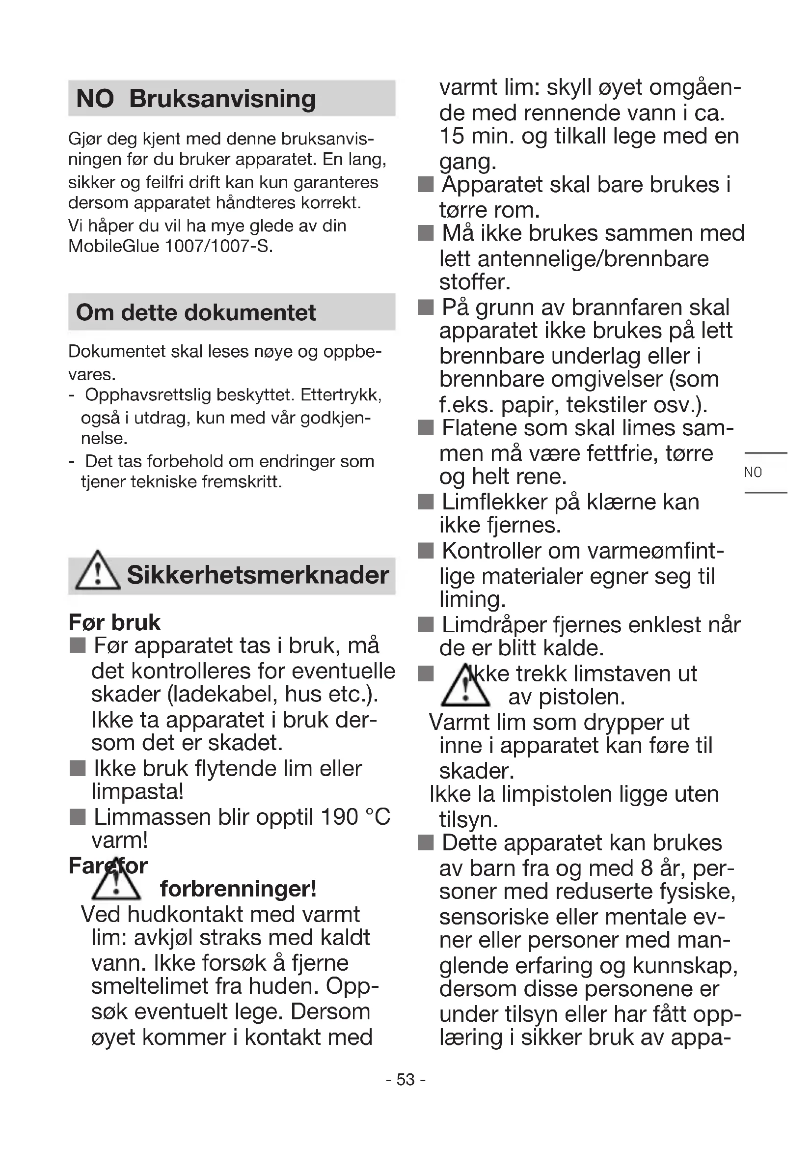TAKUU VALMISTAJAN VUODEN TAKUU VALMISTAJAN VUODEN TAKUU- 53 - NO Bruksanvisning Gjør deg kjent med denne bruksanvis- ningen før du bruker apparatet. En lang, sikker og feilfri drift kan kun garanteres dersom apparatet håndteres korrekt. Vi håper du vil ha mye glede av din MobileGlue 1007/1007-S. Om dette dokumentet Dokumentet skal leses nøye og oppbe- vares. - Opphavsrettslig beskyttet. Ettertrykk, også i utdrag, kun med vår godkjen- nelse. - Det tas forbehold om endringer som tjener tekniske fremskritt. Før bruk Før apparatet tas i bruk, må det kontrolleres for eventuelle skader (ladekabel, hus etc.). Ikke ta apparatet i bruk der- som det er skadet. Ikke bruk flytende lim eller limpasta! Limmassen blir opptil 190 °C varm! Fare for forbrenninger! Ved hudkontakt med varmt lim: avkjøl straks med kaldt vann. Ikke forsøk å fjerne smeltelimet fra huden. Opp- søk eventuelt lege. Dersom øyet kommer i kontakt med Sikkerhetsmerknader varmt lim: skyll øyet omgåen- de med rennende vann i ca. 15 min. og tilkall lege med en gang. Apparatet skal bare brukes i tørre rom. Må ikke brukes sammen med lett antennelige/brennbare stoffer. På grunn av brannfaren skal apparatet ikke brukes på lett brennbare underlag eller i brennbare omgivelser (som f.eks. papir, tekstiler osv.). Flatene som skal limes sam- men må være fettfrie, tørre og helt rene. Limflekker på klærne kan ikke fjernes. Kontroller om varmeømfint- lige materialer egner seg til liming. Limdråper fjernes enklest når de er blitt kalde. Ikke trekk limstaven ut av pistolen. Varmt lim som drypper ut inne i apparatet kan føre til skader. Ikke la limpistolen ligge uten tilsyn. Dette apparatet kan brukes av barn fra og med 8 år, per- soner med reduserte fysiske, sensoriske eller mentale ev- ner eller personer med man- glende erfaring og kunnskap, dersom disse personene er under tilsyn eller har fått opp- læring i sikker bruk av appa- NO- 54 - ratet og har forstått farene ved bruk av apparatet. Barn skal ikke leke med ap- paratet. Rengjøring og vedli- kehold skal ikke utføres av barn uten tilsyn. En feilfri funksjon kan kun garanteres ved bruk av origi- nale limstaver fra STEINEL. USB-ladekabel Hold ladekabelen ren. Smuss utgjør fare for elektrisk støt. Oppbevar apparatet ved temperaturer mellom 0 °C og 35 °C. Lad opp apparatet kun med den vedlagte USB-ladeka- belen (fra type 15.3841). Ikke lad opp batterier av fremmed fabrikat. I motsatt fall er det fare for brann og eksplosjon. Oppladbart batteri Apparatet og batteriet skal ikke åpnes. Fare for kortslut- ning. Batteriet må ikke tas ut. Henvend deg til salgsstedet dersom det skulle oppstå problemer. Litium-ione batteriet kan lades opp til enhver tid uten at dette forkorter levetiden. Batteriet tar ikke skade der- som ladingen avbrytes. Skal apparatet ikke brukes over lengre tid, bør det legges bort med oppladet batteri. Dette forlenger litium-ione batteriets levetid. Forskriftsmessig bruk Dette elektriske verktøyet skal kun brukes sammen med løsemiddelfritt lim til liming av hobbymaterialer og modell- byggdeler til privat bruk. Dersom batteriet brukes på feil måte eller skades, kan det sive ut damp. Oppsøk lege ved ubehag og sørg for tilførsel av frisk luft. Dampene kan irritere luftveiene. Bruksområde Batteridrevet limpistol med litium-ione- batteri. Limer alt - ideell til reparasjoner, dekorering og hobbyarbeid. Egner seg til: papir, papp, kork, tre, lær, tekstil, plast, keramikk, skumstoff, fliser...- 55 - Apparatbeskrivelse USB-ladekabel LED-indikator Uttak til ladekabel AV/PÅ-knapp Fremtrekk - avtrekk Limstav Funksjon og bruk ■ Lad helt opp (2-3 t.) før første gangs bruk, for å forlenge batterienes leve- tid. (se Lading/drift) ■ Stikk limstaven inn i oppvarmingska- nalen på baksiden. ■ Ved første gangs bruk må du trykke på fremtrekket flere ganger for å fylle kammeret med lim. Eventuelt kan du presse limstaven litt forover. ■ For å unngå at apparatet slås på utilsiktet, må du trykke på knappen i ca. 2 sekunder. Grønn LED blinker i 15 sek. ■ Trykk på fremtrekket og påfør lim på den ene siden. ■ Press delene som skal limes, hardt sammen og korriger om nødvendig. ■ Limforbindelsen kan belastes alt etter kort tid (ca. 2 minutter)! ■ Til lange deler med store flater anbe- fales punktliming. ■ Hardskum (f.eks. isopor) kan bear- beides uten problemer. Det eneste du må være oppmerksom på, er at det varme limet skal påføres underlaget og ikke isoporen. ■ Til liming av tekstiler o.l. materialer anbefales det å påføre limet i «slangelinjer». ■ La apparatet avkjøles etter bruk. Lade / drift Batteriet til MobileGlue 1007/1007-S leveres delvis oppladet. Før første gangs bruk skal batteriet lades helt opp (ca. 2-3 timer), slik at full effekt er garantert. MobileGlue 1007/1007-S kan ikke bru- kes under lading. Batteriet tar ikke skade dersom ladingen avbrytes. Det kan til enhver tid lades opp, uten at dette forkorter levetiden. «Elektronic Cell Protection (ECP)» be- skytter batteriet mot full utlading. Er batteriet tomt, slår en vernekrets av Mo- bileGlue 1007/1007-S, og limet varmes ikke lenger opp. NO- 56 - Lading USB-ladeapparat Knapp LED rød LED grønn PÅ/AV Lading batteri Apparatet er driftsklart for en begrenset tid Lading avsluttet, batteriet er fulladet Drift/liming Knapp LED 'rød LED grønn PÅ Slå på. Trykk på knappen i ca. 2 sek. Grønn LED blinker i 15 sek. Apparatet er klart til drift Ved hver limeomgang startes alltid et 5 minutters intervall Ingen liming på 5 minutter Apparatet slår seg av Slå på apparatet igjen ved å trykke på knappen Rød og grønn LED blinker avvekslende etter ca. 20 min. driftstid. Apparatet er nå driftsklart i ca. 10 min. Rød LED blinker 1× Batteriet er tomt, start lading med USB-ladeap- paratet Mål (h × b × d): MobileGlue 1007 MobileGlue 1007-S 157×47×158 mm 179×40x65 mm Batteri: litium-ion Batterispenning, kapasitet: 3,6V, 1,5Ah Batteriets virke