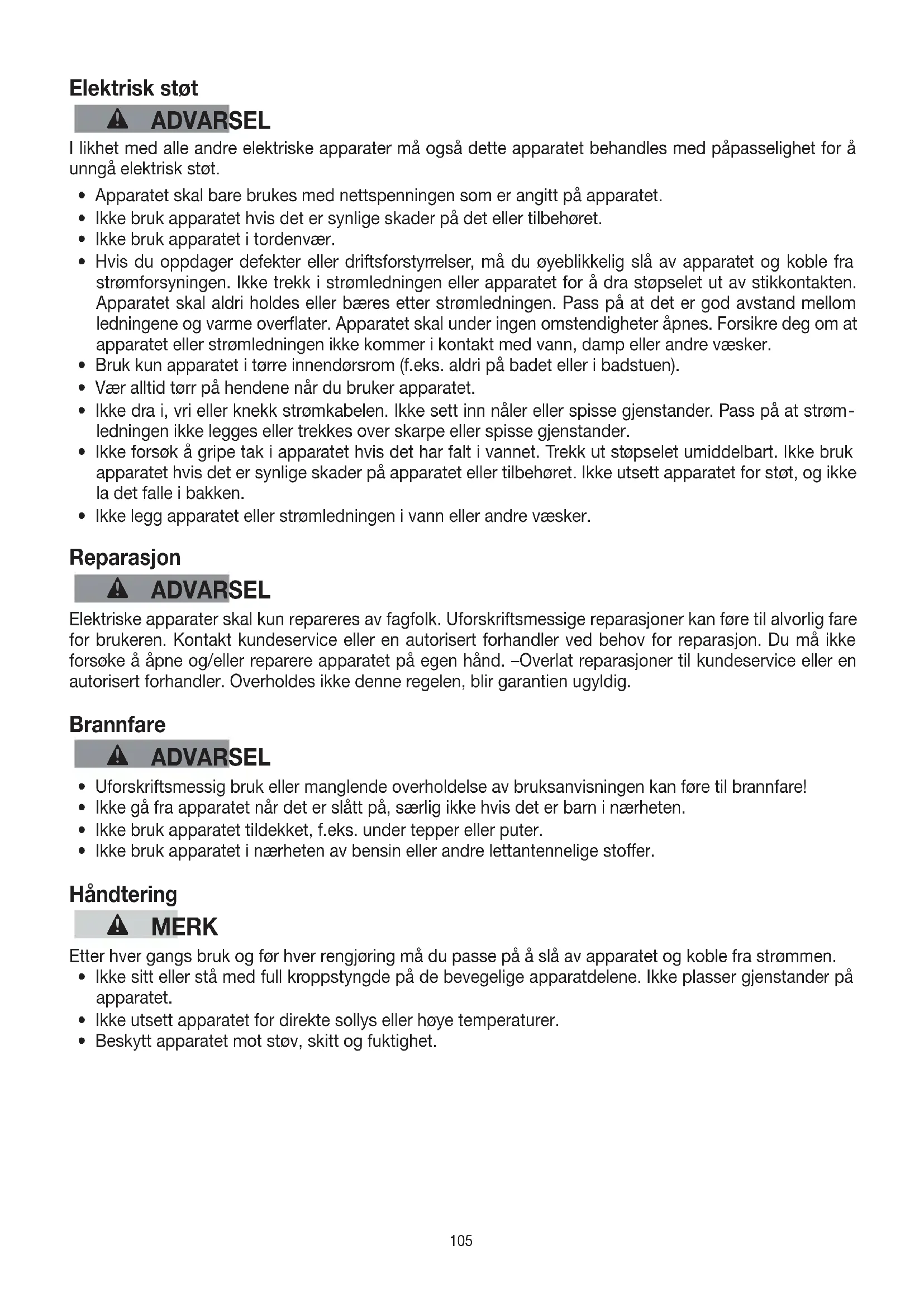 - Ikke legg apparatet eller strømledningen i vann eller andre væsker. Reparasjon ADVARSEL Elektriske apparater skal kun repareres av fagfolk. Uforskriftsmessige reparasjoner kan føre til alvorlig fare for brukeren. Kontakt kundeservice eller en autorisert forhandler ved behov for reparasjon. Du må ikke forsøke å åpne og/eller reparere apparatet på egen hånd. –Overlat reparasjoner til kundeservice eller en autorisert forhandler. Overholdes ikke denne regelen, blir garantien ugyldig. Brannfare ADVARSEL