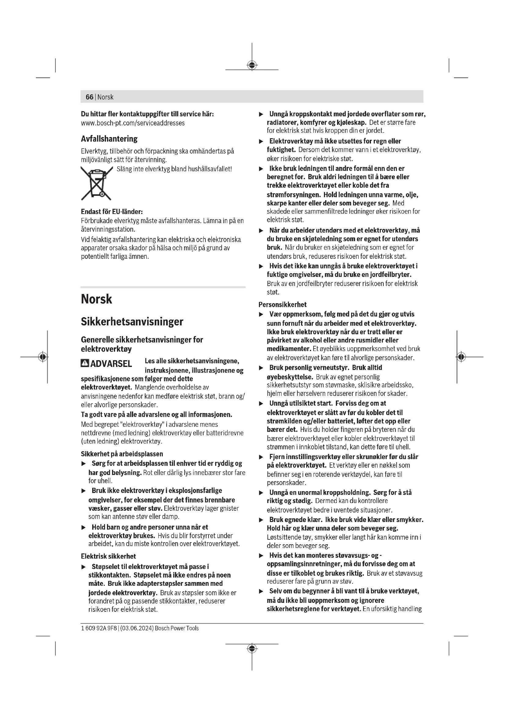 Vibrasjonsnivået og støyemisjonen som er angitt i disse anvisningene er målt i samsvar med en standardisert målemetode og kan brukes til sammenligning av elektroverktøy. Verdiene egner seg også til en foreløpig estimering av vibrasjonsnivået og støyutslippet. Angitt vibrasjonsnivå og støyutslipp representerer de hovedsakelige bruksområdene til elektroverktøyet. Men hvis elektroverktøyet brukes til andre formål, med andre innsatsverktøy eller utilstrekkelig vedlikehold, kan vibrasjonsnivået og støyutslippet avvike fra det som er angitt. Dette kan føre til en betydelig økning av vibrasjonsnivået og støyutslippet for hele arbeidstidsrommet. For en nøyaktig vurdering av vibrasjonsnivået og støyutslippet skal det også tas hensyn til de tidene verktøyet er slått av, eller går, men ikke faktisk er i bruk. Dette kan redusere vibrasjonsnivået og støyutslippet for hele arbeidstidsrommet betraktelig. Bestem ekstra sikkerhetstiltak til beskyttelse av brukeren mot vibrasjonenes virkning, som for eksempel: Vedlikehold av elektroverktøy og innsatsverktøy, holde hendene varme, organisere arbeidsforløpene. Montering u Bruk kun sagblad med en maksimal godkjent hastighet som er høyere enn elektroverktøyets tomgangsturtall. Sette på / bytte sirkelsagblad u Før alle arbeider på elektroverktøyet utføres må støpselet trekkes ut av stikkontakten. u Bruk vernehansker ved montering av sagbladet. Ved berøring av sagbladet er det fare for skader. Bosch Power Tools 1 609 92A 9F8 | (03.06.2024)70 | Norsk u Bruk kun sagblad som tilsvarer de tekniske dataene som er angitt i denne bruksanvisningen og på elektroverktøyet og som er kontrollert jf. EN 847-1:2017 og tilsvarende markert. u Det tillatte turtallet til innsatsverktøyet må være minst like høyt som maksimumsturtallet som er angitt på elektroverktøyet. Tilbehør som dreies hurtigere enn godkjent, kan brekke og slynges rundt. u Bruk aldri slipeskiver som innsatsverktøy. Velge sagblad Du finner en oversikt over anbefalte sagblad sist i denne veiledningen. Ta av sagblad (se bilde A) Når du skal bytte verktøy, er det best å legge elektroverktøyet på fronten av motorhuset. – Trykk på spindellåseknappen (4), og hold den inne. u Du må bare trykke på spindellåseknappen (4) når sagspindelen er stoppet. Elektroverktøyet kan ta skade hvis det velter. – Skru spennskruen (18) ut i dreieretningen ➊ med unbrakonøkkelen (17). – Sving pendelvernedekselet (11) tilbake, og hold det fast. – Ta spennflensen (19) og sagbladet (20) fra sagspindelen (22). Sette på sagblad (se bilde A) Når du skal bytte verktøy, er det best å legge elektroverktøyet på fronten av motorhuset. – Rengjør sagbladet (20) og alle fastspenningsdelene som skal monteres. – Sving pendelvernedekselet (11) tilbake, og hold det fast. – Sett sagbladet (20) på festeflensen (21). Tennenes kutteretning (pilens retning på sagbladet) og dreieretningspilen på vernedekselet (11) må stemme overens. – Sett på spennflensen (19), og skru inn spennskruen (18) i dreieretningen ➋. Vær oppmerksom på riktig monteringsposisjon for festeflensen (21) og spennflensen (19). – Trykk på spindellåseknappen (4), og hold den inne. – Stram spennskruen (18) i dreieretningen ➋ med unbrakonøkkelen (17). Tiltrekkingsmomentet skal være 6–9Nm, noe som tilsvarer fingerstramt i tillegg til ¼ omdreining. Støv-/sponavsuging Støv fra materialer som blyholdig maling, noen tresorter, mineraler og metall kan være helsefarlige. Berøring eller innånding av støv kan utløse allergiske reaksjoner og/eller åndedrettssykdommer hos brukeren eller personer som befinner seg i nærheten. Visse typer støv som eike- eller bøkestøv gjelder som kreftfremkallende, spesielt i kombinasjon med tilsetningsstoffer til trebearbeidelse (kromat, trebeskyttelsesmidler). Asbestholdig materiale må kun bearbeides av fagfolk. – Bruk helst et støvavsug som er egnet for dette materialet. – Sørg for god ventilasjon av arbeidsplassen. – Det anbefales å bruke en støvmaske med filterklasse P2. Følg ditt lands gyldige forskrifter for de materialene som skal bearbeides. u Unngå støv på arbeidsplassen. Støv kan lett antennes. Montere støvsugeradapter (se bilde B) Skyv støvsugeradapteren (23) på sponutkastet (14) til den låses. En støvsugerslange med diameter på 35 mm kan kobles til støvsugeradapteren (23). u Støvsugeradapteren må ikke monteres uten tilkoblet eksternt avsug. Det kan føre til at sugekanalen tilstoppes. u Det må ikke kobles en støvsekk til støvsugeradapteren. Det kan føre til tilstopping av avsugssystemet. Rengjør støvsugeradapteren (23) jevnlig for å sikre optimal sugeeffekt. Eksternt avsug Koble sugeslangen til en støvsuger (tilbehør). Du finner en oversikt over tilkobling til forskjellige støvsugere sist i denne veiledningen. Elektroverktøyet kan kobles direkte til en stikkontakt på en Bosch universalsuger med fjernstart. Denne starter automatisk når elektroverktøyet slås på. Støvsugeren må være egnet til materialet som skal bearbeides. Ved oppsuging av spesielt helsefarlig, kreftfremkallende eller tørt støv må du bruke en spesialstøvsuger. Bruk u Før alle arbeider på elektroverktøyet utføres må støpselet trekkes ut av stikkontakten. Driftsmoduser Stille inn sagedybden (se bilde C) u Tilpass kuttedybden til tykkelsen på emnet. Mindre enn en full tannhøyde bør være synlig under emnet. Løsne spennspaken (24). For mindre kuttedybde trekker du sagen bort fra grunnplaten (12), og for større kuttedybde trykker du sagen mot grunnplaten (12). Still inn ønsket mål på skalaen for kuttedybde. Stram spennspaken (24) igjen. Hvis det ikke er mulig å justere kuttedybden ordentlig etter at du har løsnet på spennspaken (24), trekker du spennspaken (24) bort fra sagen og svinger den ned. Slipp spennspaken (24) igjen. Gjenta denne prosedyren til ønsket kuttedybde kan stilles inn. Hvis det ikke er mulig å låse