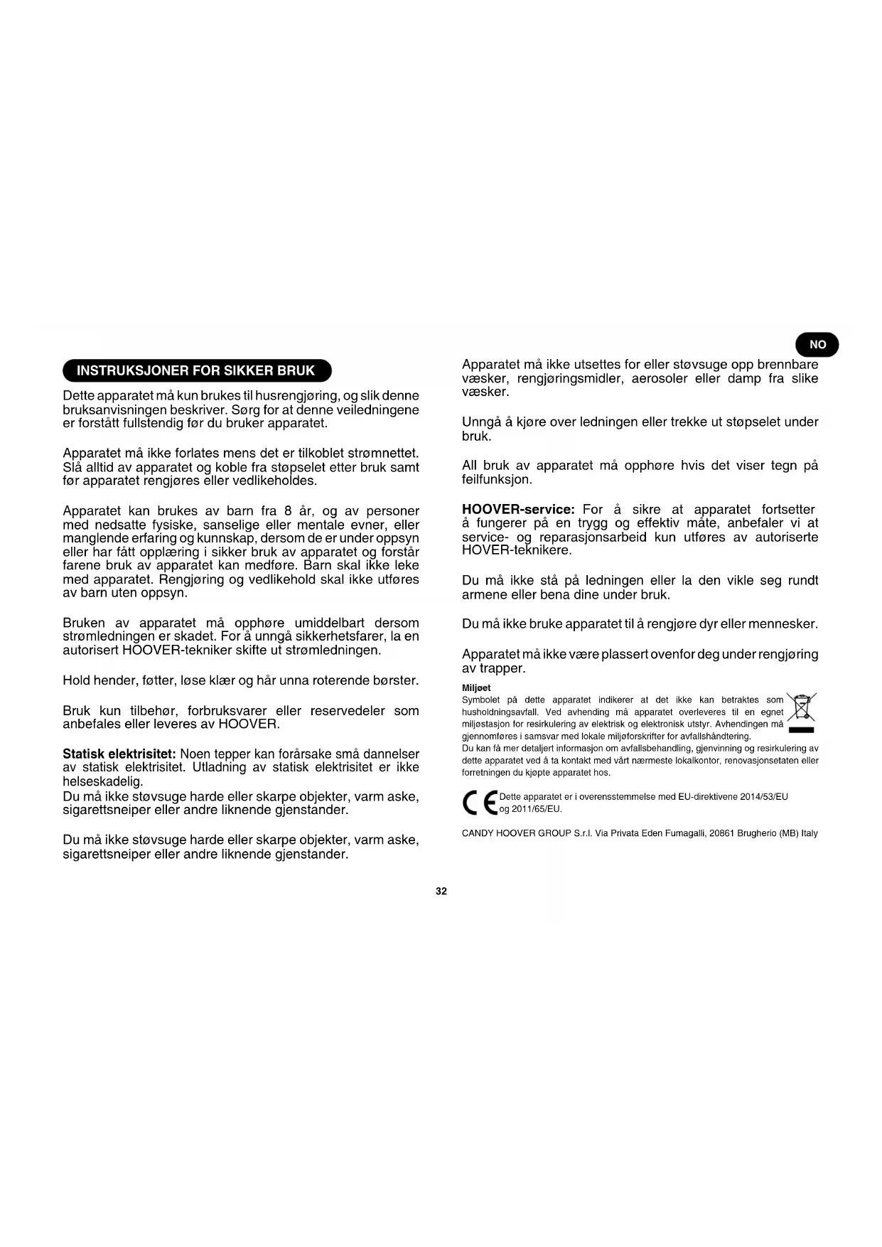 Dette apparatet må kun brukes til husrengjøring, og slik denne bruksanvisningen beskriver. Sørg for at denne veiledningene er forstått fullstendig før du bruker apparatet. Apparatet må ikke forlates mens det er tilkoblet strømnettet. Slå alltid av apparatet og koble fra støpselet etter bruk samt før apparatet rengjøres eller vedlikeholdes. Apparatet kan brukes av barn fra 8 år, og av personer med nedsatte fysiske, sanselige eller mentale evner, eller manglende erfaring og kunnskap, dersom de er under oppsyn eller har fått opplæring i sikker bruk av apparatet og forstår farene bruk av apparatet kan medføre. Barn skal ikke leke med apparatet. Rengjøring og vedlikehold skal ikke utføres av barn uten oppsyn. Bruken av apparatet må opphøre umiddelbart dersom strømledningen er skadet. For å unngå sikkerhetsfarer, la en autorisert HOOVER-tekniker skifte ut strømledningen. Hold hender, føtter, løse klær og hår unna roterende børster. Bruk kun tilbehør, forbruksvarer eller reservedeler som anbefales eller leveres av HOOVER. Statisk elektrisitet: Noen tepper kan forårsake små dannelser av statisk elektrisitet. Utladning av statisk elektrisitet er ikke helseskadelig. Du må ikke støvsuge harde eller skarpe objekter, varm aske, sigarettsneiper eller andre liknende gjenstander. Du må ikke støvsuge harde eller skarpe objekter, varm aske, sigarettsneiper eller andre liknende gjenstander. Apparatet må ikke utsettes for eller støvsuge opp brennbare væsker, rengjøringsmidler, aerosoler eller damp fra slike væsker. Unngå å kjøre over ledningen eller trekke ut støpselet under bruk. All bruk av apparatet må opphøre hvis det viser tegn på feilfunksjon. HOOVER-service: For å sikre at apparatet fortsetter å fungerer på en trygg og effektiv måte, anbefaler vi at service- og reparasjonsarbeid kun utføres av autoriserte HOVER-teknikere. Du må ikke stå på ledningen eller la den vikle seg rundt armene eller bena dine under bruk. Du må ikke bruke apparatet til å rengjøre dyr eller mennesker. Apparatet må ikke være plassert ovenfor deg under rengjøring av trapper. Miljøet Symbolet på dette apparatet indikerer at det ikke kan betraktes som husholdningsavfall. Ved avhending må apparatet overleveres til en egnet miljøstasjon for resirkulering av elektrisk og elektronisk utstyr. Avhendingen må gjennomføres i samsvar med lokale miljøforskrifter for avfallshåndtering. Du kan få mer detaljert informasjon om avfallsbehandling, gjenvinning og resirkulering av dette apparatet ved å ta kontakt med vårt nærmeste lokalkontor, renovasjonsetaten eller forretningen du kjøpte apparatet hos. Dette apparatet er i overensstemmelse med EU-direktivene 2014/53/EU og 2011/65/EU. CANDY HOOVER GROUP S.r.l. Via Privata Eden Fumagalli, 20861 Brugherio (MB) Italy NO33