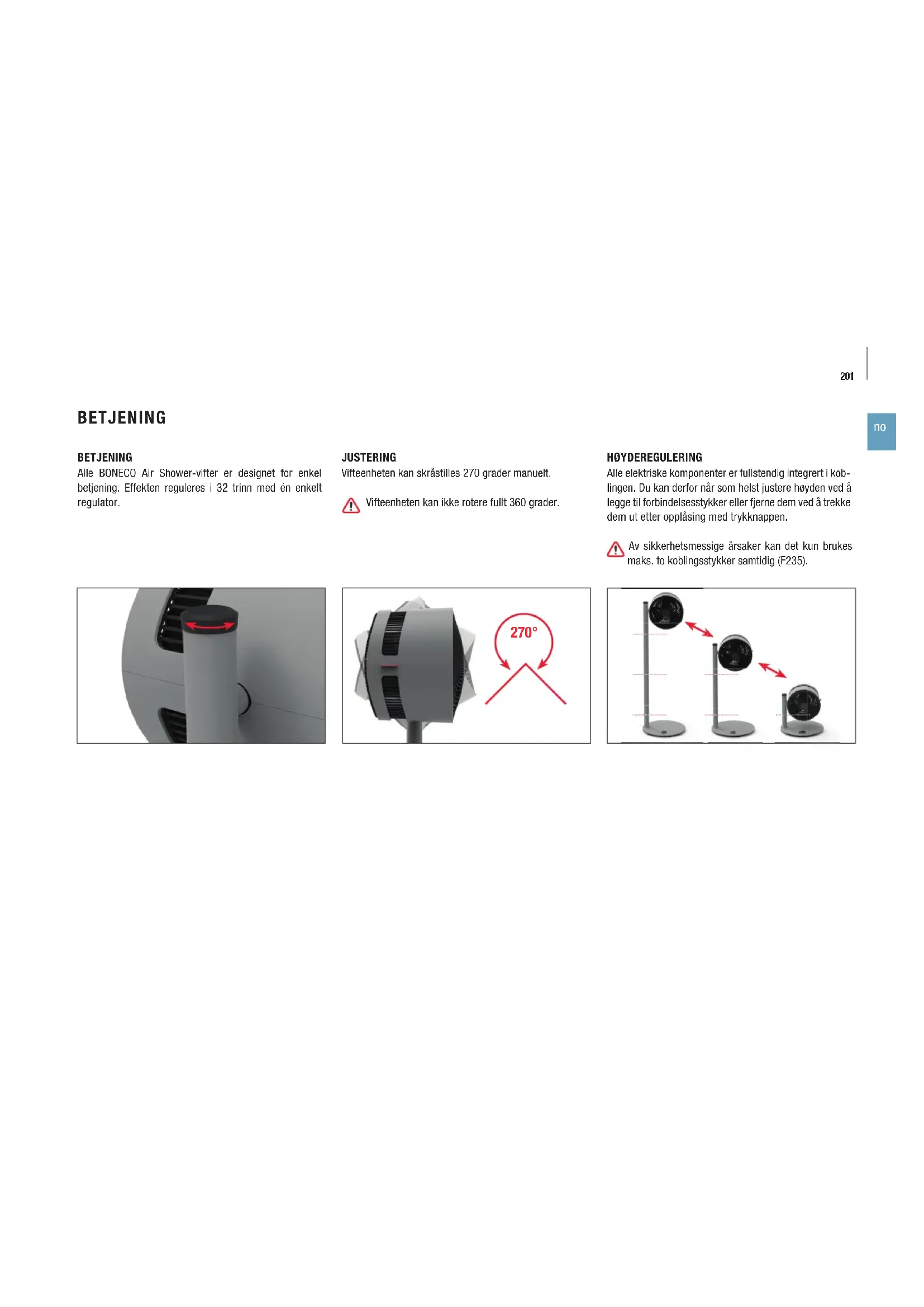 BETJENING Alle BONECO Air Shower-vifter er designet for enkel betjening. Effekten reguleres i 32 trinn med én enkelt regulator. JUSTERING Vifteenheten kan skråstilles 270 grader manuelt. Vifteenheten kan ikke rotere fullt 360 grader. HØYDEREGULERING Alle elektriske komponenter er fullstendig integrert i kob- lingen. Du kan derfor når som helst justere høyden ved å legge til forbindelsesstykker eller fjerne dem ved å trekke dem ut etter opplåsing med trykknappen. Av sikkerhetsmessige årsaker kan det kun brukes maks. to koblingsstykker samtidig (F235). BETJENING 270°202