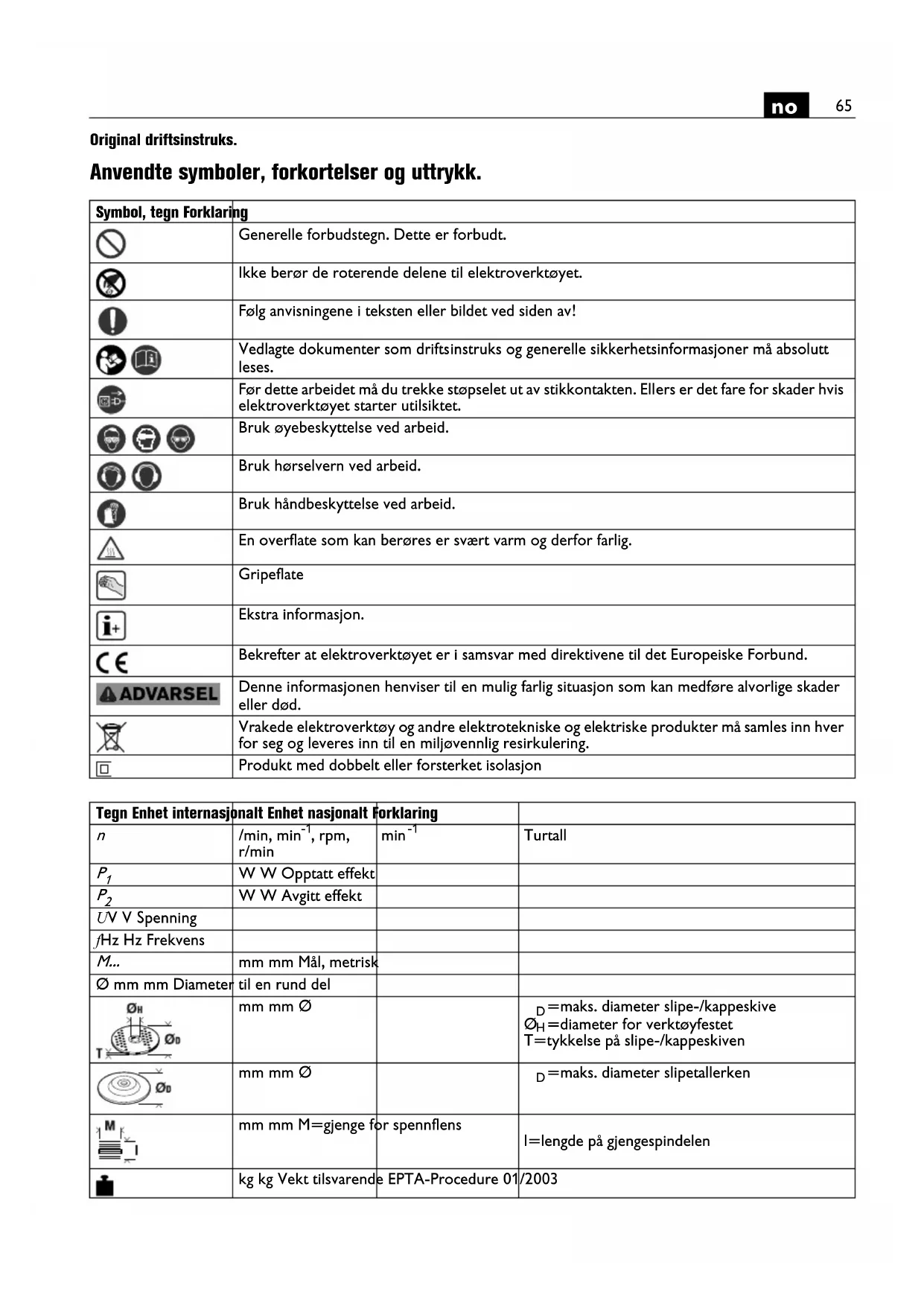 Original driftsinstruks. Anvendte symboler, forkortelser og uttrykk. Symbol, tegn Forklaring Generelle forbudstegn. Dette er forbudt. Ikke berør de roterende delene til elektroverktøyet. Følg anvisningene i teksten eller bildet ved siden av! Vedlagte dokumenter som driftsinstruks og generelle sikkerhetsinformasjoner må absolutt leses. Før dette arbeidet må du trekke støpselet ut av stikkontakten. Ellers er det fare for skader hvis elektroverktøyet starter utilsiktet. Bruk øyebeskyttelse ved arbeid. Bruk hørselvern ved arbeid. Bruk håndbeskyttelse ved arbeid. En overflate som kan berøres er svært varm og derfor farlig. Gripeflate Ekstra informasjon. Bekrefter at elektroverktøyet er i samsvar med direktivene til det Europeiske Forbund. Denne informasjonen henviser til en mulig farlig situasjon som kan medføre alvorlige skader eller død. Vrakede elektroverktøy og andre elektrotekniske og elektriske produkter må samles inn hver for seg og leveres inn til en miljøvennlig resirkulering. Produkt med dobbelt eller forsterket isolasjon Tegn Enhet internasjonalt Enhet nasjonalt Forklaring