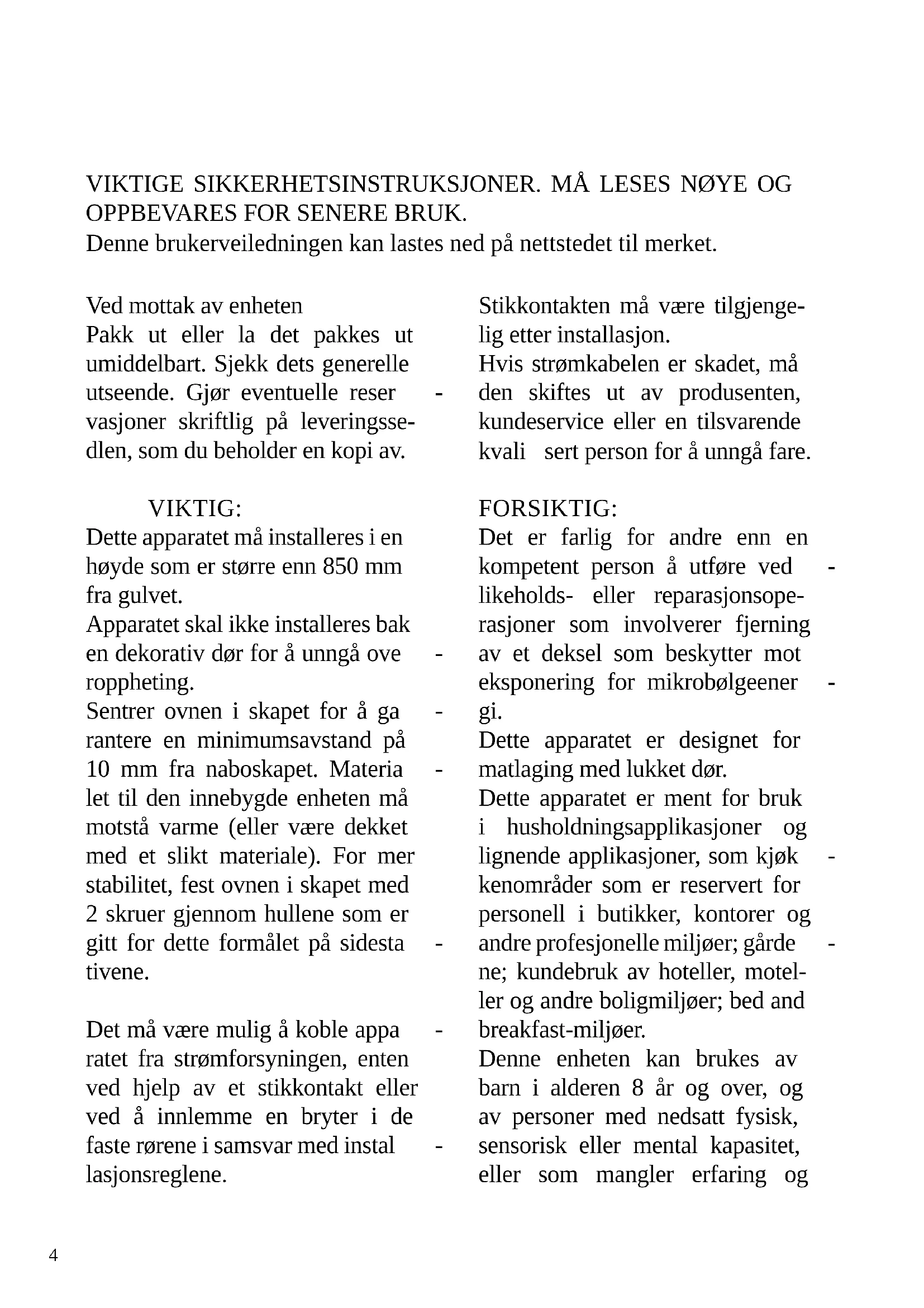 ne; kundebruk av hoteller, motel- ler og andre boligmiljøer; bed and breakfast-miljøer. Denne enheten kan brukes av barn i alderen 8 år og over, og av personer med nedsatt fysisk, sensorisk eller mental kapasitet, eller som mangler erfaring og VIKTIGE SIKKERHETSINSTRUKSJONER. MÅ LESES NØYE OG OPPBEVARES FOR SENERE BRUK. Denne brukerveiledningen kan lastes ned på nettstedet til merket.5 SIKKERHETSINSTRUKSJONER SIKKERHETSINSTRUKSJONER kunnskap, hvis de har kunnet dra nytte av tilsyn eller instruksjoner. enheten og har forstått risikoen. Barn må ikke leke med enheten. Rengjøring og vedlikehold må ikke utføres av barn som er uten tilsyn. Barn bør overvåkes for å sikre at de ikke leker med enheten. FORSIKTIG: Enheten og dens tilgjengelige deler blir varme under bruk. Ikke ta på varmeelementene inne i ovnen. Barn under 8 år bør holdes borte med mindre de hele tiden er under oppsyn. Forsiktig: Hvis apparatet brukes i kombi