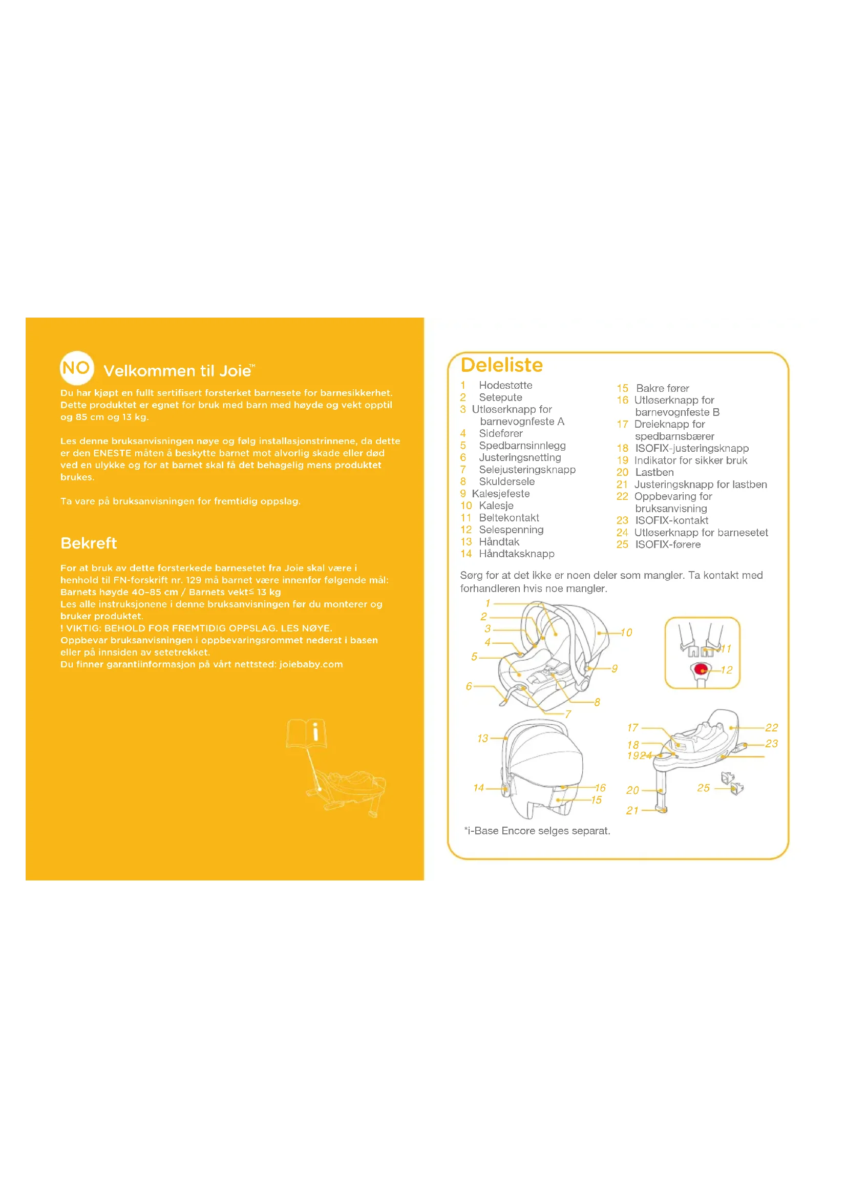 Du har kjøpt en fullt sertifisert forsterket barnesete for barnesikkerhet. Dette produktet er egnet for bruk med barn med høyde og vekt opptil og 85cm og 13kg.Les denne bruksanvisningen nøye og følg installasjonstrinnene﹐ da dette er den ENESTE måten å beskytte barnet mot alvorlig skade eller død ved en ulykke og for at barnet skal få det behagelig mens produktet brukes.Ta vare på bruksanvisningen for fremtidig oppslag. Bekreft For at bruk av dette forsterkede barnesetet fra Joie skal være i henhold til FN-forskrift nr. 129 må barnet være innenfor følgende mål:Barnets høyde 40–85cm / Barnets vekt 13kgLes alle instruksjonene i denne bruksanvisningen før du monterer og bruker produktet.! VIKTIG: BEHOLD FOR FREMTIDIG OPPSLAG. LES NØYE.Oppbevar bruksanvisningen i oppbevaringsrommet nederst i basen eller på innsiden av setetrekket.Du finner garantiinformasjon på vårt nettsted: joiebaby.comSørg for at det ikke er noen deler som mangler. Ta kontakt med forhandleren hvis noe mangler.1 Hodestøtte2 Setepute3 Utløserknapp for barnevognfeste A4 Sidefører5 Spedbarnsinnlegg6 Justeringsnetting7 Selejusteringsknapp8 Skuldersele9 Kalesjefeste10 Kalesje11 Beltekontakt12 Selespenning13 Håndtak14 Håndtaksknapp Deleliste 15 Bakre fører16 Utløserknapp for barnevognfeste B17 Dreieknapp for spedbarnsbærer18 ISOFIX-justeringsknapp19 Indikator for sikker bruk20 Lastben21 Justeringsknapp for lastben22 Oppbevaring for bruksanvisning23 ISOFIX-kontakt24 Utløserknapp for barnesetet25 ISOFIX-førere*i-Base Encore selges separat.
