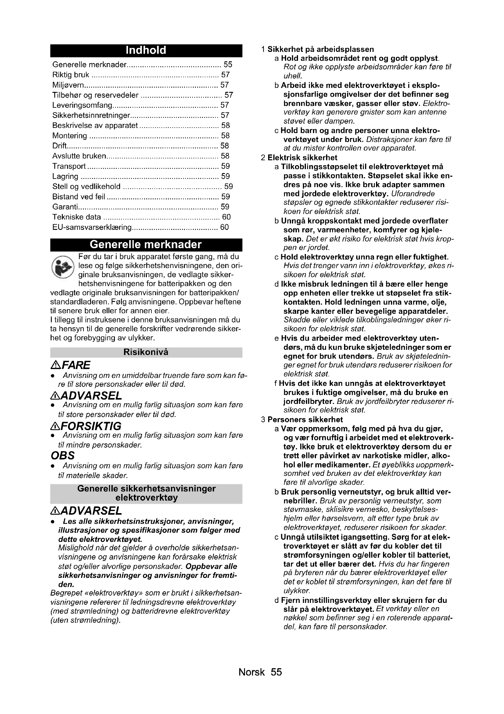 • EN IEC 63000: 2018 Underskriverne handler på bestyrelsens vegne og med dennes fuldmagt. Dokumentationsbefuldmægtiget: S. Reiser Alfred Kärcher SE & Co. KG Alfred-Kärcher-Str. 28 - 40 71364 Winnenden (Germany) Tlf.: +49 7195 14-0 Fax: +49 7195 14-2212 Winnenden, 2023/04/01Norsk 55 Indhold Generelle merknader Før du tar i bruk apparatet første gang, må du lese og følge sikkerhetshenvisningene, den ori- ginale bruksanvisningen, de vedlagte sikker- hetshenvisningene for batteripakken og den vedlagte originale bruksanvisningen for batteripakken/ standardladeren. Følg anvisningene. Oppbevar heftene til senere bruk eller for annen eier. I tillegg til instruksene i denne bruksanvisningen må du ta hensyn til de generelle forskrifter vedrørende sikker- het og forebygging av ulykker. Risikonivå FARE ● Anvisning om en umiddelbar truende fare som kan fø- re til store personskader eller til død. 몇 ADVARSEL ● Anvisning om en mulig farlig situasjon som kan føre til store personskader eller til død. 몇 FORSIKTIG ● Anvisning om en mulig farlig situasjon som kan føre til mindre personskader. OBS ● Anvisning om en mulig farlig situasjon som kan føre til materielle skader. Generelle sikkerhetsanvisninger elektroverktøy 몇 ADVARSEL ● Les alle sikkerhetsinstruksjoner, anvisninger, illustrasjoner og spesifikasjoner som følger med dette elektroverktøyet. Mislighold når det gjelder å overholde sikkerhetsan- visningene og anvisningene kan forårsake elektrisk støt og/eller alvorlige personskader. Oppbevar alle sikkerhetsanvisninger og anvisninger for fremti- den. Begrepet «elektroverktøy» som er brukt i sikkerhetsan- visningene refererer til ledningsdrevne elektroverktøy (med strømledning) og batteridrevne elektroverktøy (uten strømledning). 1 Sikkerhet på arbeidsplassen a Hold arbeidsområdet rent og godt opplyst. Rot og ikke opplyste arbeidsområder kan føre til uhell. b Arbeid ikke med elektroverktøyet i eksplo- sjonsfarlige omgivelser der det befinner seg brennbare væsker, gasser eller støv. Elektro- verktøy kan generere gnister som kan antenne støvet eller dampen. c Hold barn og andre personer unna elektro- verktøyet under bruk. Distraksjoner kan føre til at du mister kontrollen over apparatet. 2 Elektrisk sikkerhet a Tilkoblingsstøpselet til elektroverktøyet må passe i stikkontakten. Støpselet skal ikke en- dres på noe vis. Ikke bruk adapter sammen med jordede elektroverktøy. Uforandrede støpsler og egnede stikkontakter reduserer risi- koen for elektrisk støt. b Unngå kroppskontakt med jordede overflater som rør, varmeenheter, komfyrer og kjøle- skap. Det er økt risiko for elektrisk støt hvis krop- pen er jordet. c Hold elektroverktøy unna regn eller fuktighet. Hvis det trenger vann inn i elektroverktøy, økes ri- sikoen for elektrisk støt. d Ikke misbruk ledningen til å bære eller henge opp enheten eller trekke ut støpselet fra stik- kontakten. Hold ledningen unna varme, olje, skarpe kanter eller bevegelige apparatdeler. Skadde eller viklede tilkoblingsledninger øker ri- sikoen for elektrisk støt. e Hvis du arbeider med elektroverktøy uten- dørs, må du kun bruke skjøteledninger som er egnet for bruk utendørs. Bruk av skjøtelednin- ger egnet for bruk utendørs reduserer risikoen for elektrisk støt. f Hvis det ikke kan unngås at elektroverktøyet brukes i fuktige omgivelser, må du bruke en jordfeilbryter. Bruk av jordfeilbryter reduserer ri- sikoen for elektrisk støt. 3 Personers sikkerhet a Vær oppmerksom, følg med på hva du gjør, og vær fornuftig i arbeidet med et elektroverk- tøy. Ikke bruk et elektroverktøy dersom du er trøtt eller påvirket av narkotiske midler, alko- hol eller medikamenter. Et øyeblikks uoppmerk- somhet ved bruken av det elektroverktøy kan føre til alvorlige skader. b Bruk personlig verneutstyr, og bruk alltid ver- nebriller. Bruk av personlig verneutstyr, som støvmaske, sklisikre vernesko, beskyttelses- hjelm eller hørselsvern, alt etter type bruk av elektroverktøyet, reduserer risikoen for skader. c Unngå utilsiktet igangsetting. Sørg for at elek- troverktøyet er slått av før du kobler det til strømforsyningen og/eller kobler til batteriet, tar det ut eller bærer det. Hvis du har fingeren på bryteren når du bærer elektroverktøyet eller det er koblet til strømforsyningen, kan det føre til ulykker. d Fjern innstillingsverktøy eller skrujern før du slår på elektroverktøyet. Et verktøy eller en nøkkel som befinner seg i en roterende apparat- del, kan føre til personskader. Generelle merknader p. 55