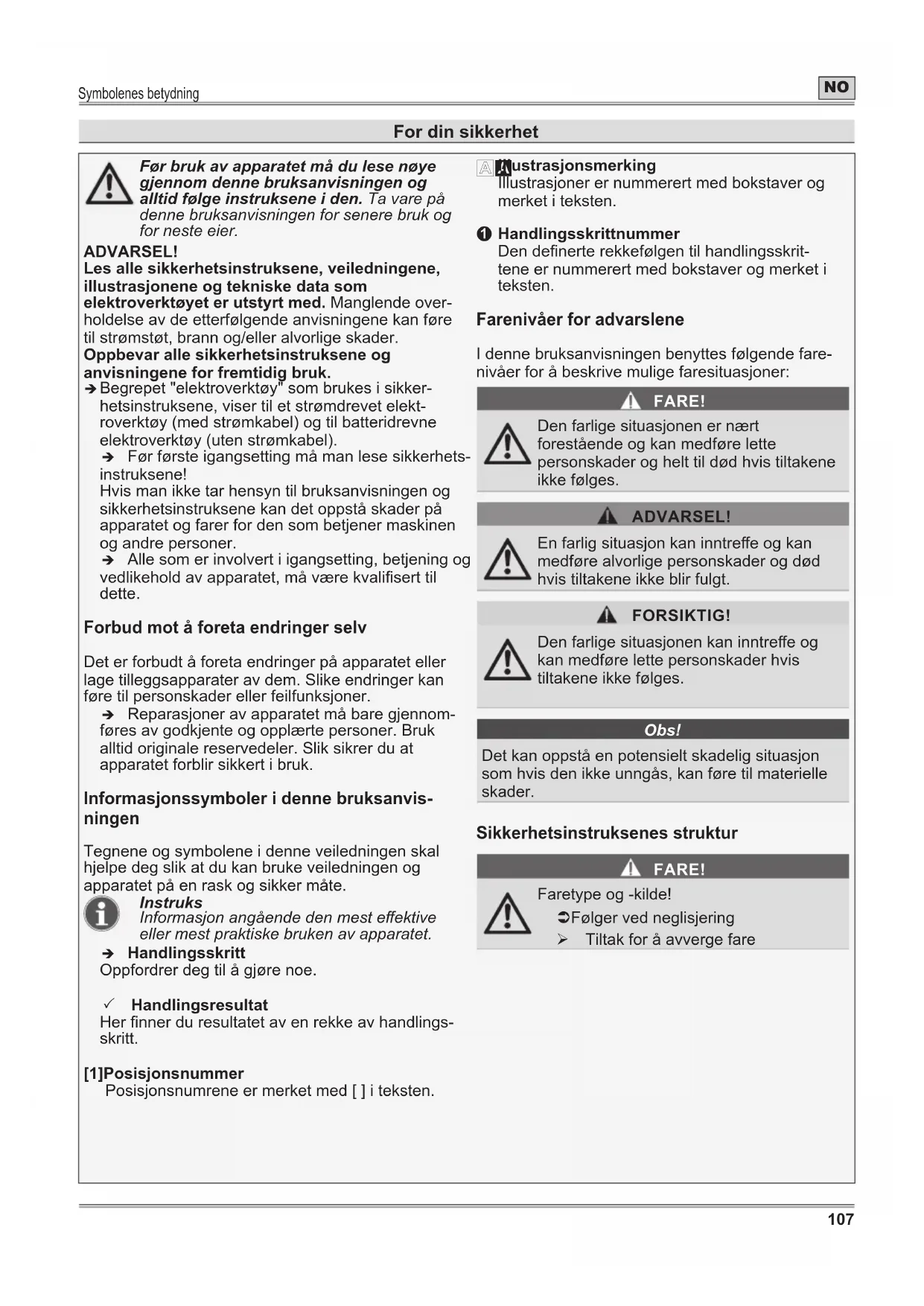 Handlingsskrittnummer Den denerte rekkefølgen til handlingsskrit- tene er nummerert med bokstaver og merket i teksten. Farenivåer for advarslene I denne bruksanvisningen benyttes følgende fare- nivåer for å beskrive mulige faresituasjoner: FARE! Den farlige situasjonen er nært forestående og kan medføre lette personskader og helt til død hvis tiltakene ikke følges. ADVARSEL! En farlig situasjon kan inntree og kan medføre alvorlige personskader og død hvis tiltakene ikke blir fulgt. FORSIKTIG! Den farlige situasjonen kan inntree og kan medføre lette personskader hvis tiltakene ikke følges. Obs! Det kan oppstå en potensielt skadelig situasjon som hvis den ikke unngås, kan føre til materielle skader. Sikkerhetsinstruksenes struktur FARE! Faretype og -kilde! ÂFølger ved neglisjering ¾ Tiltak for å avverge fareSikkerhetsinstrukser