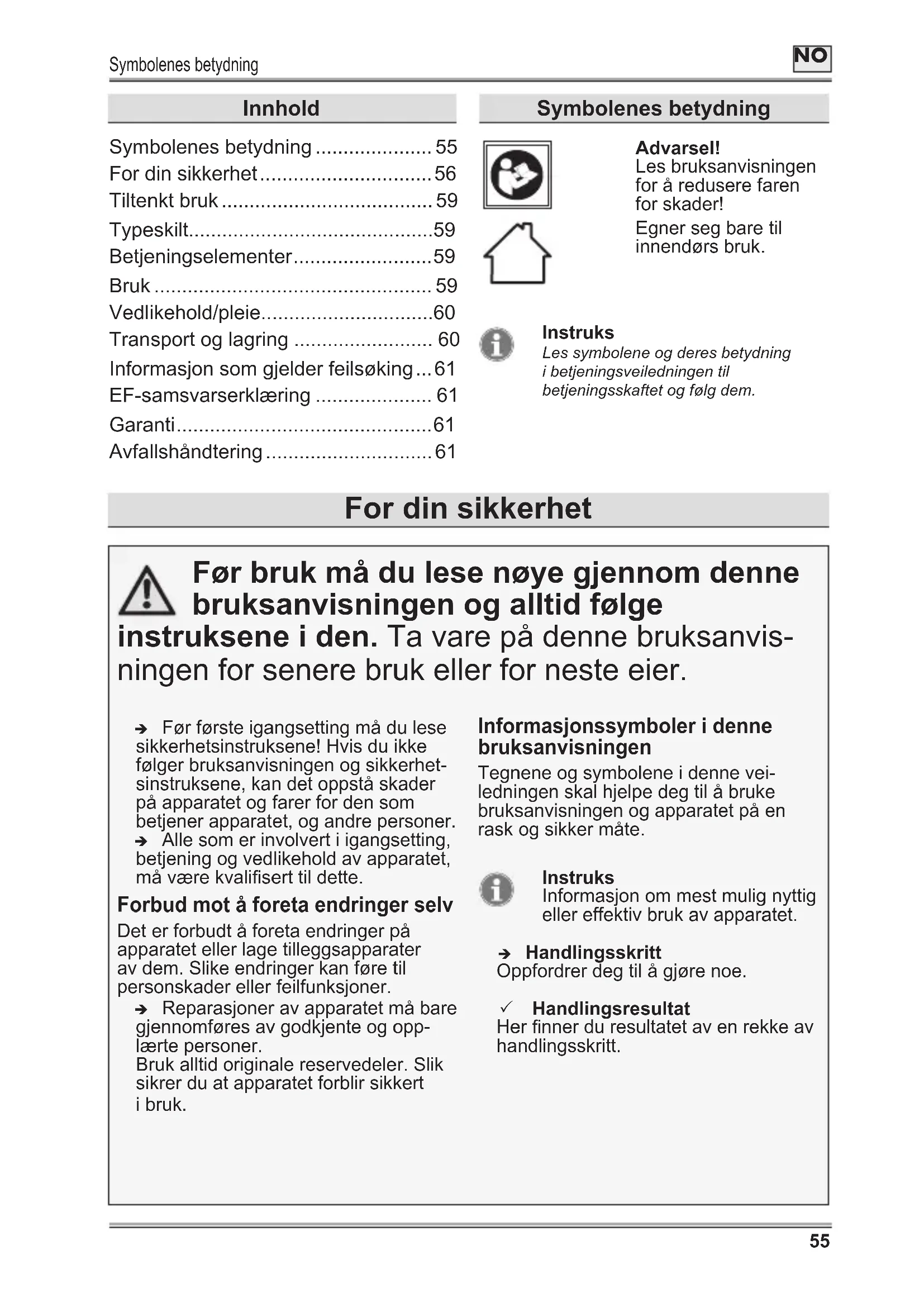 - Avfallshåndtering Symbolenes betydning For din sikkerhet Før bruk må du lese nøye gjennom denne bruksanvisningen og alltid følge instruksene i den. Ta vare på denne bruksanvis- ningen for senere bruk eller for neste eier. Î Før første igangsetting må du lese sikkerhetsinstruksene! Hvis du ikke følger bruksanvisningen og sikkerhet- sinstruksene, kan det oppstå skader på apparatet og farer for den som betjener apparatet, og andre personer. Î Alle som er involvert i igangsetting, betjening og vedlikehold av apparatet, må være kvalisert til dette. Forbud mot å foreta endringer selv Det er forbudt å foreta endringer på apparatet eller lage tilleggsapparater av dem. Slike endringer kan føre til personskader eller feilfunksjoner. Î Reparasjoner av apparatet må bare gjennomføres av godkjente og opp- lærte personer. Bruk alltid originale reservedeler. Slik sikrer du at apparatet forblir sikkert i bruk. Informasjonssymboler i denne bruksanvisningen Tegnene og symbolene i denne vei- ledningen skal hjelpe deg til å bruke bruksanvisningen og apparatet på en rask og sikker måte. Instruks Informasjon om mest mulig nyttig eller effektiv bruk av apparatet. Î Handlingsskritt Oppfordrer deg til å gjøre noe. 3 Handlingsresultat Her nner du resultatet av en rekke av handlingsskritt. Advarsel! Les bruksanvisningen for å redusere faren for skader! Egner seg bare til innendørs bruk. Instruks Les symbolene og deres betydning i betjeningsveiledningen til betjeningsskaftet og følg dem.For din sikkerhet p. 61