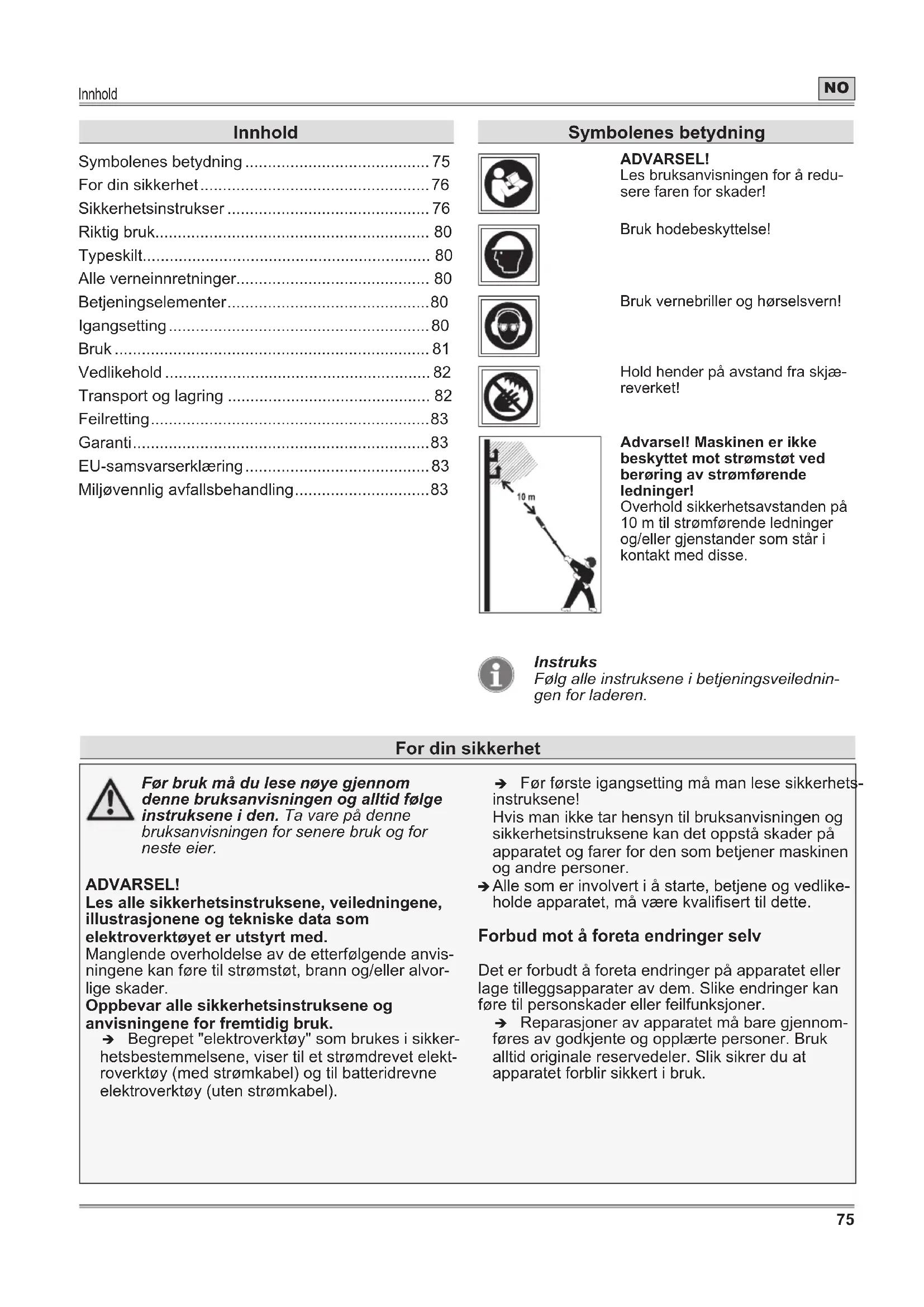 - Miljøvennlig avfallsbehandling Symbolenes betydning ADVARSEL! Les bruksanvisningen for å redu- sere faren for skader! Bruk hodebeskyttelse! Bruk vernebriller og hørselsvern! Hold hender på avstand fra skjæ- reverket! Advarsel! Maskinen er ikke beskyttet mot strømstøt ved berøring av strømførende ledninger! Overhold sikkerhetsavstanden på 10 m til strømførende ledninger og/eller gjenstander som står i kontakt med disse. Instruks Følg alle instruksene i betjeningsveilednin- gen for laderen. For din sikkerhet Før bruk må du lese nøye gjennom denne bruksanvisningen og alltid følge instruksene i den. Ta vare på denne bruksanvisningen for senere bruk og for neste eier. ADVARSEL! Les alle sikkerhetsinstruksene, veiledningene, illustrasjonene og tekniske data som elektroverktøyet er utstyrt med. Manglende overholdelse av de etterfølgende anvis- ningene kan føre til strømstøt, brann og/eller alvor- lige skader. Oppbevar alle sikkerhetsinstruksene og anvisningene for fremtidig bruk. Î Begrepet "elektroverktøy" som brukes i sikker- hetsbestemmelsene, viser til et strømdrevet elekt- roverktøy (med strømkabel) og til batteridrevne elektroverktøy (uten strømkabel). Î Før første igangsetting må man lese sikkerhets- instruksene! Hvis man ikke tar hensyn til bruksanvisningen og sikkerhetsinstruksene kan det oppstå skader på apparatet og farer for den som betjener maskinen og andre personer. Î Alle som er involvert i å starte, betjene og vedlike- holde apparatet, må være kvalisert til dette. Forbud mot å foreta endringer selv Det er forbudt å foreta endringer på apparatet eller lage tilleggsapparater av dem. Slike endringer kan føre til personskader eller feilfunksjoner. Î Reparasjoner av apparatet må bare gjennom- føres av godkjente og opplærte personer. Bruk alltid originale reservedeler. Slik sikrer du at apparatet forblir sikkert i bruk.For din sikkerhet p. 83