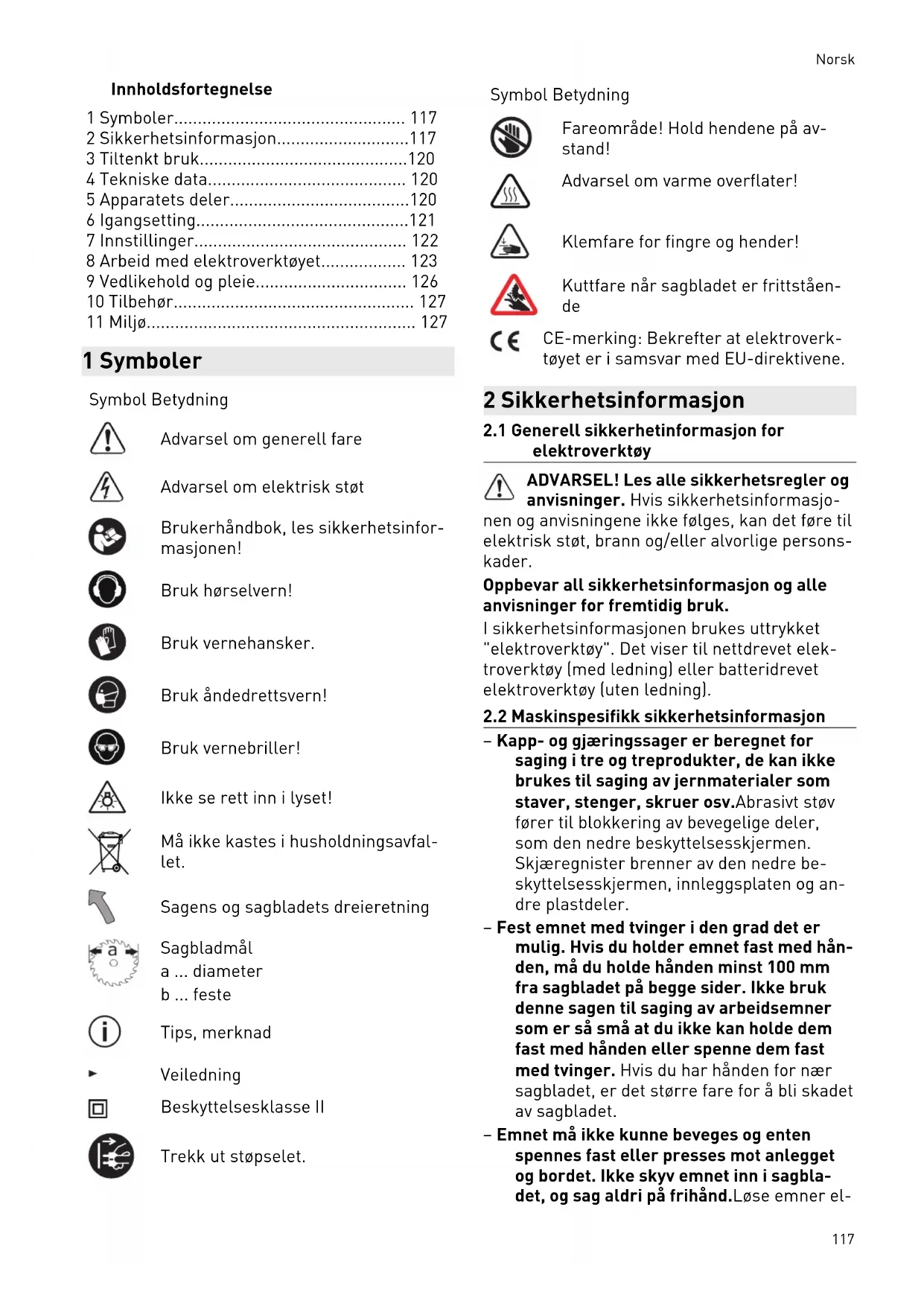 = 100 dB(A) Usikkerhet K = 3 dB FORSIKTIG Støy under arbeidet Hørselsskadelig ► Bruk hørselvern. De angitte støyemisjonsverdiene – er målt iht. standardiserte testprosedyrer og kan brukes til sammenligning av for skjellige elektroverktøy. – kan også brukes til en foreløpig vurdering av belastningen. Norsk 119FORSIKTIG Støyemisjonen kan – avhengig av måten elektroverktøyet brukes på, spesielt hvilken type emne som bearbeides – avvike fra de opplyste verdiene under den faktiske bruken av elektroverktøyet. ► For å beskytte brukeren må det fastsettes sikkerhetstiltak på grunnlag av en vurde ring av belastningen under de faktiske bruksbetingelsene. (Det må tas hensyn til alle deler av driftssyklusen, for eksempel tider hvor elektroverktøyet var slått av og tider hvor det var slått på, men gikk uten belastning). 3 Tiltenkt bruk Elektroverktøyet er beregnet til bruk som sta sjonært apparat til saging av treverk, plast, alu miniumsprofiler og lignende materialer. Andre materialer, spesielt stål, betong og mineralske materialer, skal ikke bearbeides. Bruk bare Festool-sagblader som er beregnet til bruk sammen med dette elektroverktøyet. Sagbladene må ha følgende tekniske spesifika sjoner: – Sagbladdiameter 216 mm – Skjærebredde 2,3 mm (tilsvarer tannbred de) – Festehull 30 mm – Stambladtykkelse 1,6 mm – Sagblad i henhold til EN 847-1 – Sagblad med sponvinkel ≤ 0° – Egnet for turtall over 5000 o/min. Festool sagblader oppfyller kravene i EN 847-1. Sag bare i materialer som det aktuelle sagbla det er beregnet for. Dette elektroverktøyet skal bare brukes av fag folk og opplærte personer. Brukeren er selv ansvarlig for skader og ulykker som skyldes ikke-forskriftsmes sig bruk. 4 Tekniske data Trekk- og kappsag KS 60 E Effekt 1200 W Strømtilførsel 220-240 V~ 50-60 Hz Turtall (tomgang) 1300–3500 o/min Trekk- og kappsag KS 60 E Maks. turtall [10] 5000 o/min Maks. gjæringsvinkel 60° til venstre/høyre Maks. hellingsvinkel 47/46° til venstre/ høyre Sagbladmål 216 x 2,3 x 30 mm Vekt iht. EPTA-Proce dure 01:2014 17,8 kg 5 Apparatets deler [1-1] Håndtak [1-2] Sikkerhetsbryter [1-3] På/av-knapp [1-4] Spak for notdybdebegrensning [1-5] Dreieknapp for trekksperre [1-6] Spak for transportsperre Spindelstopp [1-8] Anleggslinjal (på begge sider) [1-9] Dreieknapper til festing av bordutvi delsen (på begge sider) [1-10] Vinkelskala for gjæringssnitt [1-11] Spak for låsing av gjæringsvinkelen [1-12] Dreiebord [1-13] Pendelverneskjerm [2-1] Kabelklemme [2-2] Avsughette [2-3] Av/på-bryter for sidelys (delvis tilbe hør) [2-4] Skrutvinge FSZ120 [2-5] Dreiebryter for turtallsinnstilling [2-6] Dreieknapp for festing av dreiebordet [2-7] Bordutvidelse (på begge sider) [2-8] Holder for vinkelmal [2-9] Stjernehåndtak for låsing av hellings vinkelen [2-10] Holder for unbrakonøkkel [2-11] Kabelopprulling med innebygd bære håndtak [10] Maks. turtall som kan oppstå ved feil på elektronikken. Norsk 120[3] Fjerning av transportsikringen [4] Isolerte gripeflater (område i grått) Bildene det henvises til, finnes foran og bak i bruksanvisningen. 6 Igangsetting