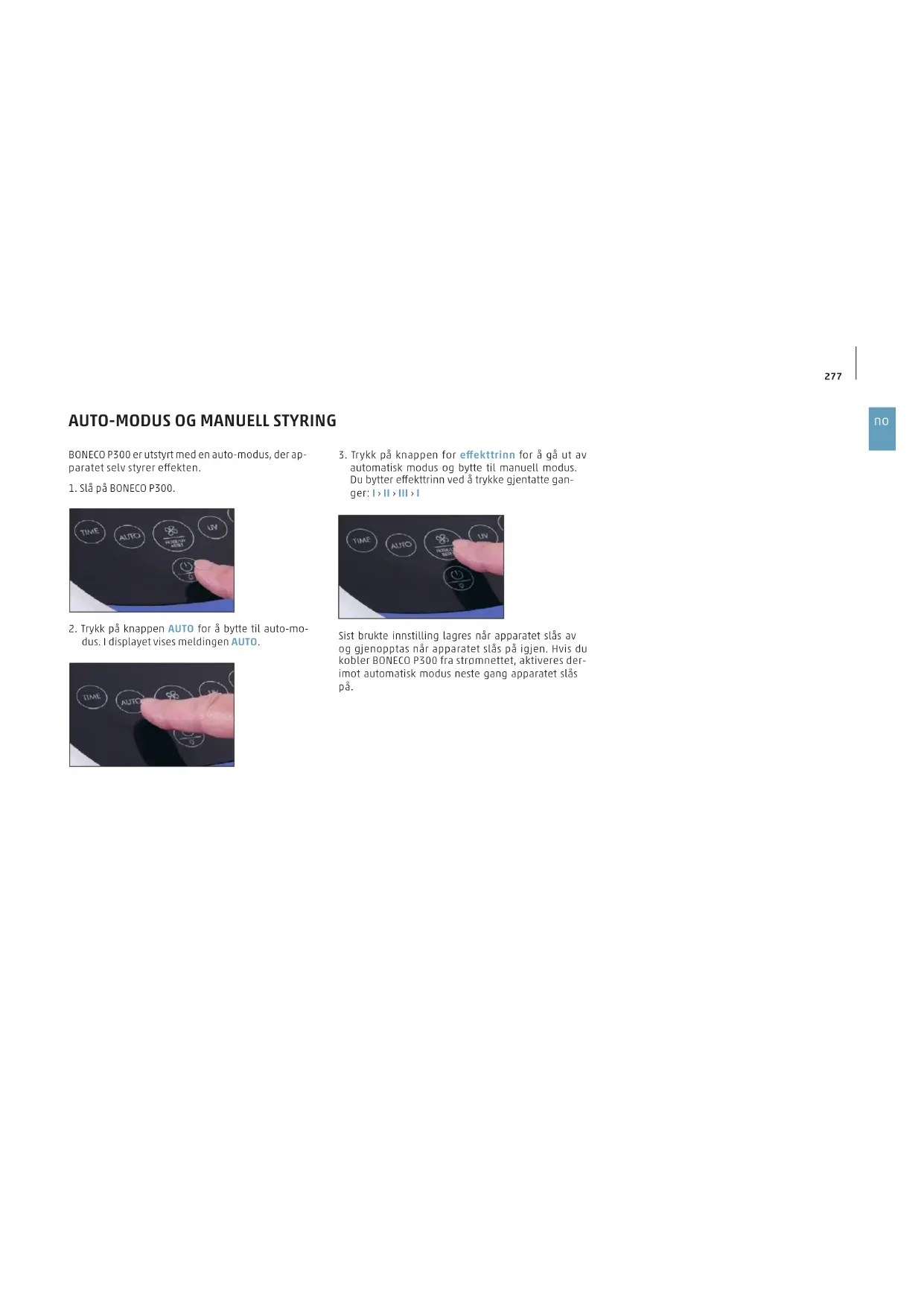 automatisk modus og bytte til manuell modus. Du bytter eekttrinn ved å trykke gjentatte gan- ger: I › II › III › I Sist brukte innstilling lagres når apparatet slås av og gjenopptas når apparatet slås på igjen. Hvis du kobler BONECO P300 fra strømnettet, aktiveres der- imot automatisk modus neste gang apparatet slås på. BONECO P300 er utstyrt med en auto-modus, der ap- paratet selv styrer eekten.