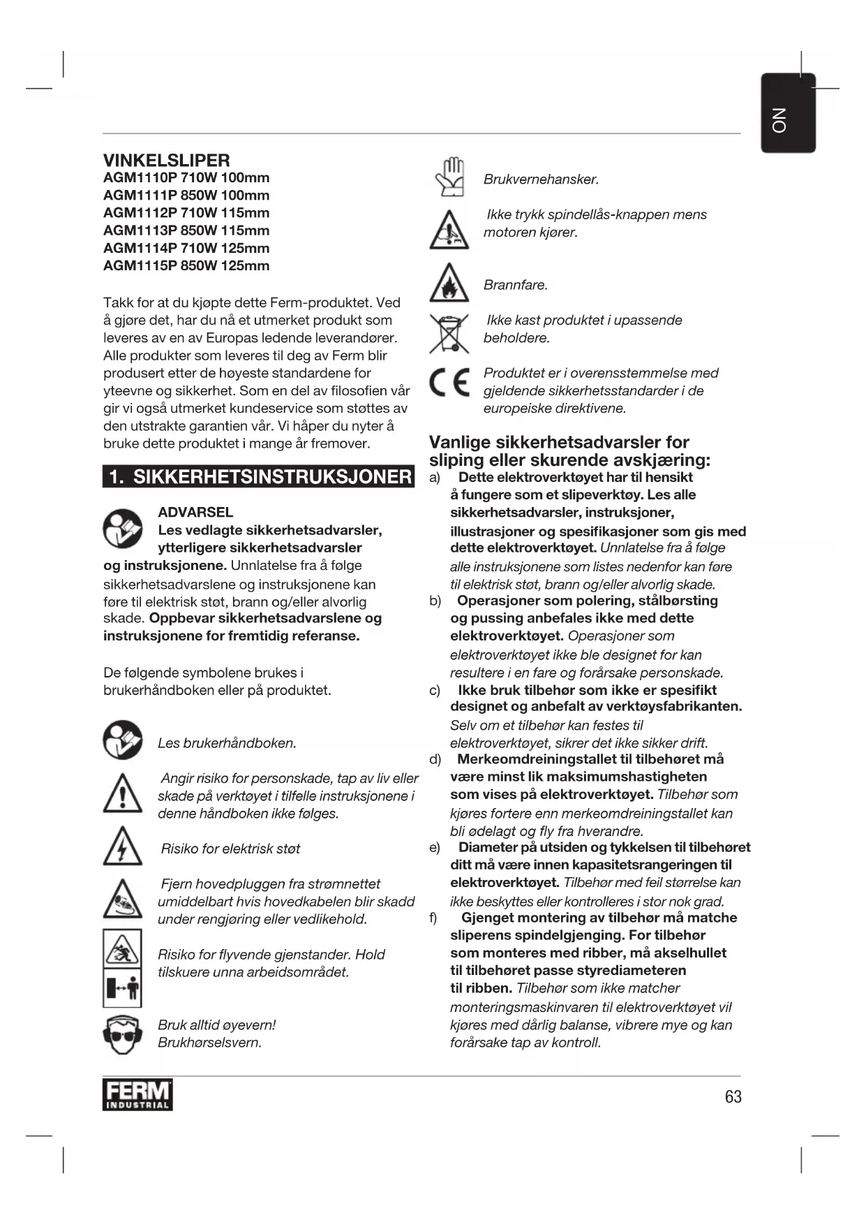 VINKELSLIPER AGM1110P 710W 100mm AGM1111P 850W 100mm AGM1112P 710W 115mm AGM1113P 850W 115mm AGM1114P 710W 125mm AGM1115P 850W 125mm Takk for at du kjøpte dette Ferm-produktet. Ved å gjøre det, har du nå et utmerket produkt som leveres av en av Europas ledende leverandører. Alle produkter som leveres til deg av Ferm blir produsert etter de høyeste standardene for yteevne og sikkerhet. Som en del av filosofien vår gir vi også utmerket kundeservice som støttes av den utstrakte garantien vår. Vi håper du nyter å bruke dette produktet i mange år fremover.