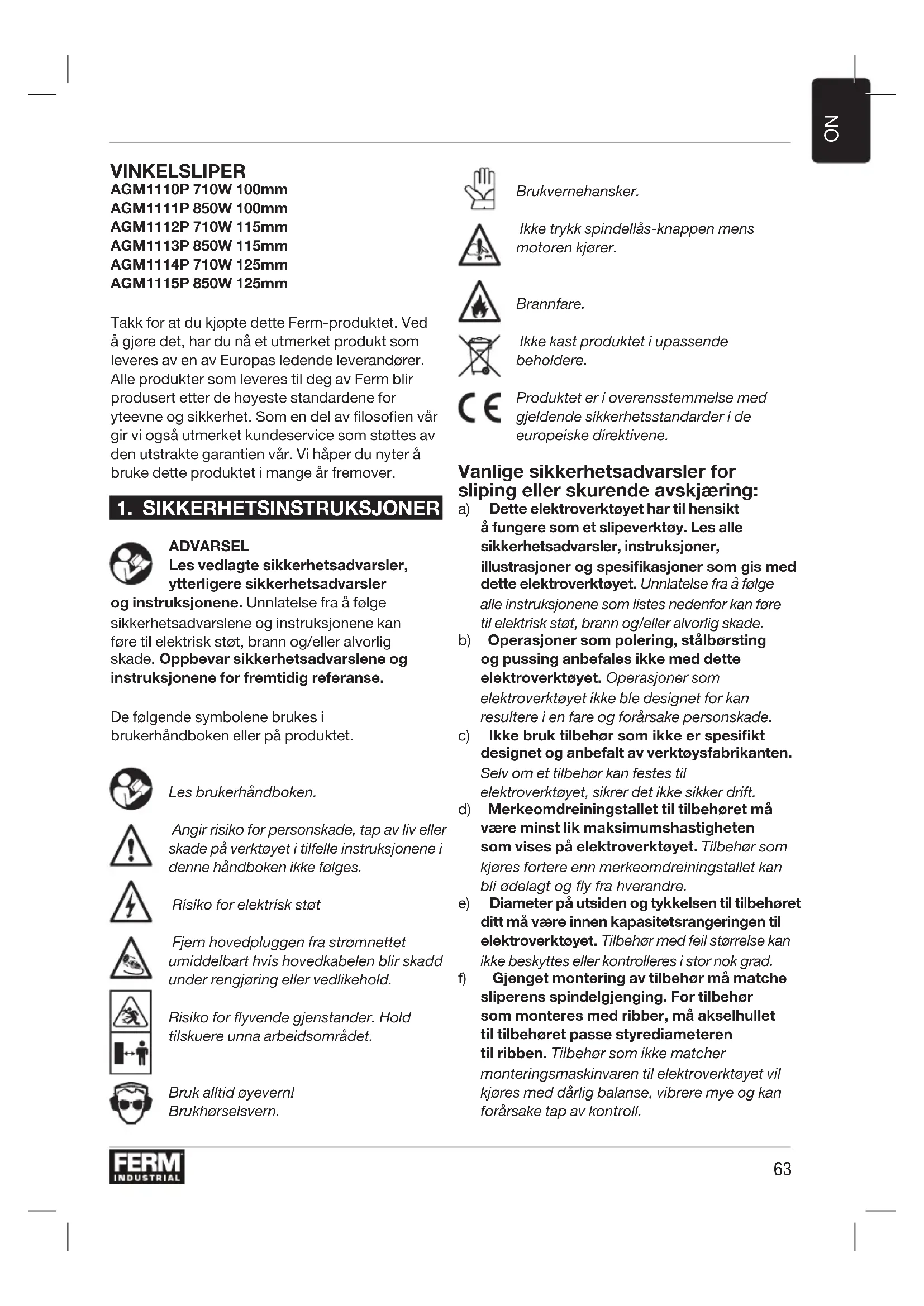 VINKELSLIPER AGM1110P 710W 100mm AGM1111P 850W 100mm AGM1112P 710W 115mm AGM1113P 850W 115mm AGM1114P 710W 125mm AGM1115P 850W 125mm Takk for at du kjøpte dette Ferm-produktet. Ved å gjøre det, har du nå et utmerket produkt som leveres av en av Europas ledende leverandører. Alle produkter som leveres til deg av Ferm blir produsert etter de høyeste standardene for yteevne og sikkerhet. Som en del av filosofien vår gir vi også utmerket kundeservice som støttes av den utstrakte garantien vår. Vi håper du nyter å bruke dette produktet i mange år fremover.